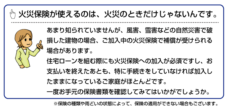その名称から、「火災のときしか使えない」 というイメージを持ってしまいがちな火災保険ですが、実は火災以外の風害や雪害による破損に対しても適用することができます。 大雪や台風のせいで破損してしまった雨どいは、正しく保険申請を行えば実負担0円で修理することもできるんです。
