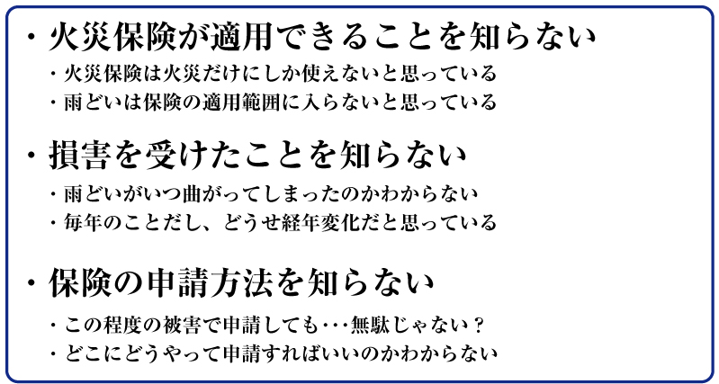 多くの方が加入している火災保険にこんなに便利な使い方があるのに、 なぜほとんどの方は保険を申請しないままにしているのでしょうか。 その理由は、このページをご覧の皆さんもお心当たりがあるのでは?