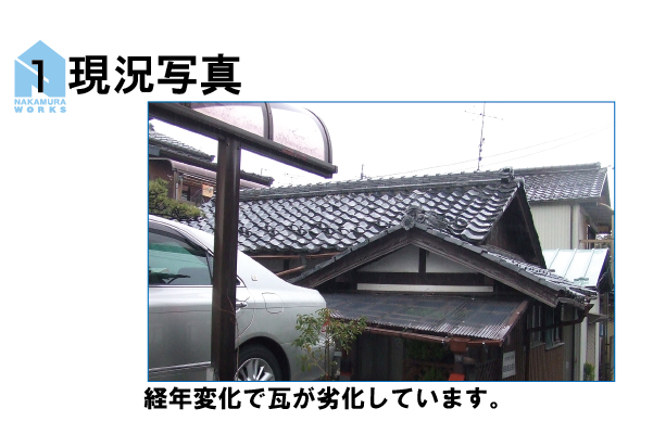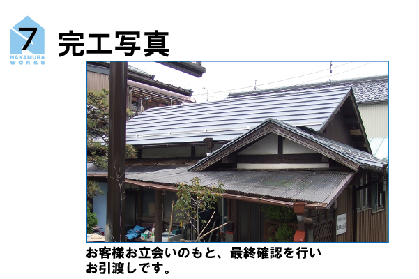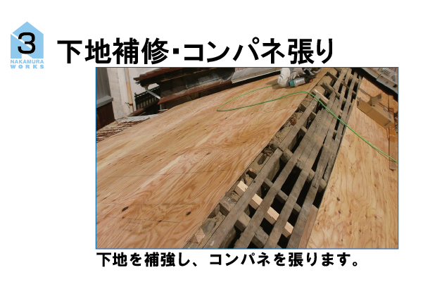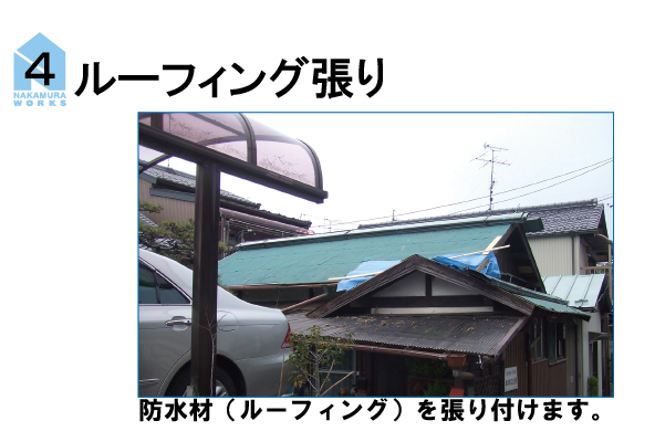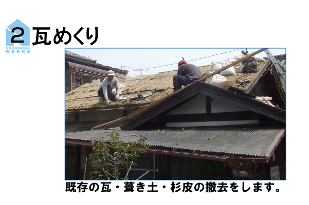 既存の瓦をめくり、金属屋根(エバールーフ)に葺き替える工事の手順です。