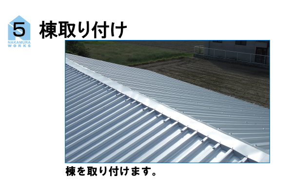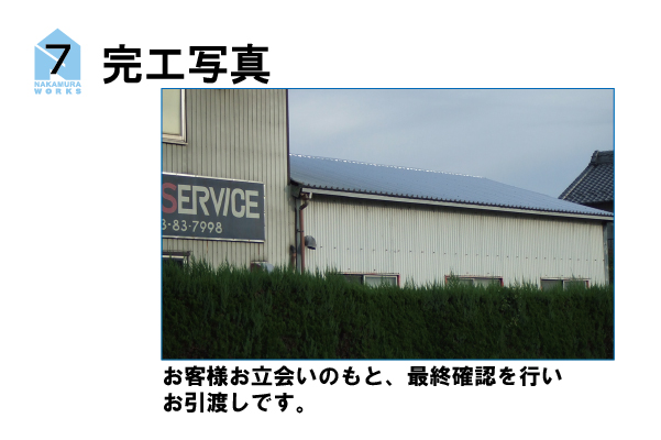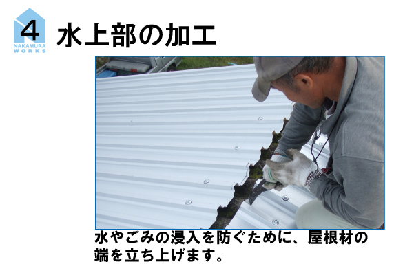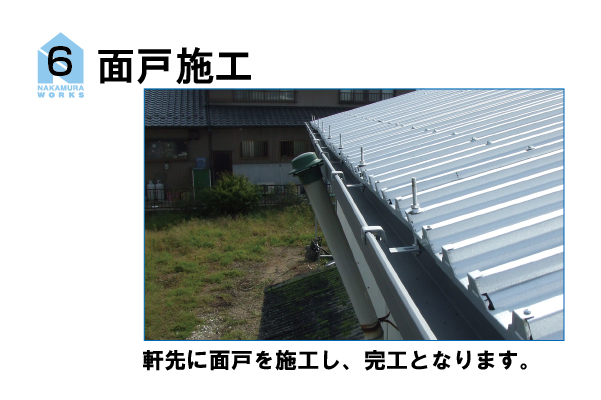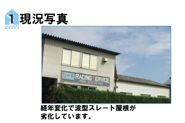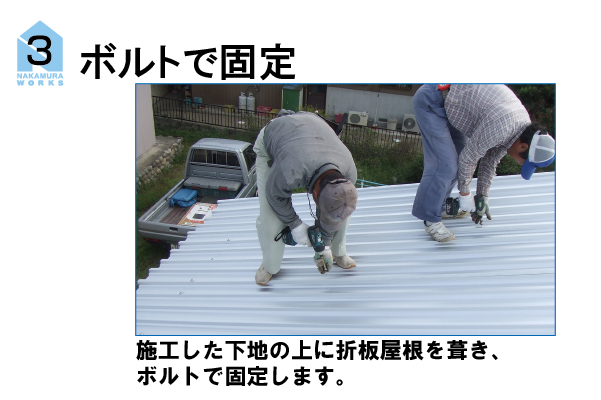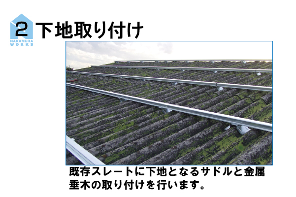既存の波スレートの上に金具を取り付け、金属屋根(折板)を張る工事の手順です。