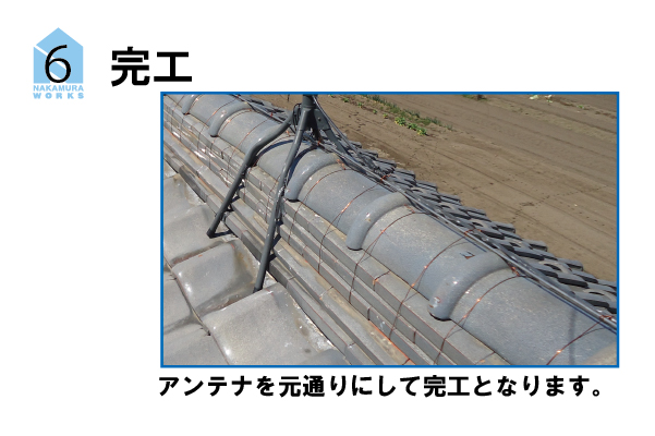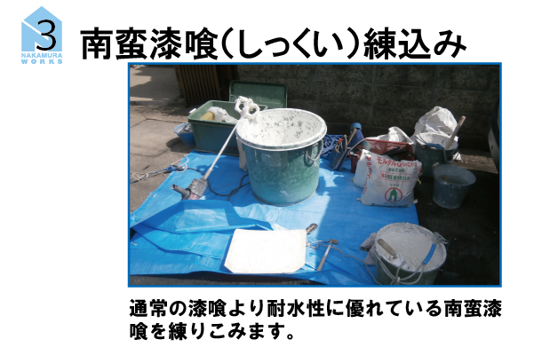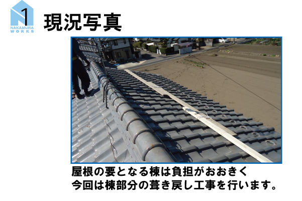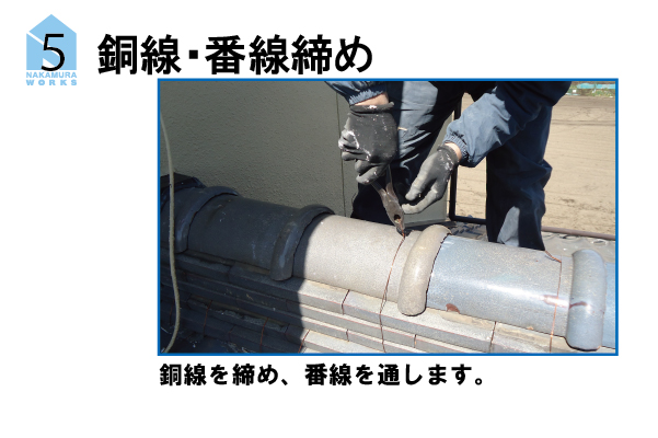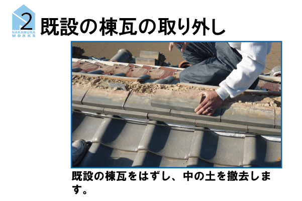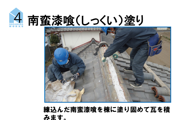 和瓦の棟部分の瓦を南蛮漆喰を使い、葺き戻す工事の手順です。