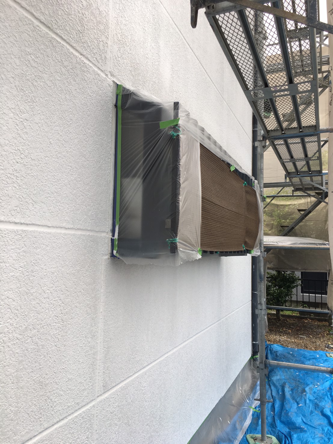 仮設;仮設足場架け払い・シート養生、2階ベランダテラス脱・着、