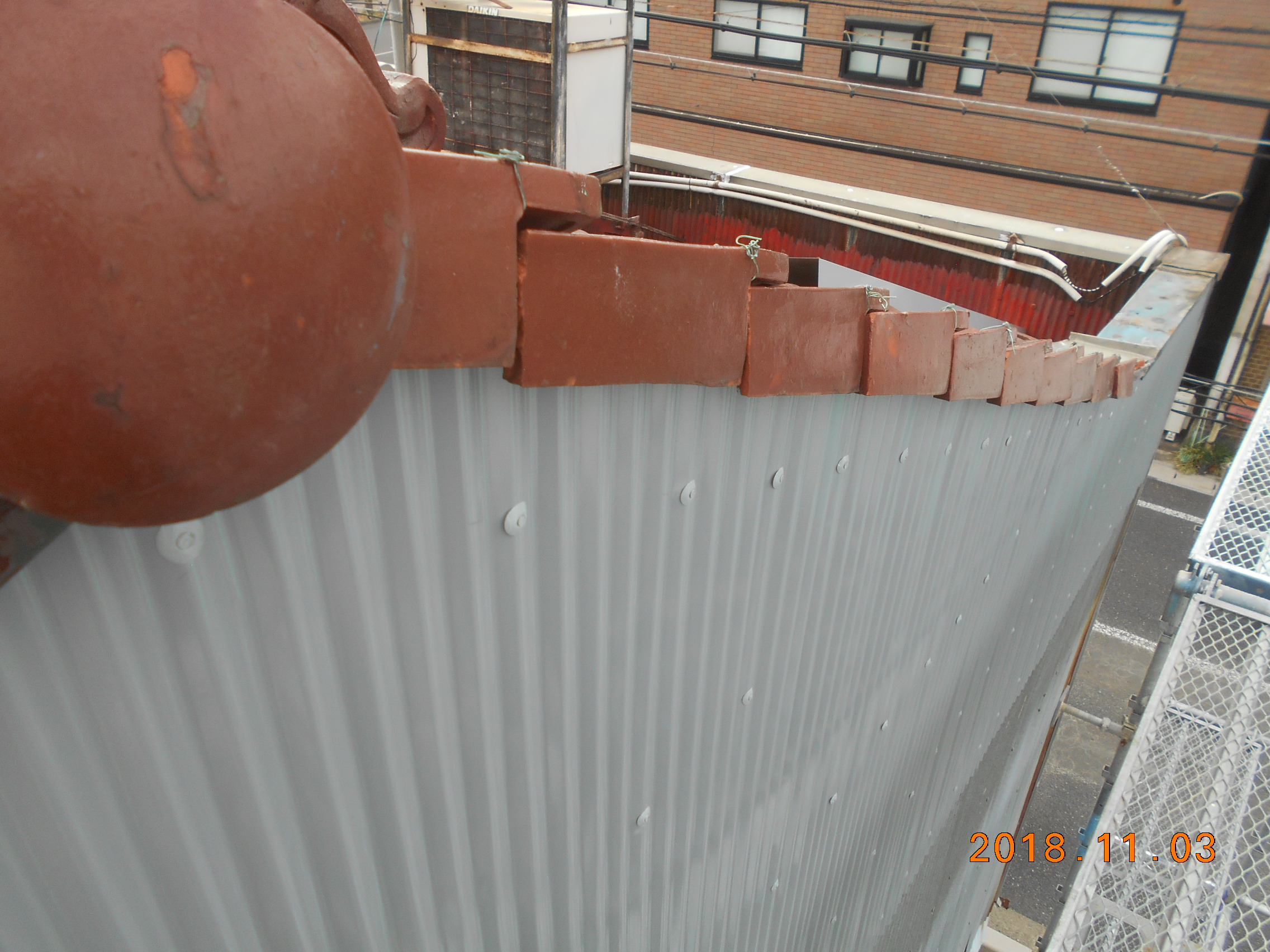 瓦工:北面4.7m 袖瓦葺き替え 材工共 1式 ※部分施工につき雨漏れ保証はしていません 物干し目隠し部 大工:目隠しビニールシート仮留め・無償工事 1式 諸費・諸経費 1式 ※上記ビニールシートは新品にて張替えしておきます。 ※切り込みを入れたビニールシートの劣化等責任は負いません。 ※目隠しビニールシート仮留め・ビニール下側1ヶ所、外壁部木下地に仮留めします。 仮留めの為、作業後の責任は負いません。 ※現状の目隠しビニールシートの木下地は物干しのL型鋼材に仮留めしてあり、強風にあおられれば木下地ごと引き抜かれそうな状態。 目隠しビニールシートに風抜け切り込みを入れさせて頂く事をお勧めします。