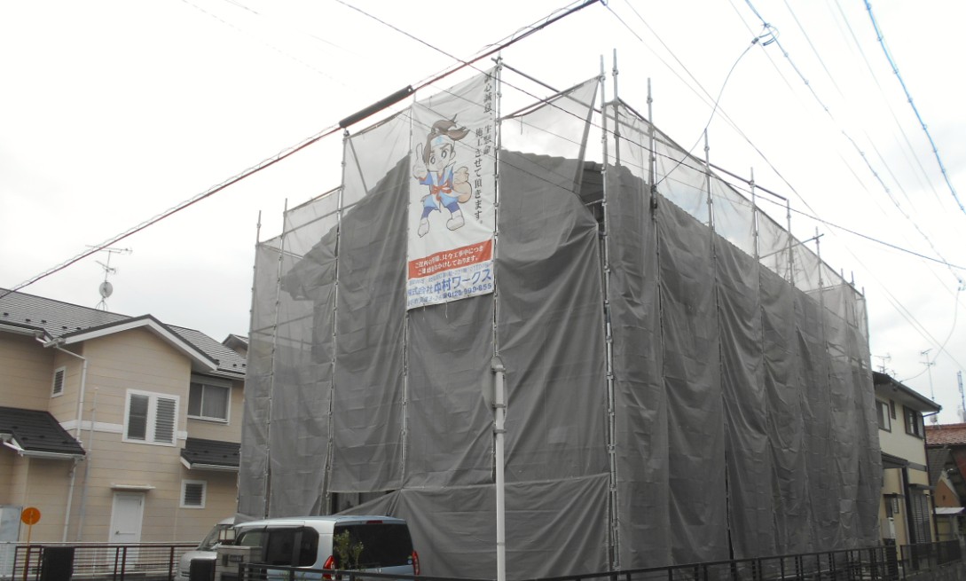 外壁塗装工事 仮設 仮設足場架け払い・シート養生 281.9㎡、西側テラスポリカ板脱着 1式、ベランダテラスポリカ板脱着 外壁 高圧洗浄 160.5㎡、下塗りシーラー 160.5㎡、中塗り無機シリコンハイブリッド塗料160.5㎡、上塗り無機シリコンハイブリッド塗料 160.5㎡、ニッペ ファインパーフェクトトップ 1液無機・シリコンハイブリッド塗料、シール コーキング 継部打ち替えオート化学 110.0m、コーキング 窓廻り増し打ちオート化学 66.0m、付帯 軒天ケンエース2回塗り 26.0㎡、軒樋 シリコン塗装 26.5m、たて樋 シリコン塗装 31.5m、鼻隠しシリコン塗装 26.5m、破風 シリコン塗装 26.0m、帯板 シリコン塗装 63.0m、戸箱・雨戸塗装 シリコン塗装 1式、大工 壁ボード反り補修 1式、板金・臭気たて樋の留め金具取替え 1式、諸費 諸経費 1式