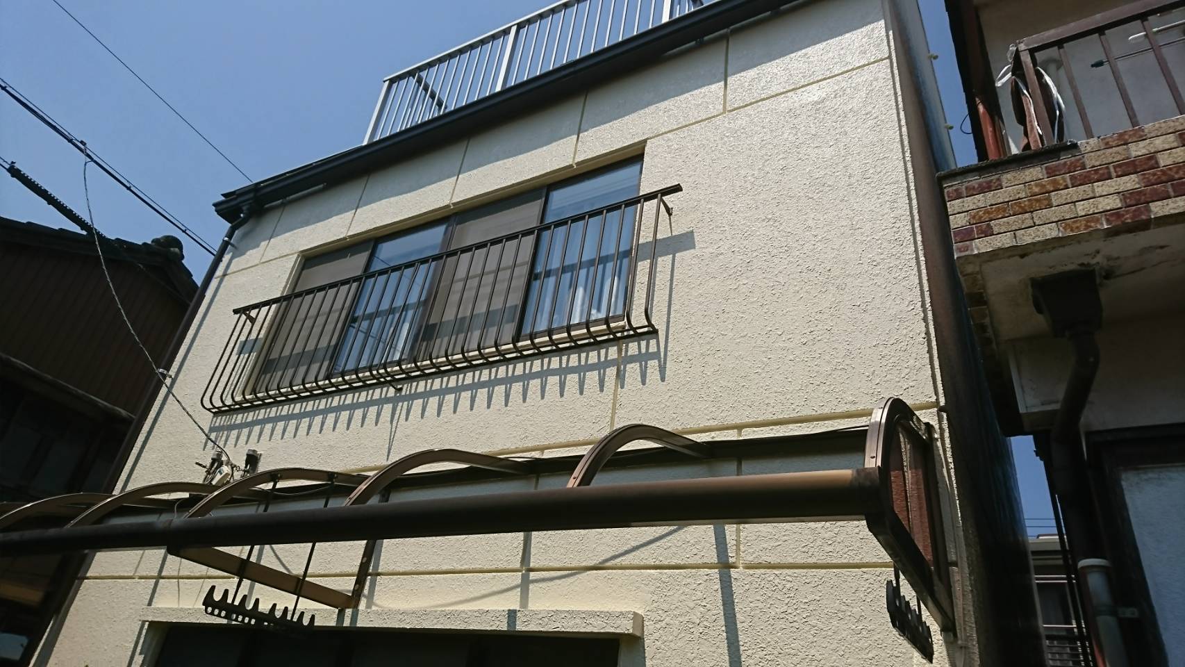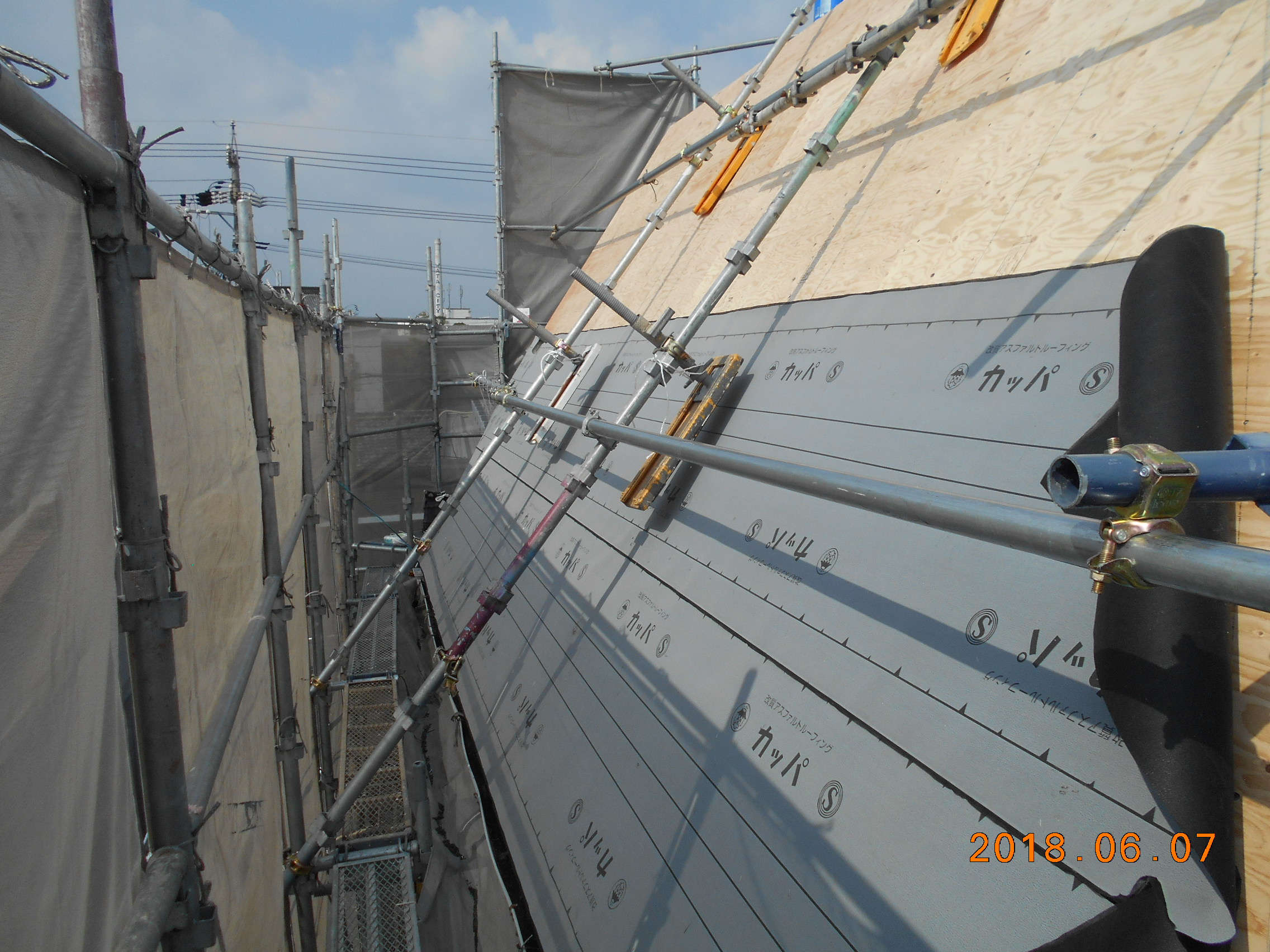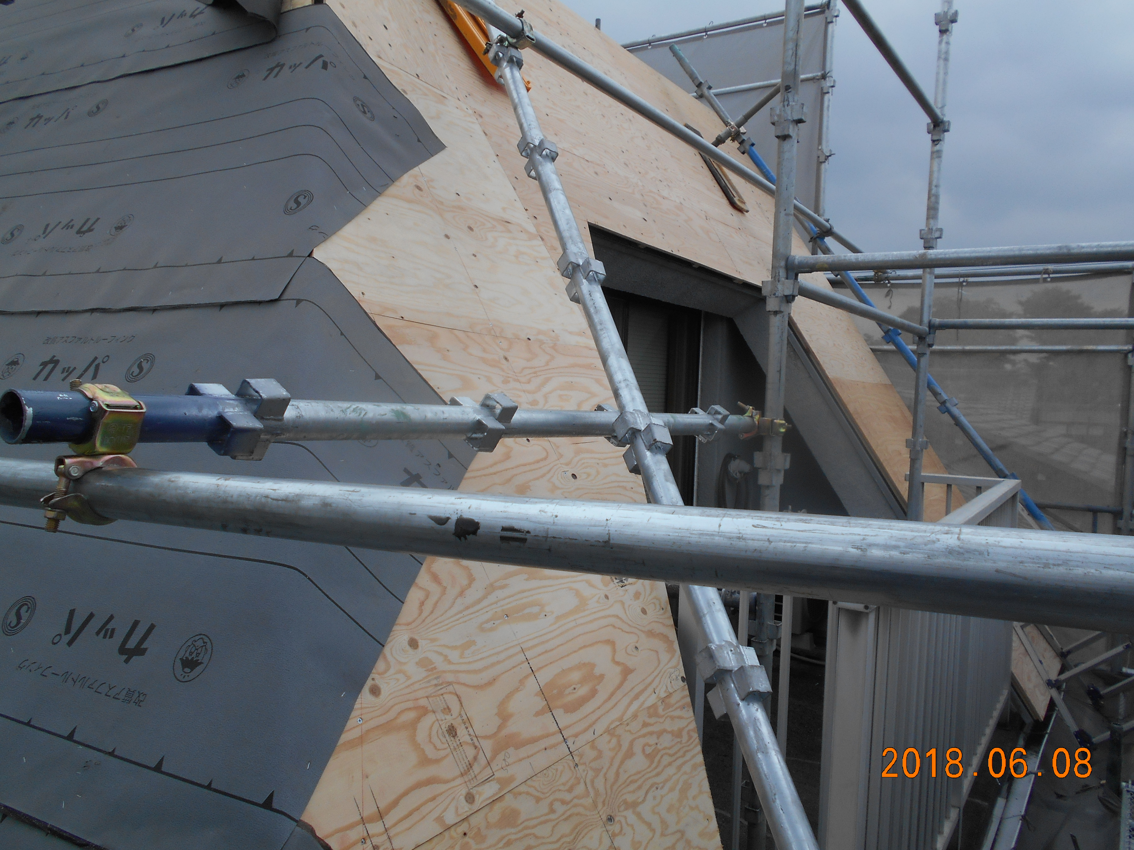 外壁塗装工事:仮設・仮設足場架け払いシート養生、屋根足場架け払い、テラス脱着、屋根・棟、役物撤去、コンパネ貼り、ルーフィング、横葺きATルーフ、棟(下木地込)、笠木(下地込)、外壁・高圧洗浄、下塗りフィラー、中塗り、上塗り、コーキング補修、樋・軒樋、たて樋、解体処分込、防水・防水面、コンパネ貼り、FRP防水、ベランダ部分軒樋架替え