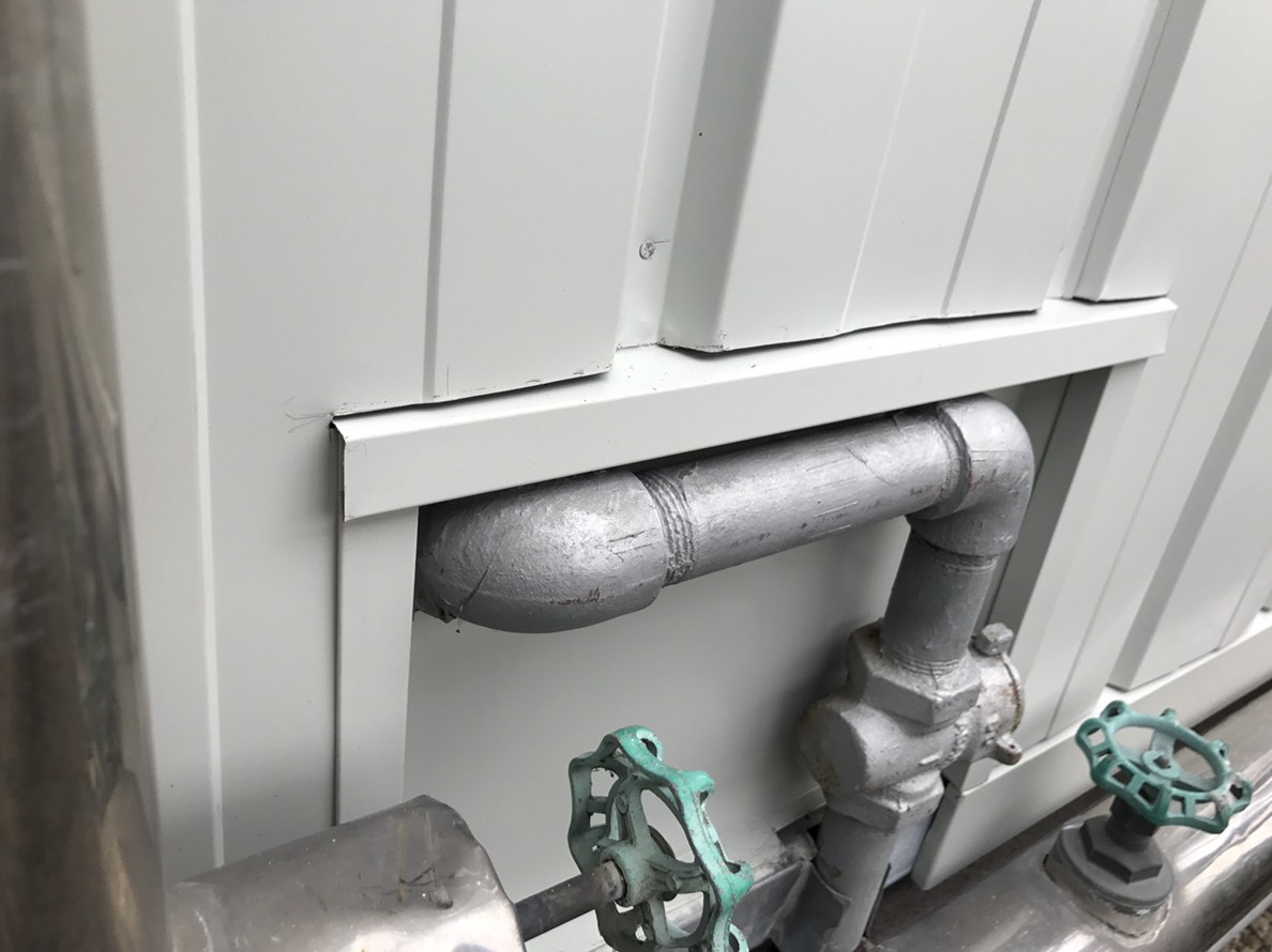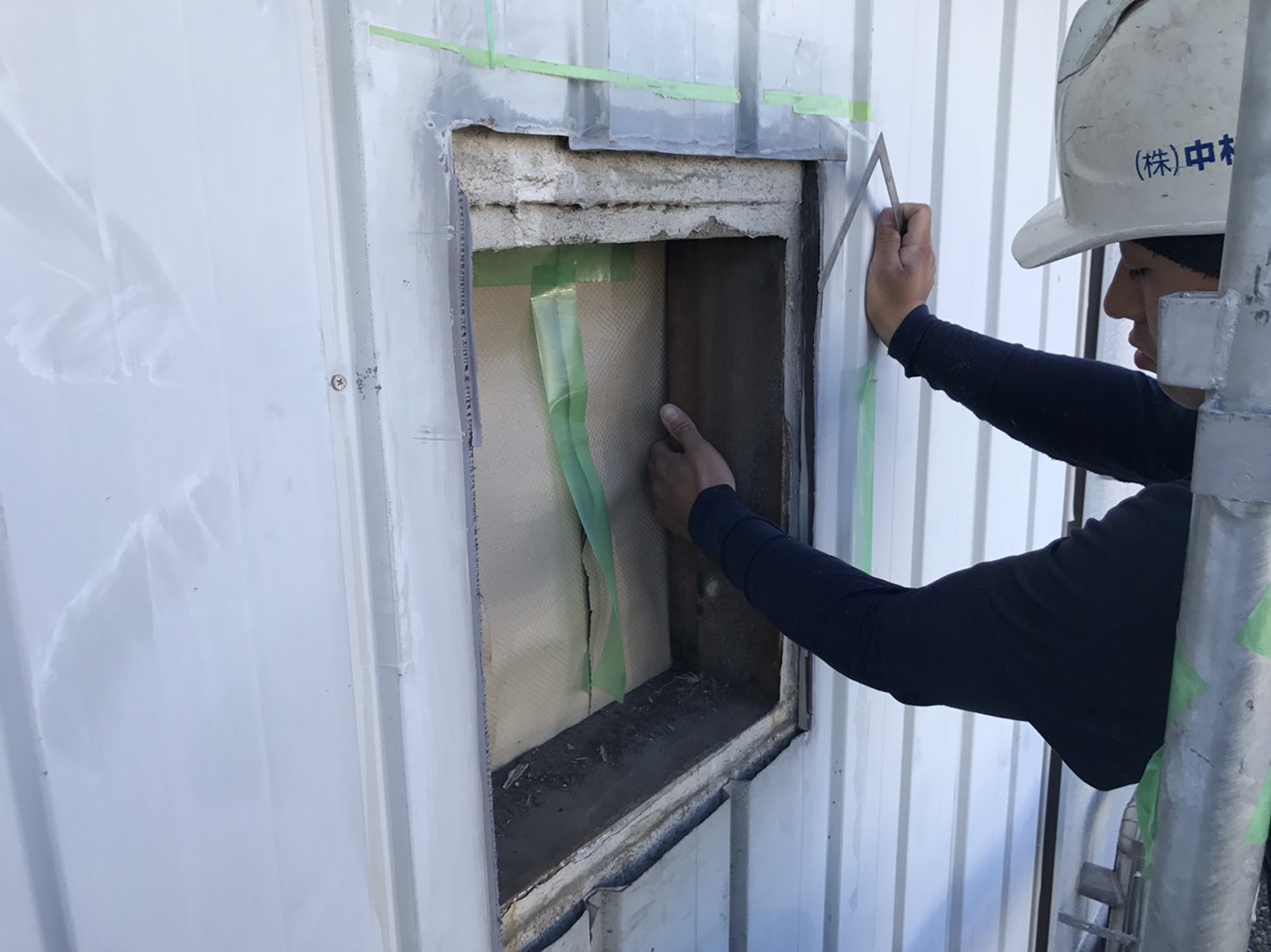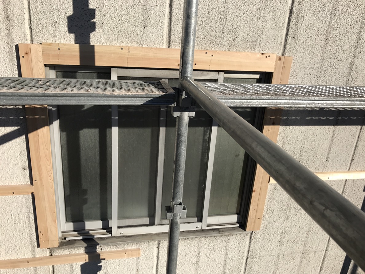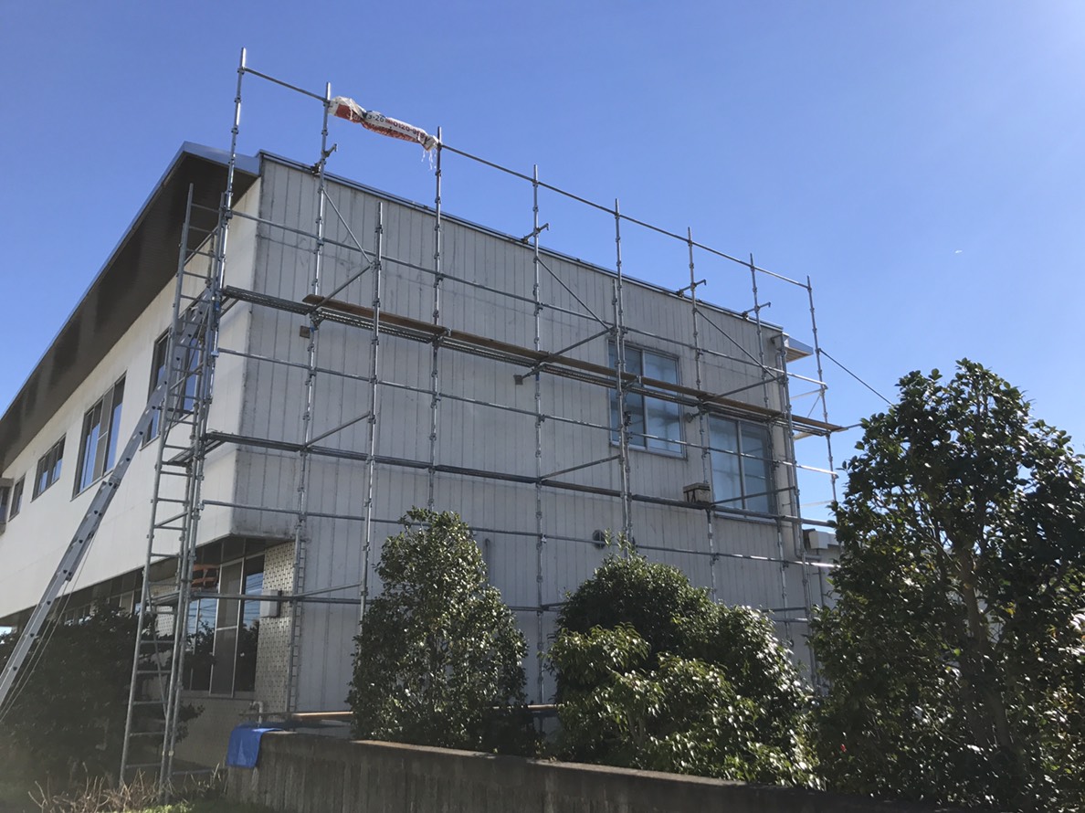 外壁張替工事 仮設 仮設足場架け払い・シート養生 1式 外壁 既設トタン捲り、処分 74.3㎡、下地胴縁工事 74.3㎡、角波張り2型(大型)ガルバリウム鋼板 74.3㎡、笠木 11.0m、土台水切り 10.0m、窓コーナー材 19.6m、フェンス塗装手間 材料支給 1式、開口部 補修 1式