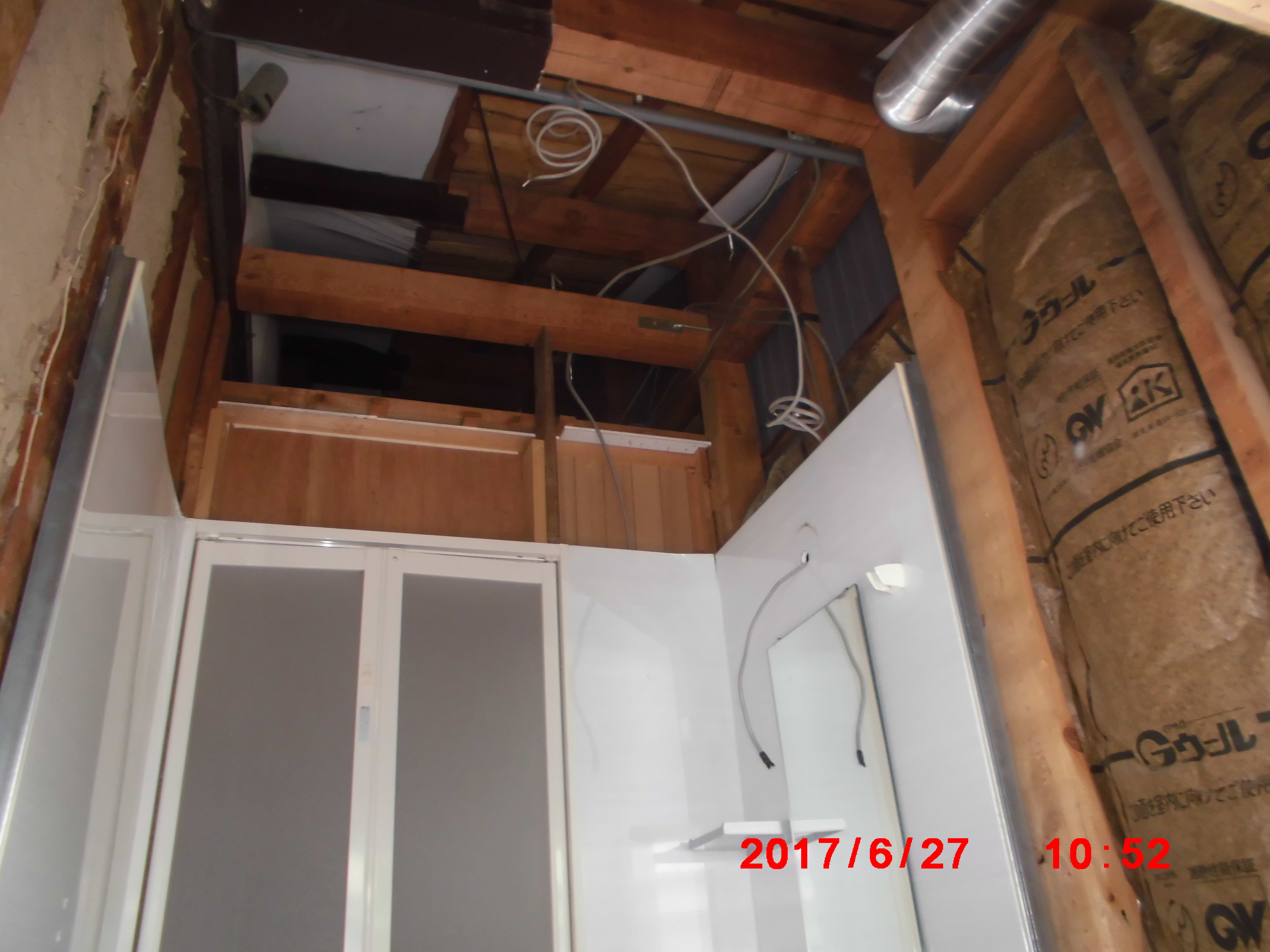 浴室工事 解体:既設浴室解体・撤去・処分【1式】 水道:給水給湯排水管工事【1式】 温水器繋ぎ込み工事単水栓共【1式】 電気:配線工事【1式】 浴室暖房換気乾燥機配線工事【1式】 子ブレーカー増設【1ヶ所】(露出配線) 造作:浴室出入口敷居工事【1式】 内装:浴室入口〜西面クロス貼替え【1式】 ボイラー脱着、水道工事対応【1式】 設備 浴室:リクシルシステムバスルームアライズ1216【1式】(組立施工費含) 浴室暖房換気乾燥機【1式】 諸費:搬入・搬出・養生・清掃等【1式】