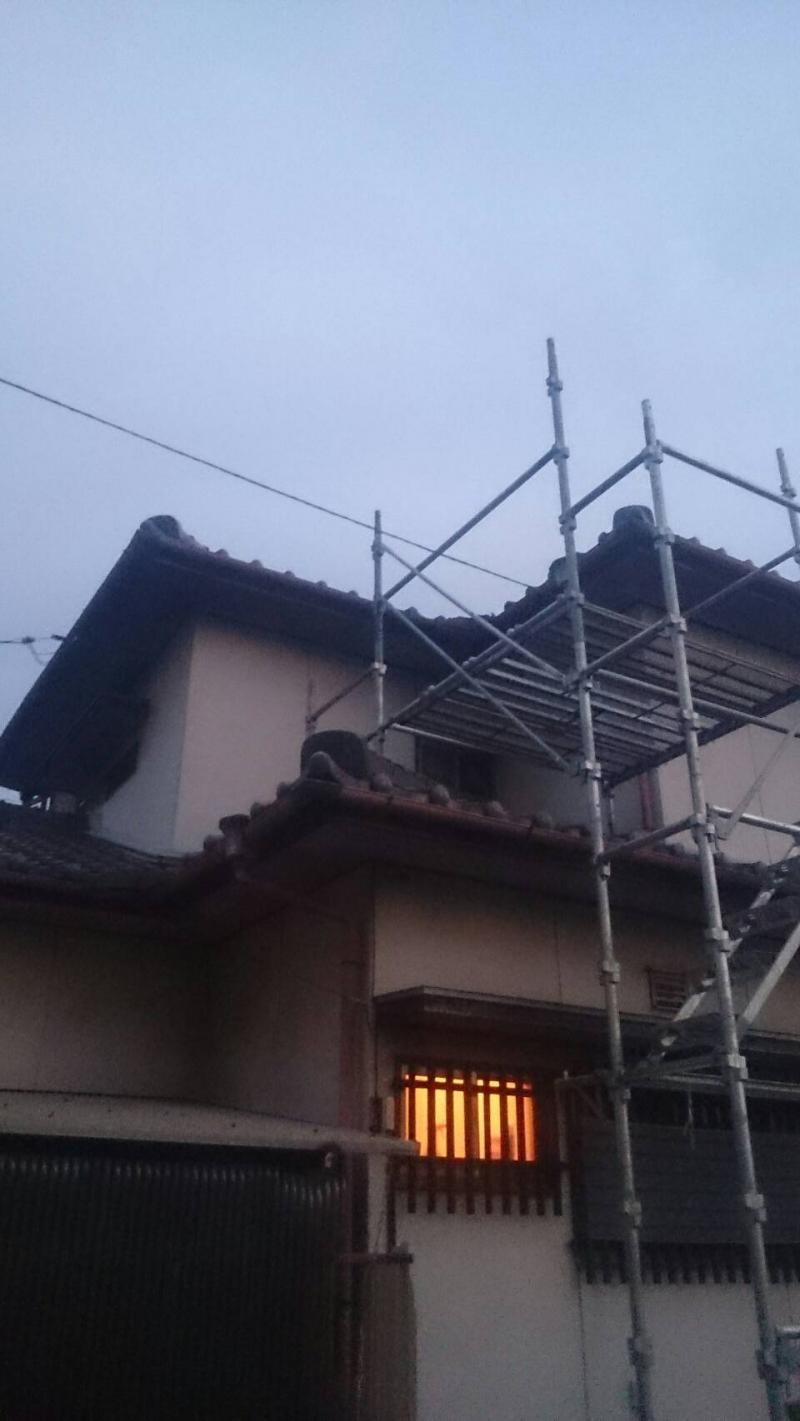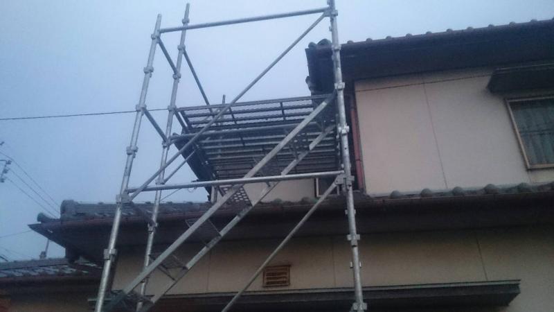 仮設足場架け払い【1式】 大屋根:谷ステン重ね葺き【3m程】 瓦めくり・瓦もどし 軒天化粧合板張替え【2m】 下屋根:谷ステン重ね葺き【2m程】