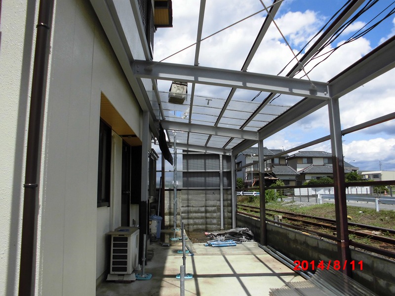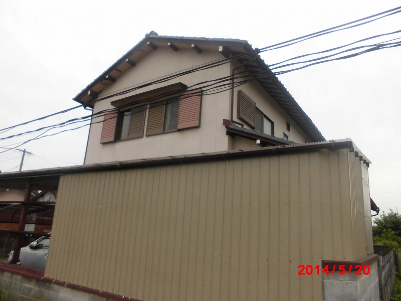外壁工事:仮設 仮設足場架け払い(1式) 既設ポリカ撤去、ポリカ新設【50.4メートル】 大工:軒天造作工事【60メートル 一式】 外壁:高圧洗浄【158平方メートル】 下塗りフィラー(サビ止め)【158平方メートル】 中塗りシリコン塗装【158平方メートル】 上塗りシリコン【158平方メートル】 雨戸(大ー8)(中-15)ウレタン塗装(1式) 破風 ウレタン塗装【25メートル】 駐車場 鉄部サビ止めウレタン塗装(1式) 玄関塗装(1式) 雨樋:既設雨樋撤去、処分【93.4メートル】 軒樋 半丸105(金具込み)【61.7メートル】 たて樋 60丸【32メートル】 集水器 5個 駐車場(東):トタン張替え 物置解体、処分 物置(西):木材処分 駐車場:鉄柱 土台固定 水切り張替えGL