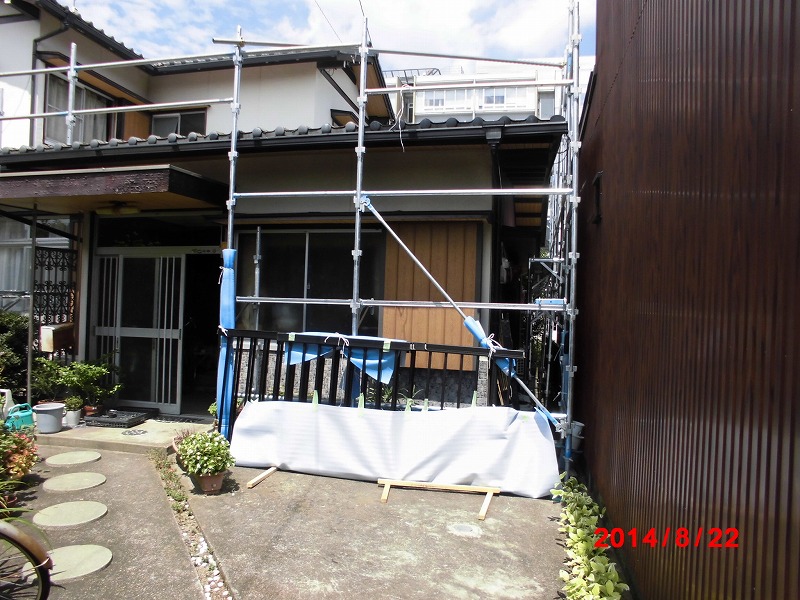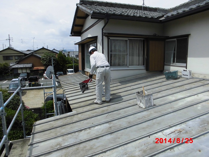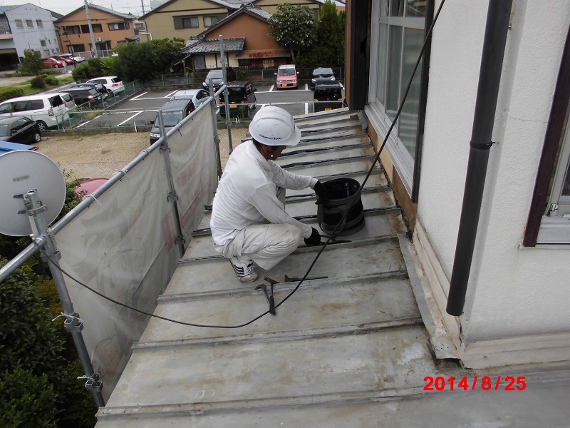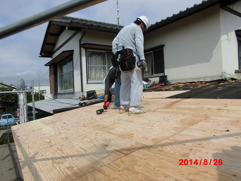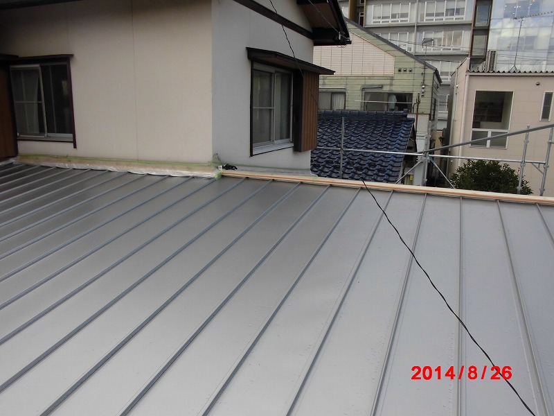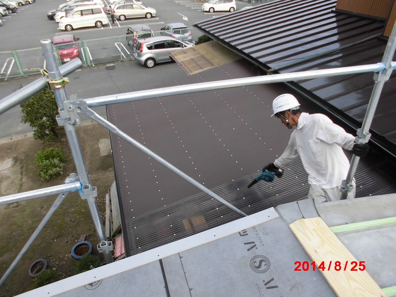 仮設足場架け払い 既設スレート瓦撤去処分 瓦棒撤去 下地コンパネ大工工事 ゴムアスルーフィング【95平方メートル】 たて平 GL 水切り【21メートル】 棟【4.5メートル】 ベランダ肌着(デッキ材新設)