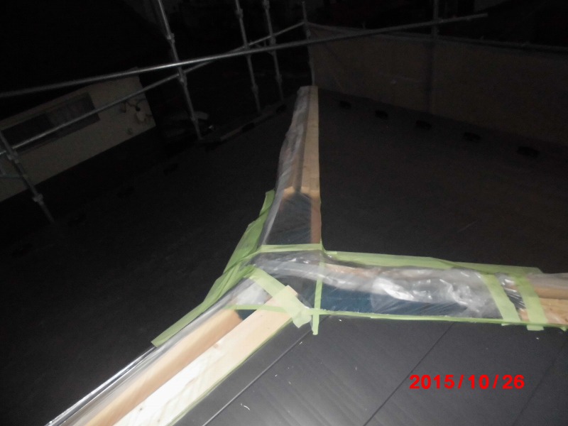 屋根板金カバー工事:仮設足場架け払い【260.0平方メートル】 屋根:既設屋根かわらUめくり撤去処分【96.6平方メートル】 粘着ルーフィング【96.6平方メートル】横暖ルーフきわみ【96.6平方メートル】棟(下地込み)【23.8メートル】 唐草 軒先、ケラバ共【43.0メートル】 壁際水切り【1.5メートル】 雪止め@450【850ヶ所】 雨樋:既設軒樋撤去処分【37.0メートル】 既設たて樋撤去処分【28.5メートル】 軒樋パナソニックPC50(金具込み)【37.0メートル】 たて樋60(金具込み)【28.5メートル】 集水器【5個】