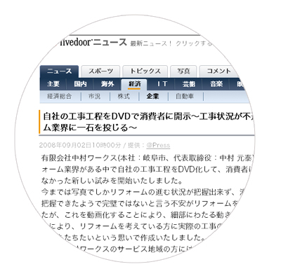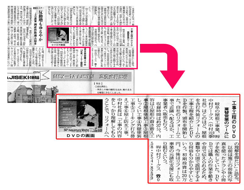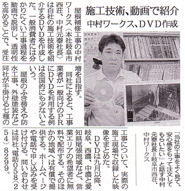 岐阜新聞に、業界初となる工事工程収録のDVDのことが掲載されました。 2回目 2008年8月30日(DVD)