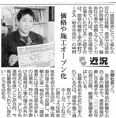 岐阜新聞に弊社の記事が掲載されました 岐阜新聞 2012年2月28日(火曜日) 日本屋根経済新聞という業界紙に弊社の記事が掲載されました 日本屋根経済新聞 2008年10月18日(土曜日)