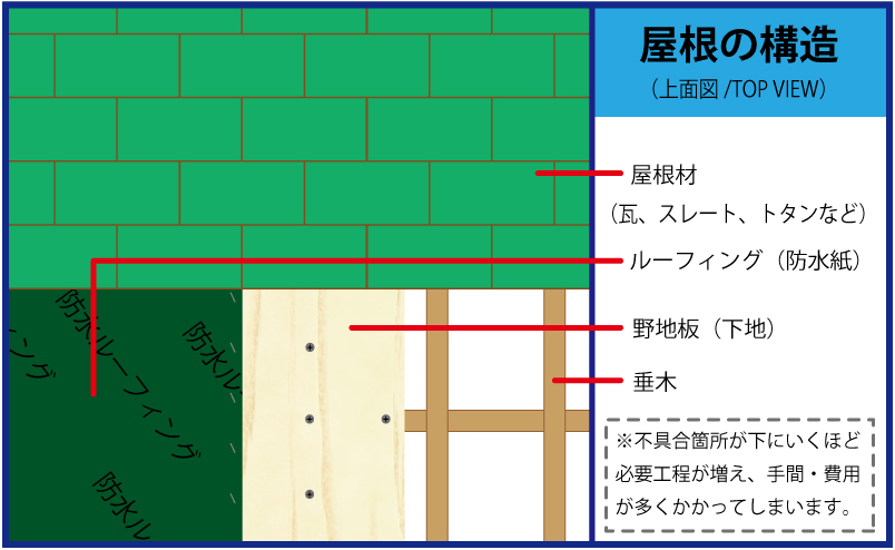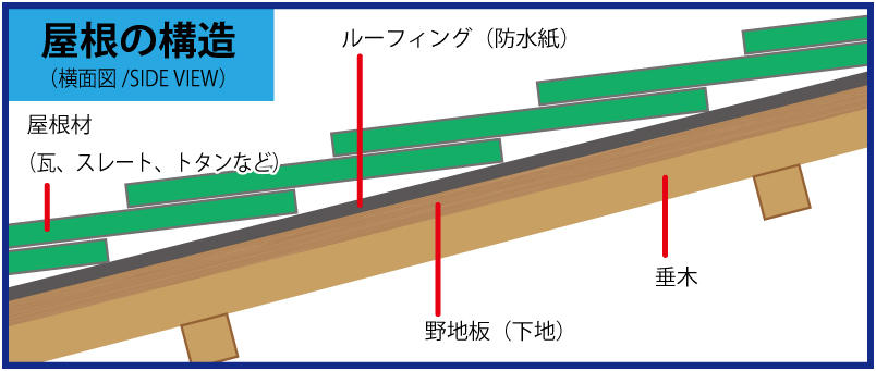 鉄筋コンクリート作りなどの例外はありますが、ほとんどの屋根はこのように何重にも重なって形成されています。下地から屋根材までそれぞれの層に役目があり、どれが欠けても屋根はその能力を100%発揮できなくなってしまいます。 雨漏りが起きたり、そのまま放置すると下地が腐ってゆき、最悪の場合屋根が丸ごと落下してしまうこともあります。