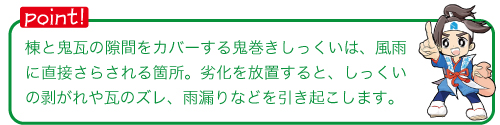 A:瓦自体はは100年くらいは余裕で持ちます。ただ粘土の焼きが甘い瓦だと凍て割れする瓦もあります。瓦そのものよりも、瓦を支える下地(野地板)だったりしっくいだったり、そのあたりをきちんとメンテナンスしておかないと、瓦の性能をきちんと引き出すことができなくなってしまいます。
