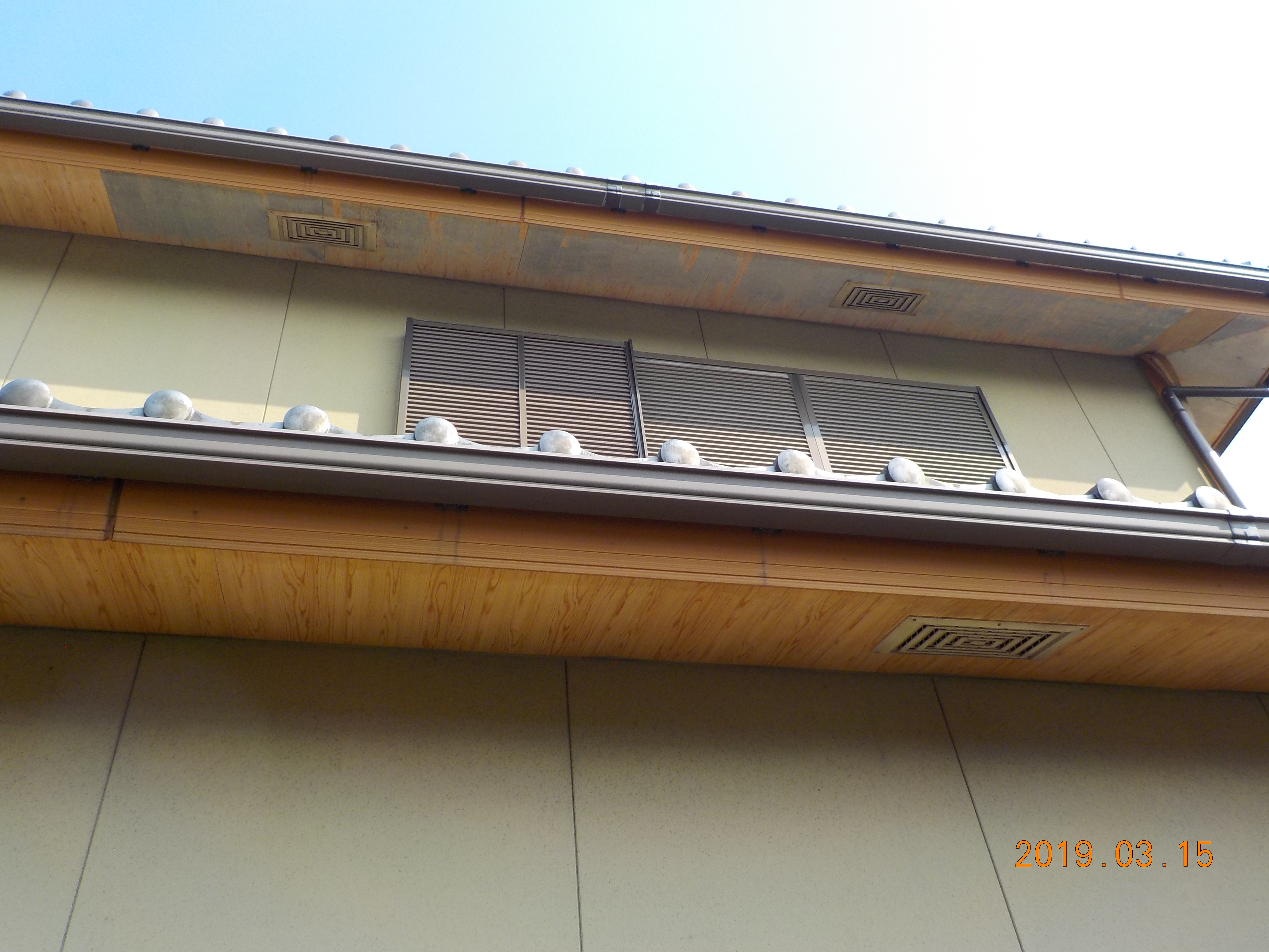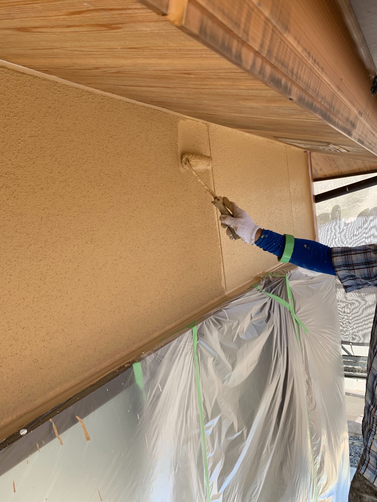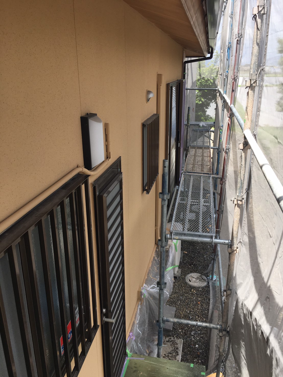 【外壁塗装工事】 仮設 仮設足場架け払い・シート養生 360㎡ 外壁 高圧洗浄 188.5㎡ 下塗り 専用シーラー 188.5㎡ 中塗り インディフレッシュセラニッペ 188.5㎡ 上塗り インディフレッシュセラニッペ 188.5㎡ コーキング窓廻り等増し打ち 158m シール・調色コーキング 1式 飾り板継ぎ部:土台部飾り平板・鼻隠し・角コート 付帯 軒樋シリコン2回塗り 116m たて樋・這い樋シリコン2回塗り 57m 雨戸・戸箱 シリコン2回塗り 1式 玄関軒裏・クリアー塗装 1式 鉄部:壁際のし瓦包み板金部・シリコン2回塗り 44.5m 養生費 大工:軒天(玄関のぞく)木目P上貼り 63㎡ 電気:エアコン冷媒管外部カバー取替え 3箇所