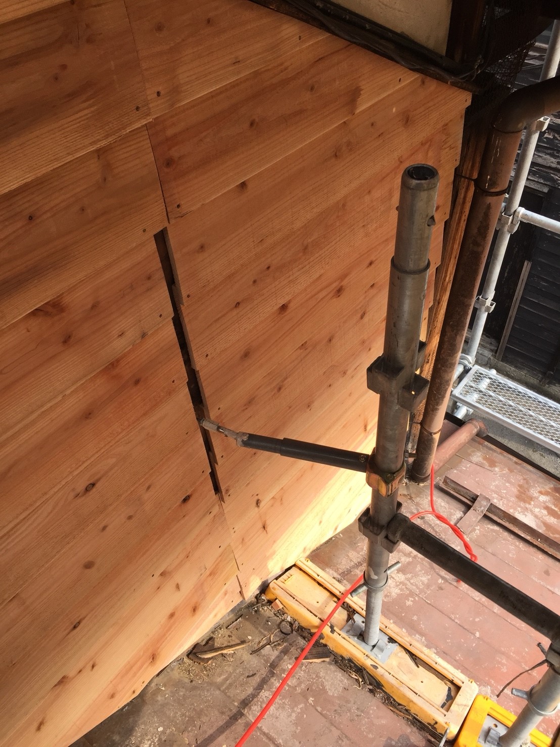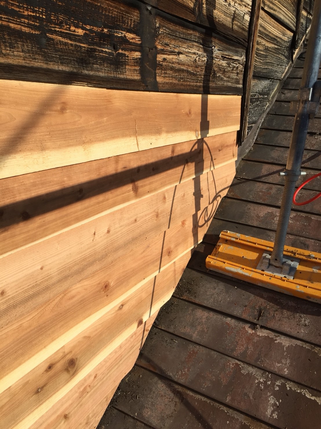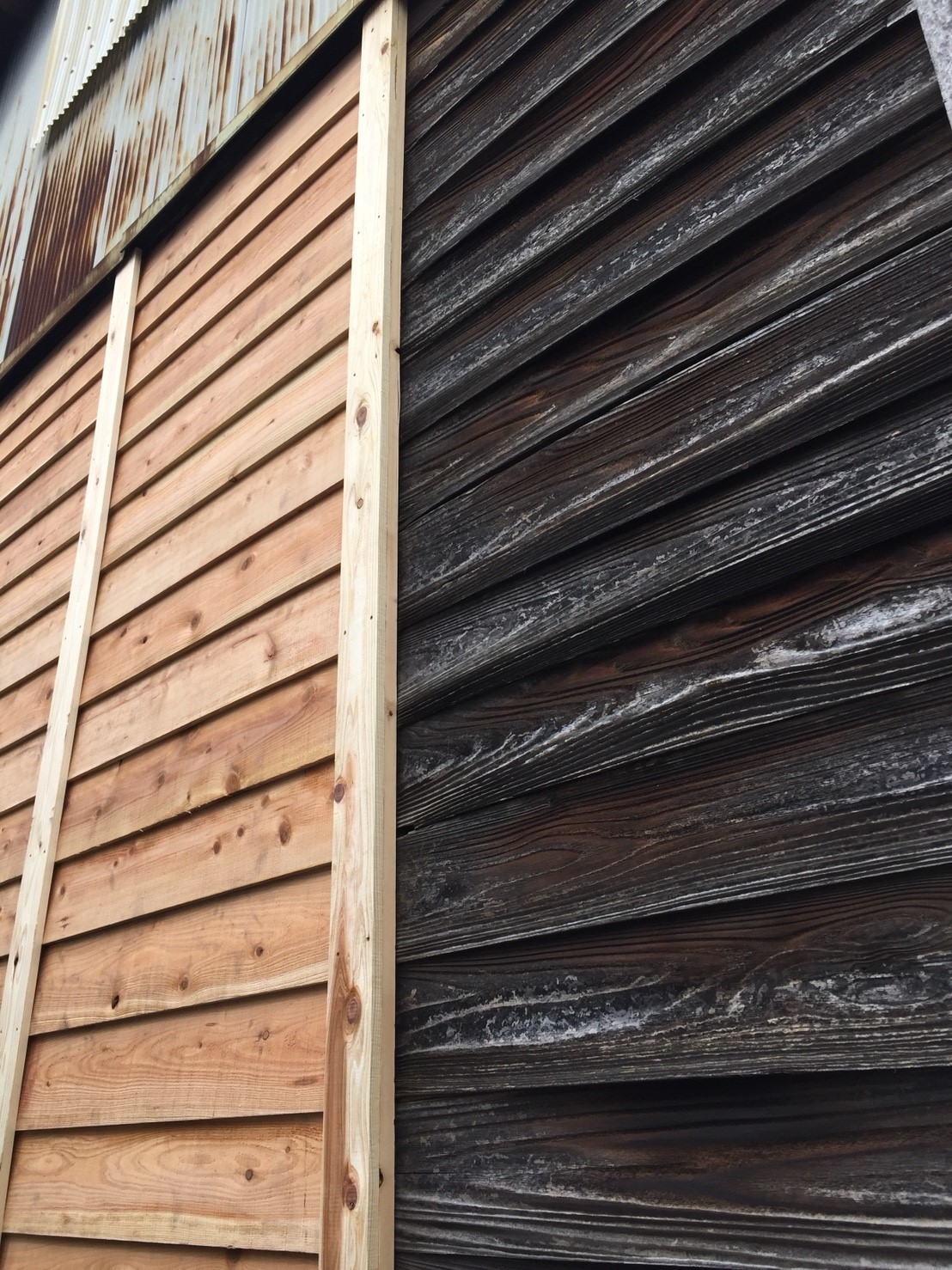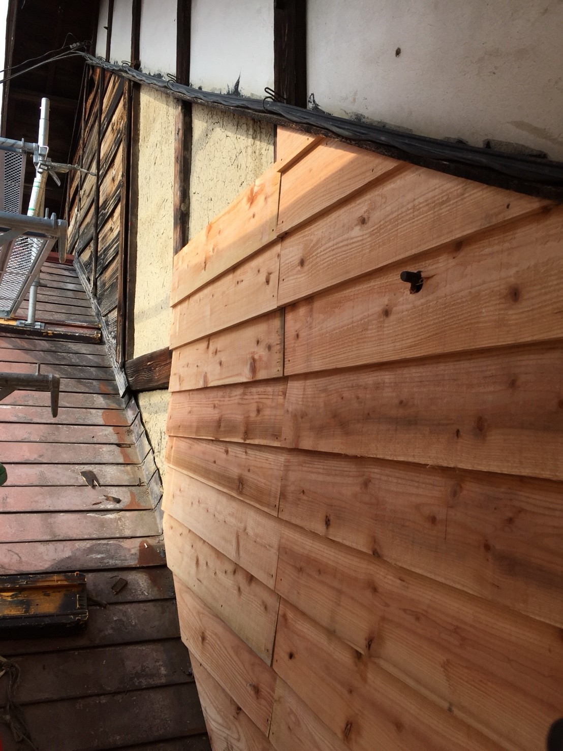 北倉庫  仮設足場  ガラス割れ取替工事  木製ガラス撤去、アルミサッシ  東妻 木板大工工事     キシラデコール塗装  2F部 仮設足場架け払い     木板大工工事     キシラデコール塗装 西倉庫  木壁(杉皮使用)大工工事 北倉庫  棟包み板金工事 木下地共 自宅  外壁補修トタン貼り 事務所  南東 仮設足場架け払い  既設トタンめくり処分  木下地大工工事  波トタン張り工事 諸費 諸経費