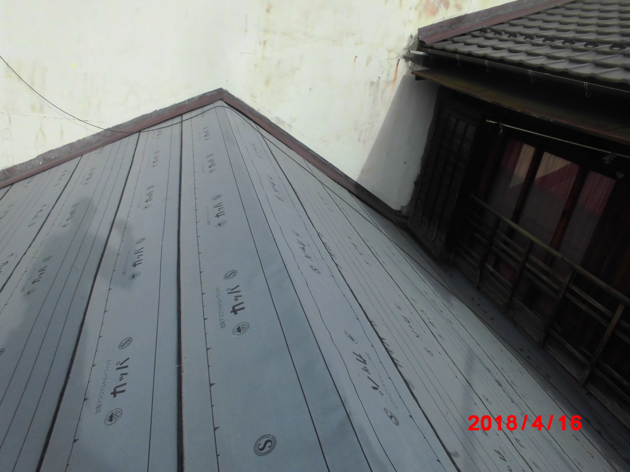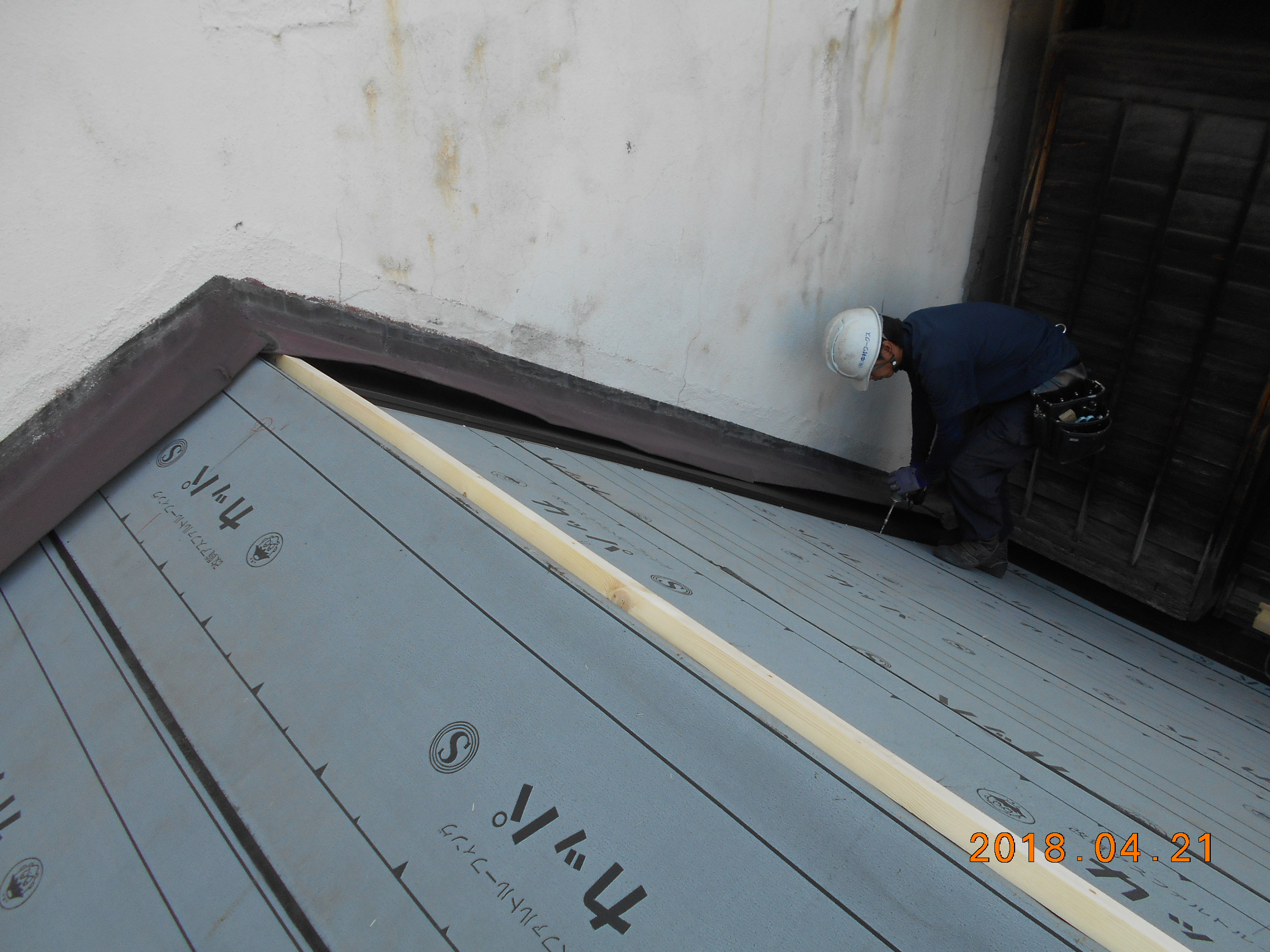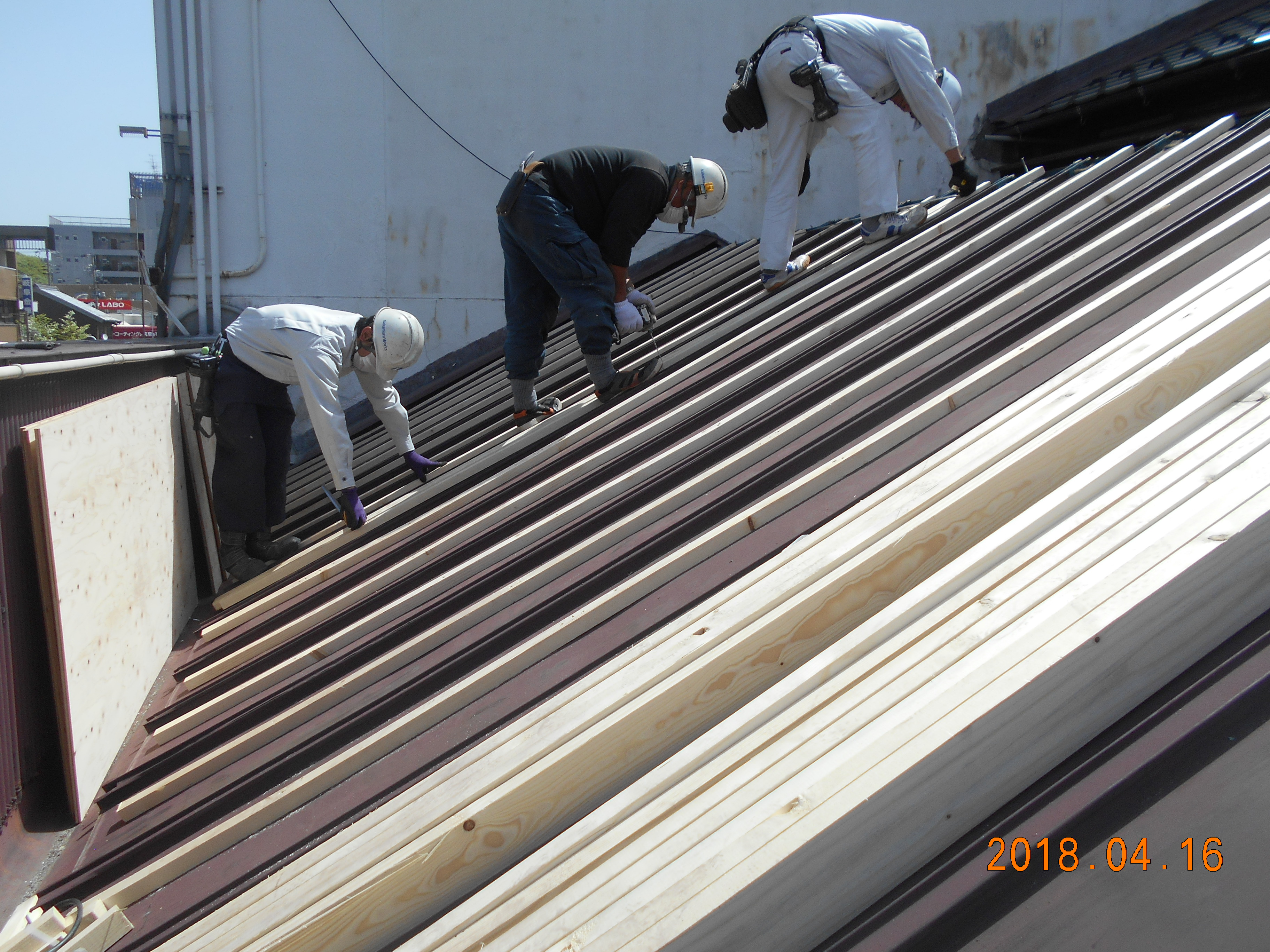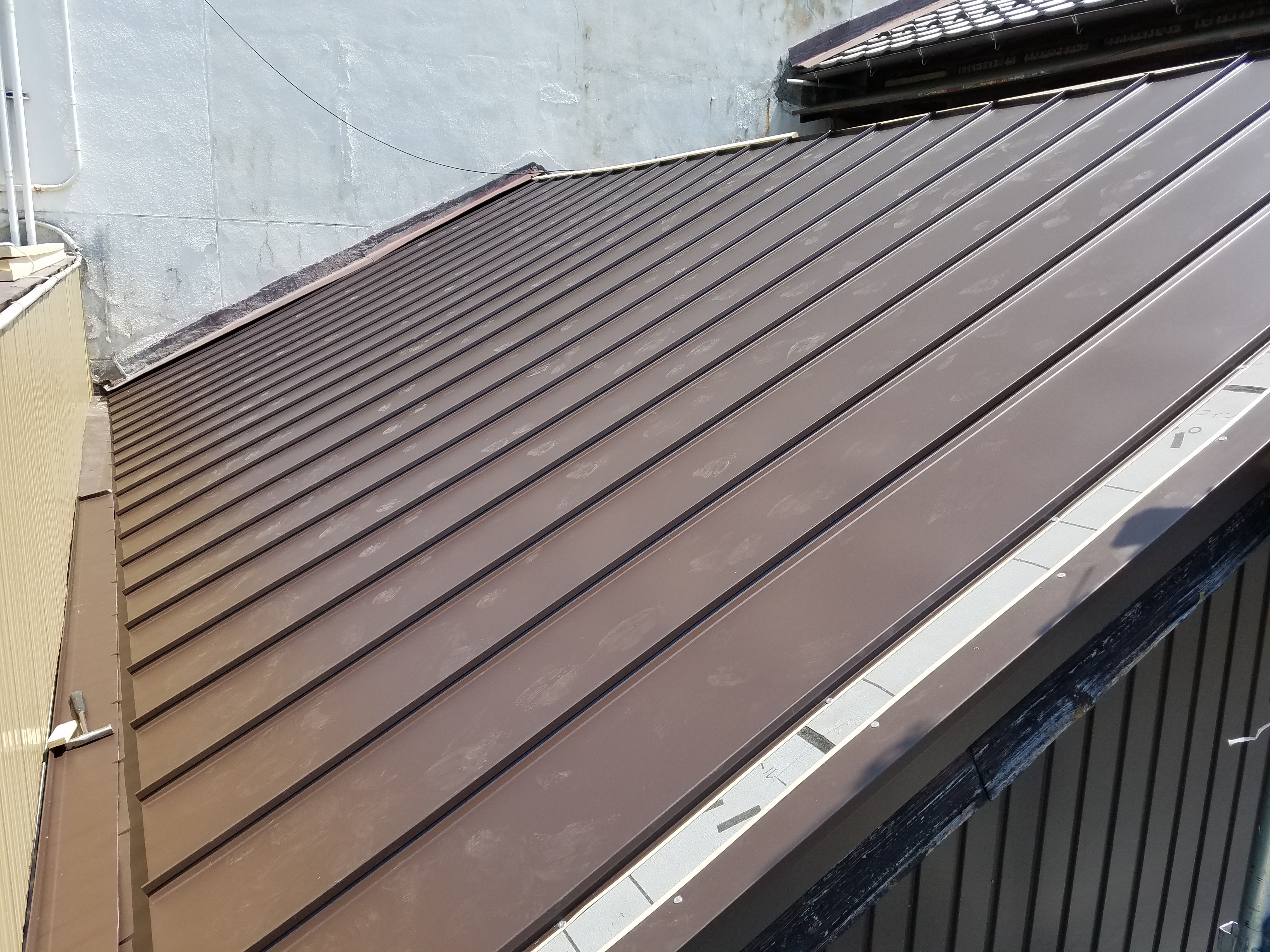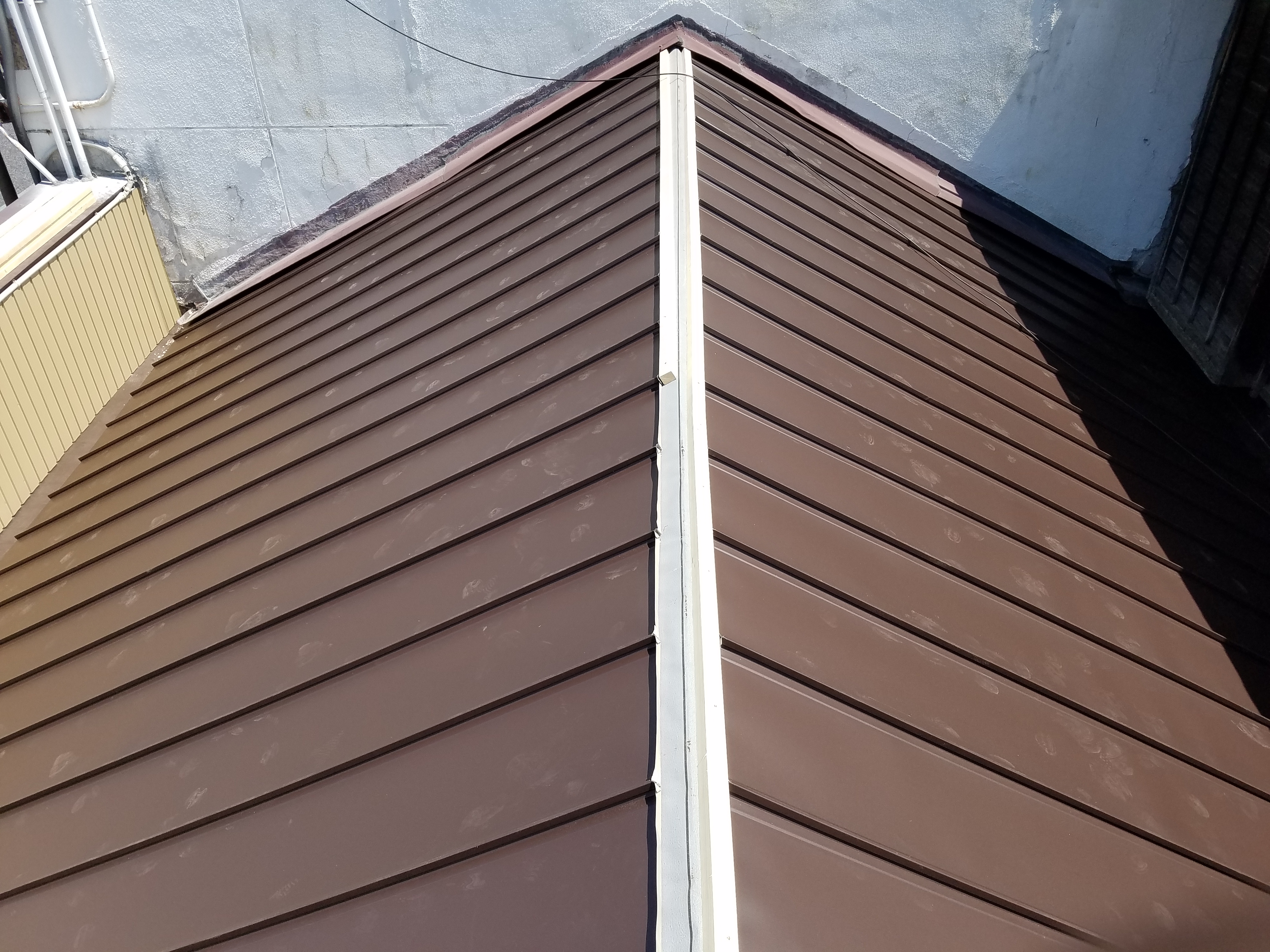 屋根カバー工事 仮設 仮設足場架け払い(屋根・西壁)1式 屋根 下地コンパネ大工工事 54.6㎡、ゴムアスルーフィング 54.6㎡、立平葺き GL鋼板54.6㎡、谷樋 14.0m、ドレン 2個、たて樋 60 3.0m、VUエルボ含む 1式、破風板金巻き 7.8m、水切り 7.8m、3階コーキング補修 1式、北面内壁補修 約7㎡ 1式、エアコン脱着 1式、諸費 諸経費 1式 屋根の色:新茶 北内壁:ベージュ 水切り:新茶 破風:新茶