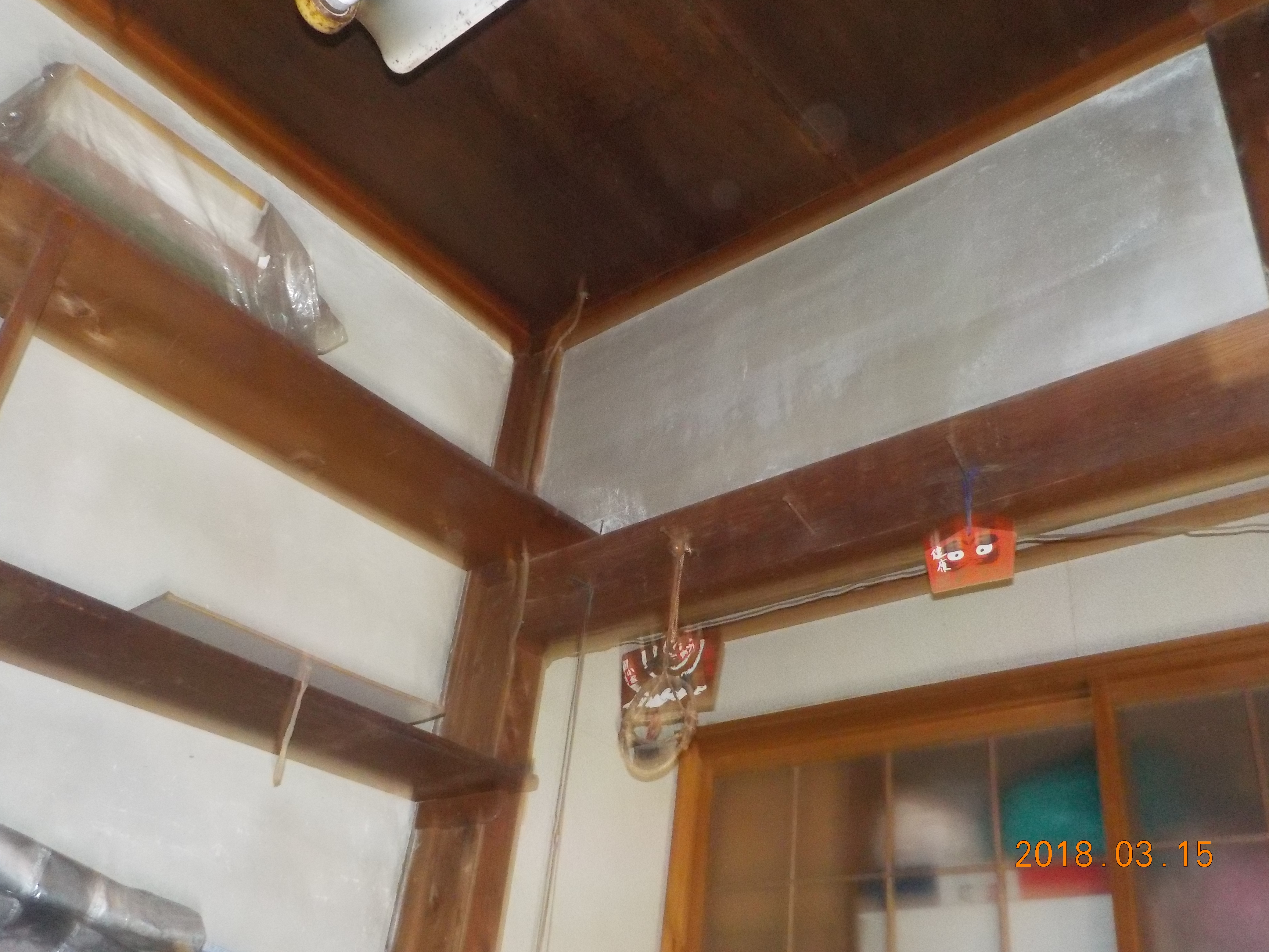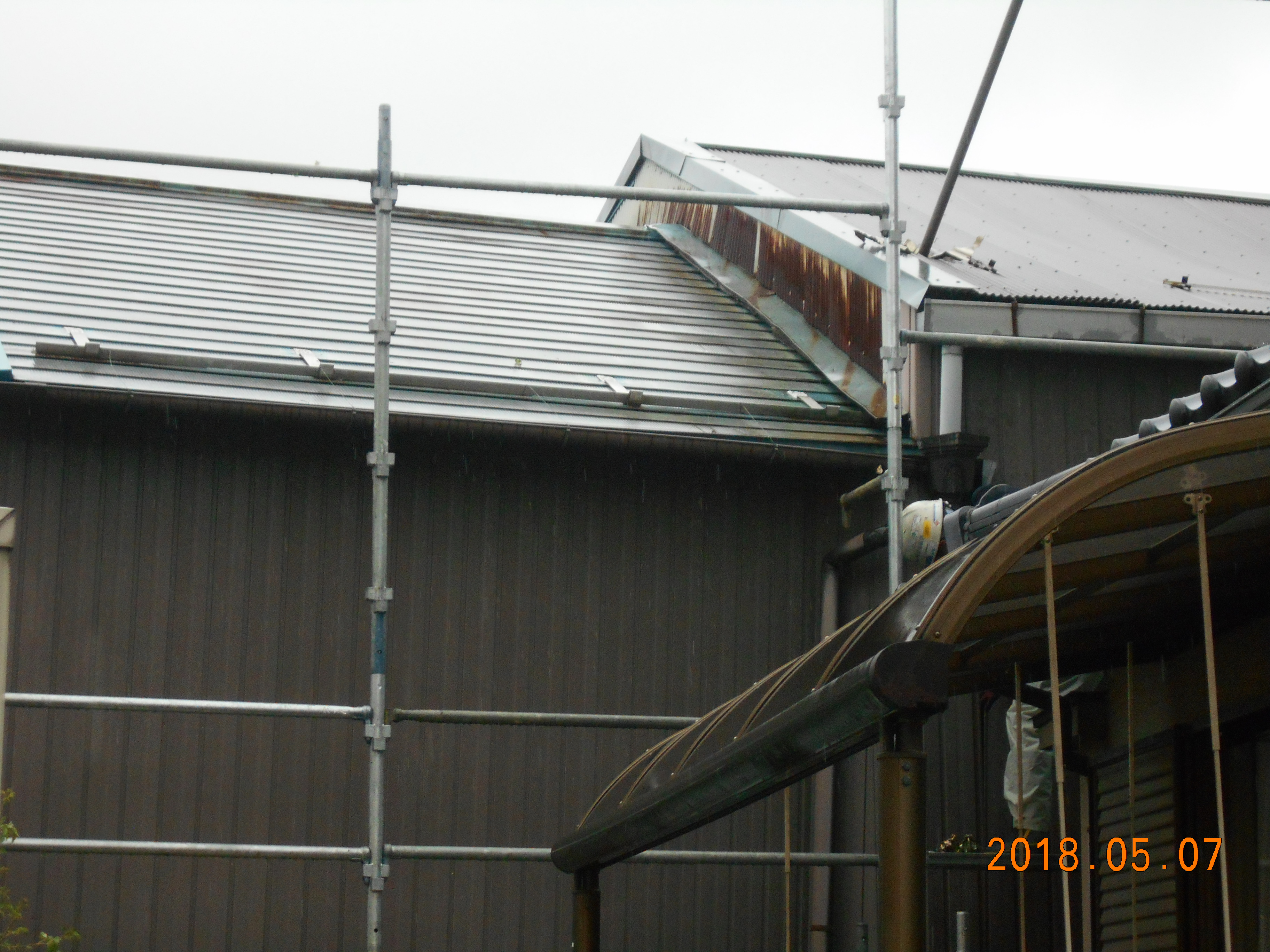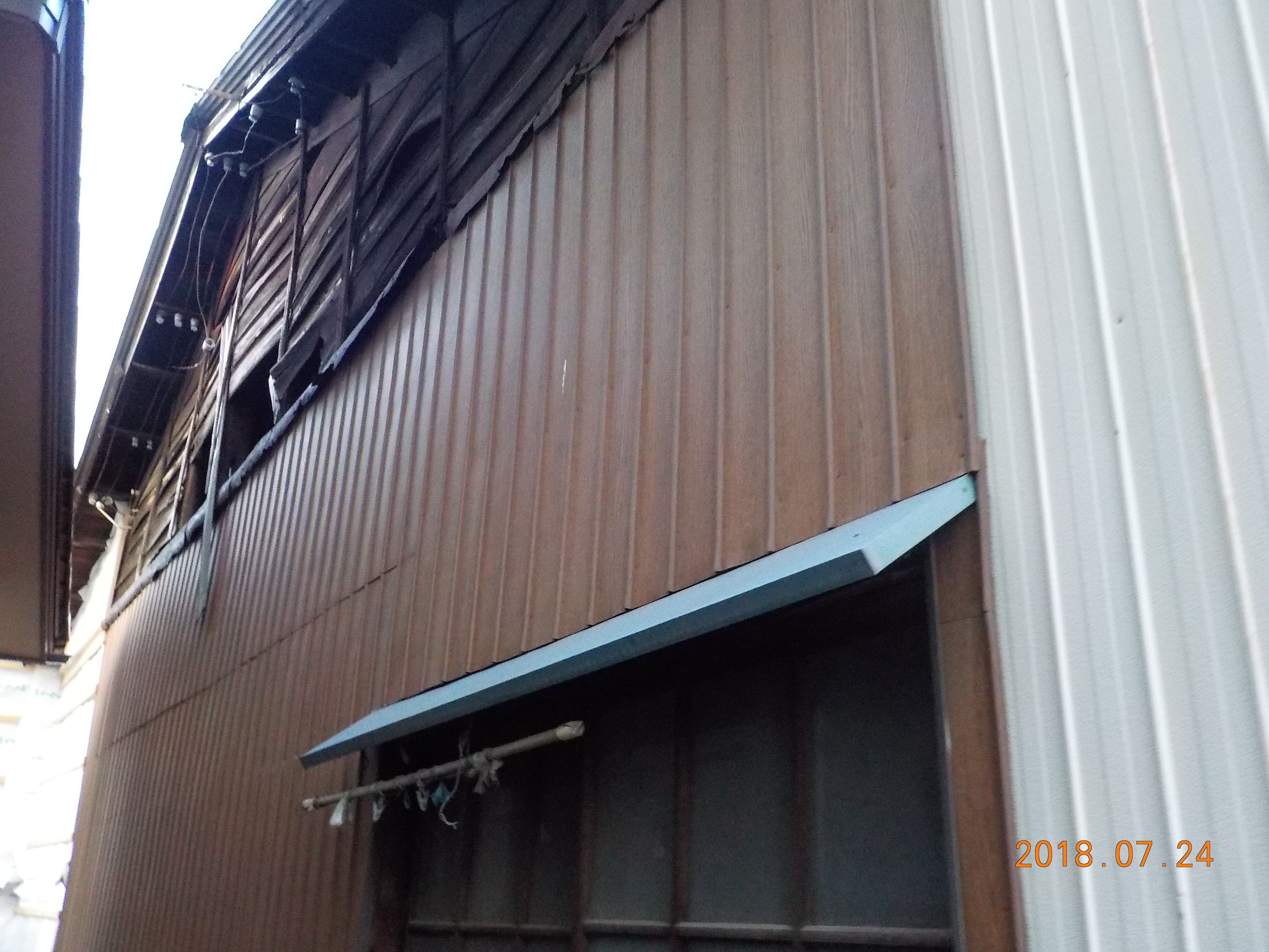 外壁:木下地工事、既設木壁めくり、GLトタン張り 屋根:既設波トタンめくり、処分、下地コンパネ重ね張り、防水ルーフィング、たて平、水上水切り、棟、谷樋取替、雪止め、波ポリカーボネート張替え、笠釘、既設軒樋撤去、大型軒樋、落し口 内部改修工事 電気工事