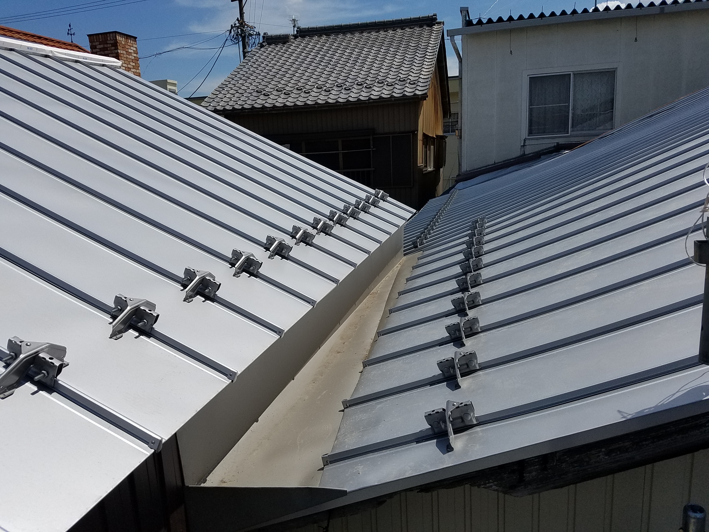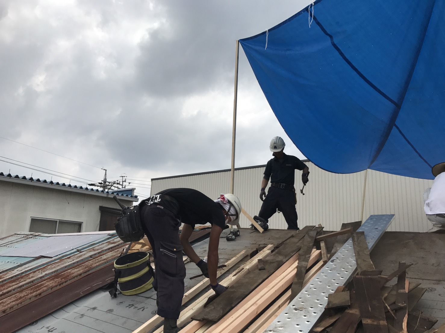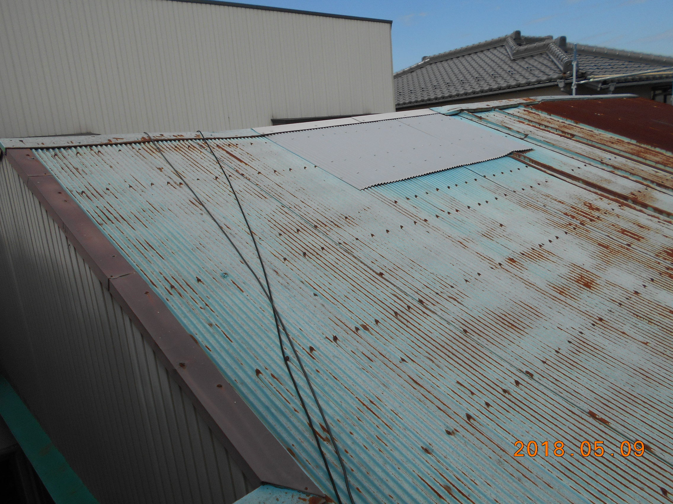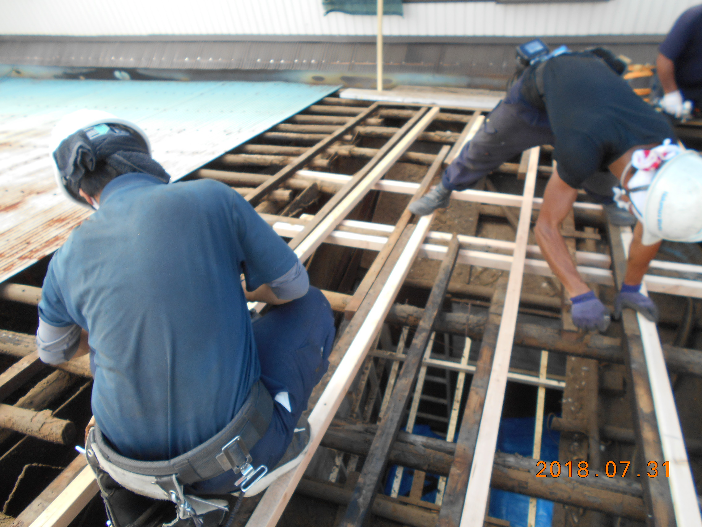 外壁:木下地工事、既設木壁めくり、GLトタン張り 屋根:既設波トタンめくり、処分、下地コンパネ重ね張り、防水ルーフィング、たて平、水上水切り、棟、谷樋取替、雪止め、波ポリカーボネート張替え、笠釘、既設軒樋撤去、大型軒樋、落し口 内部改修工事 電気工事