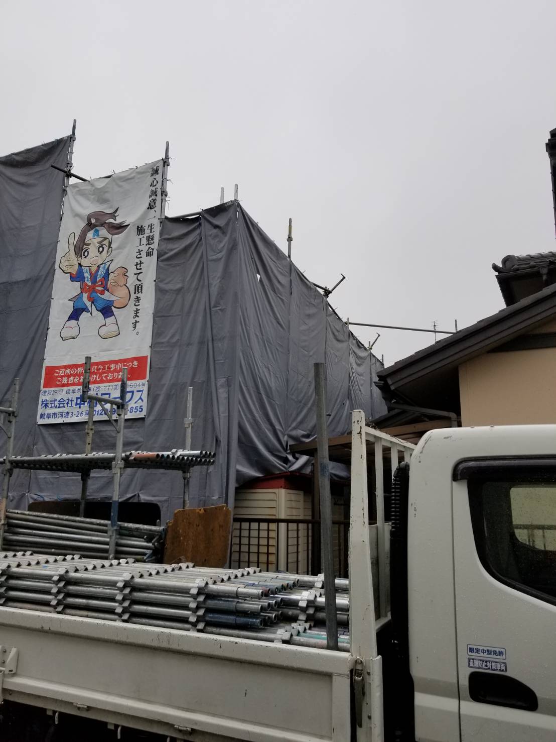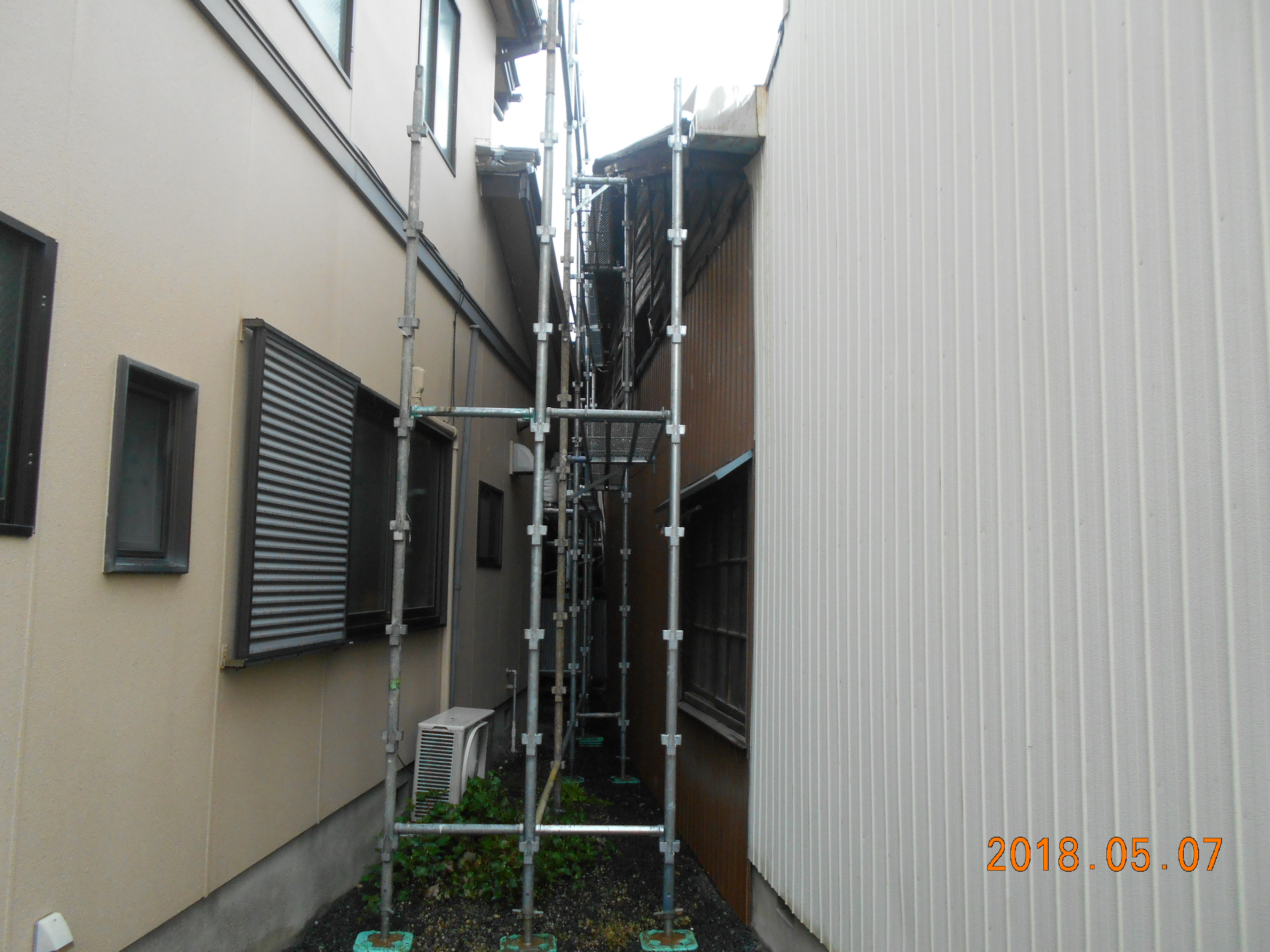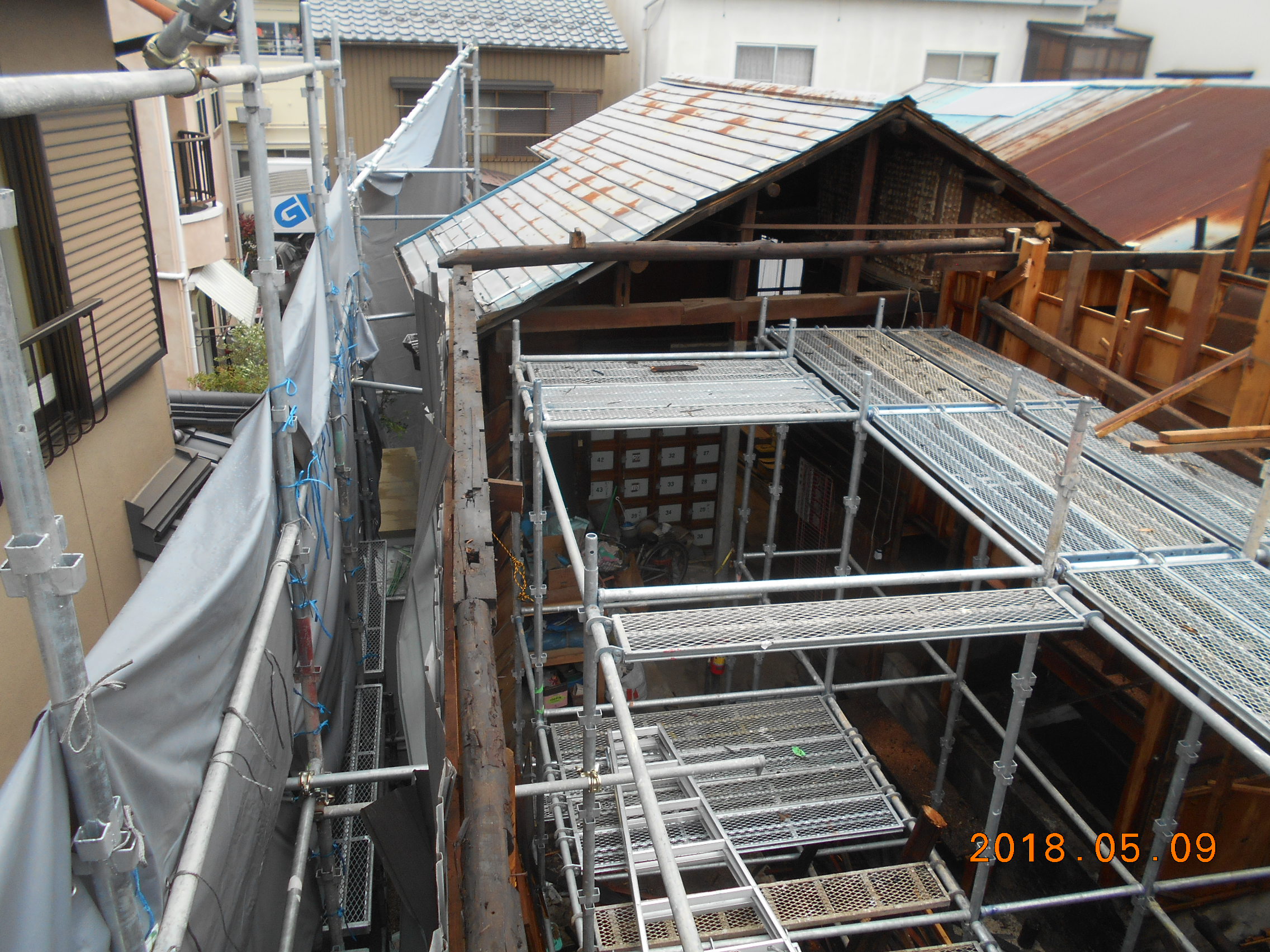 家屋改修工事:解体用外部足場架け払い、防煙シート、解体工事仮囲足場工事、内部足場架け払い、落下防止ネット張り、外部足場雨樋足場架け払い