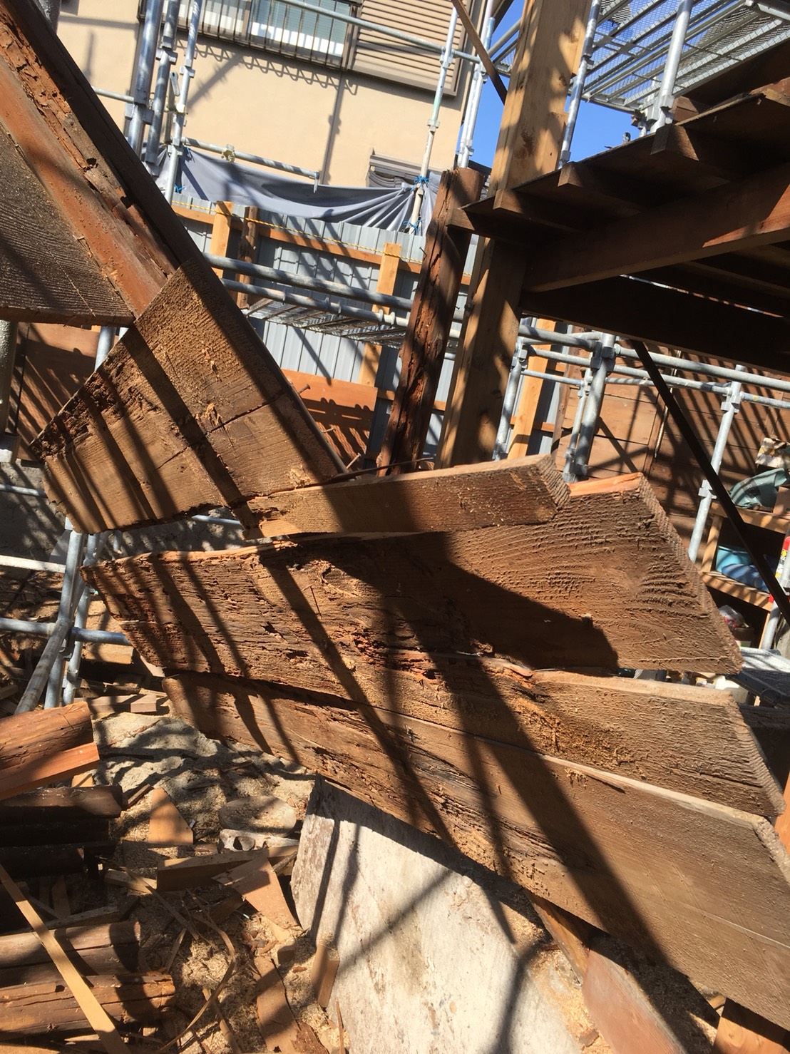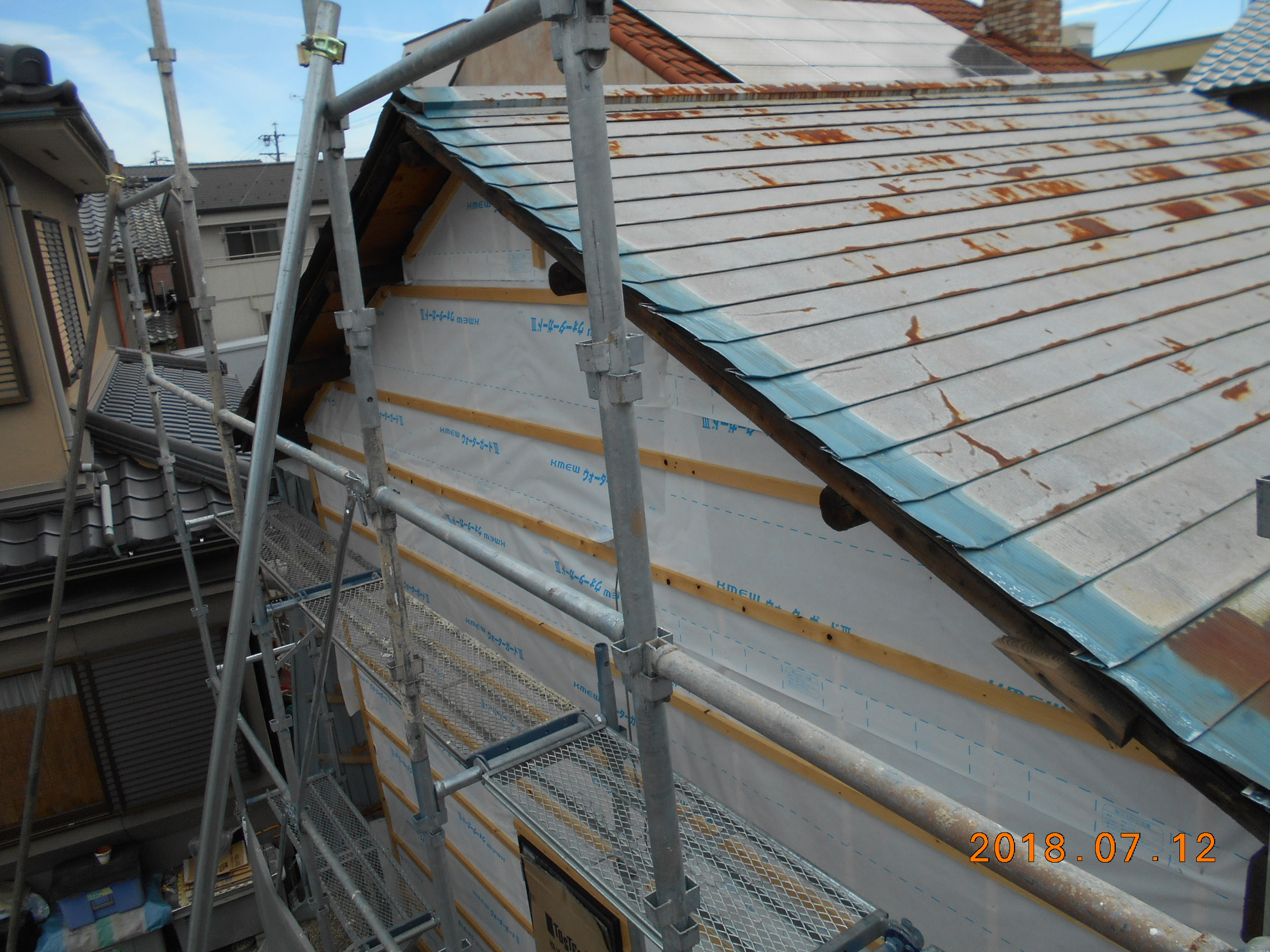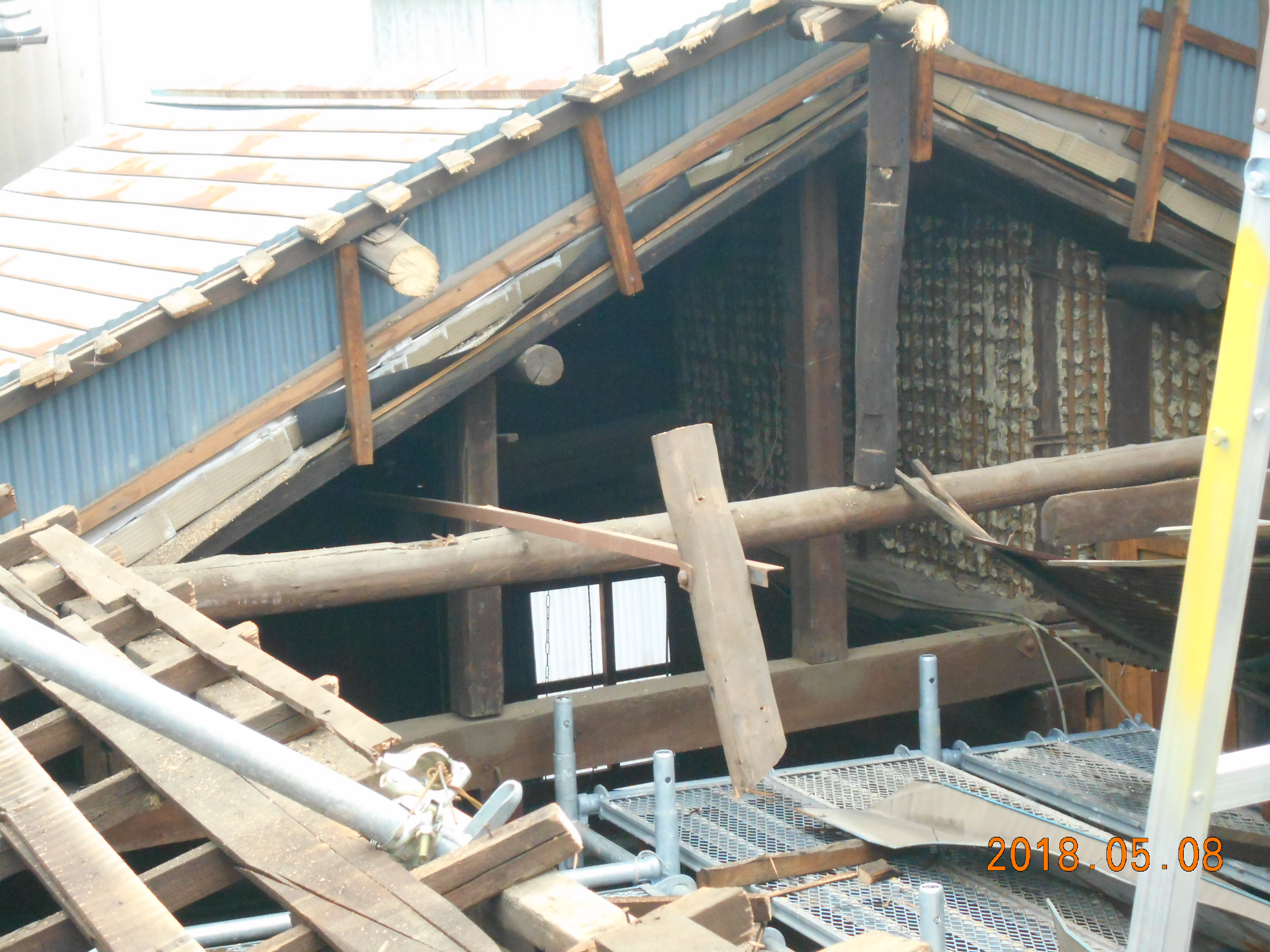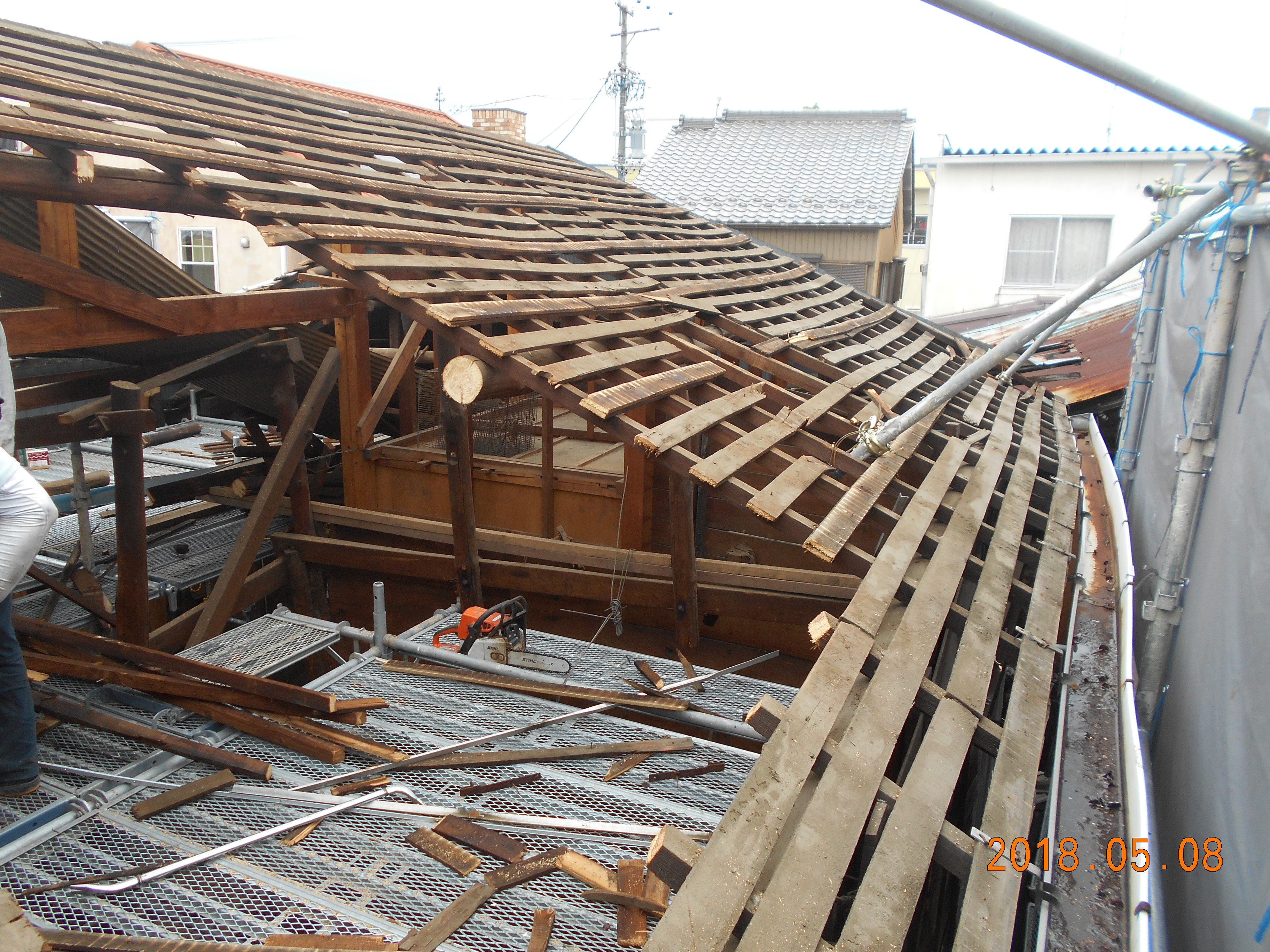 家屋改修工事:解体用外部足場架け払い、防煙シート、解体工事仮囲足場工事、内部足場架け払い、落下防止ネット張り、外部足場雨樋足場架け払い