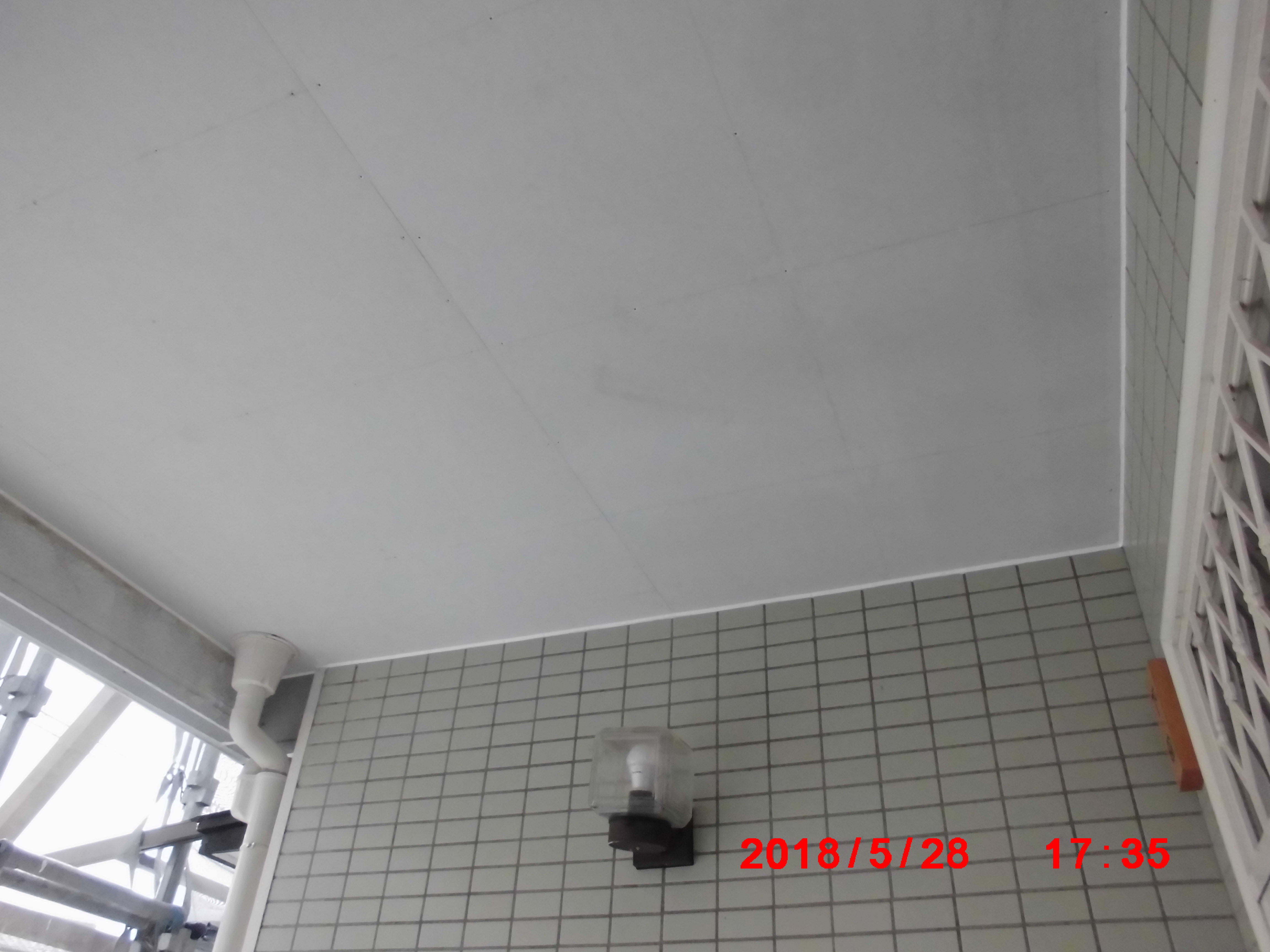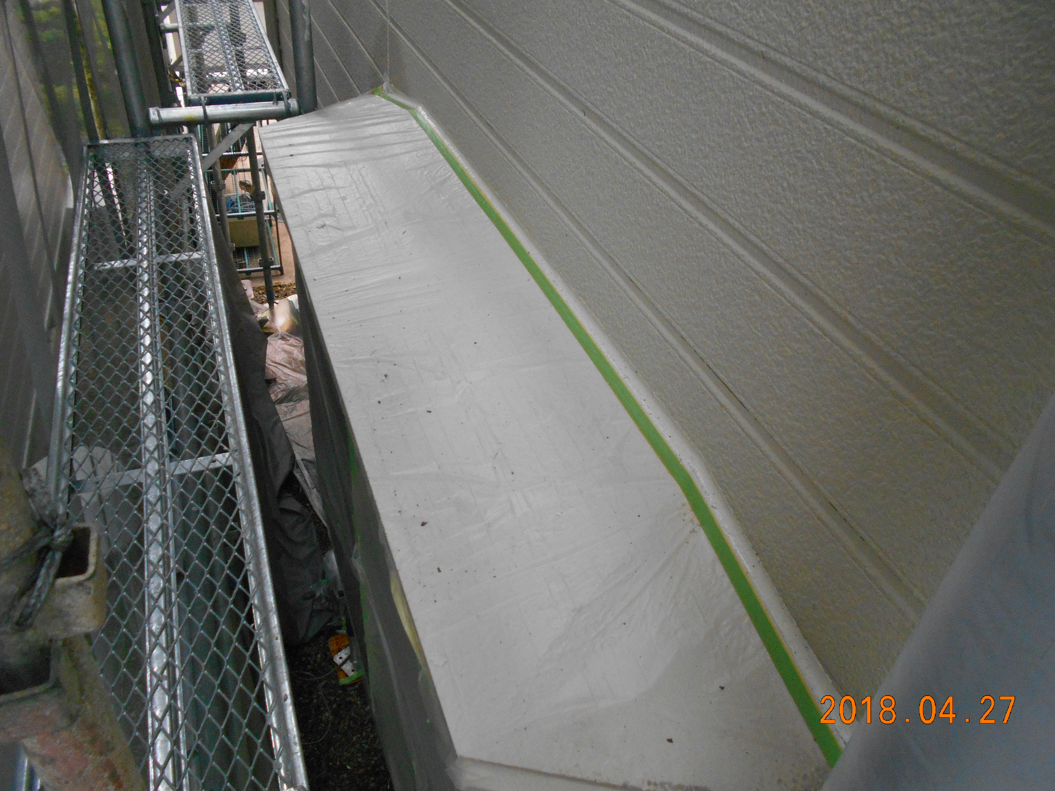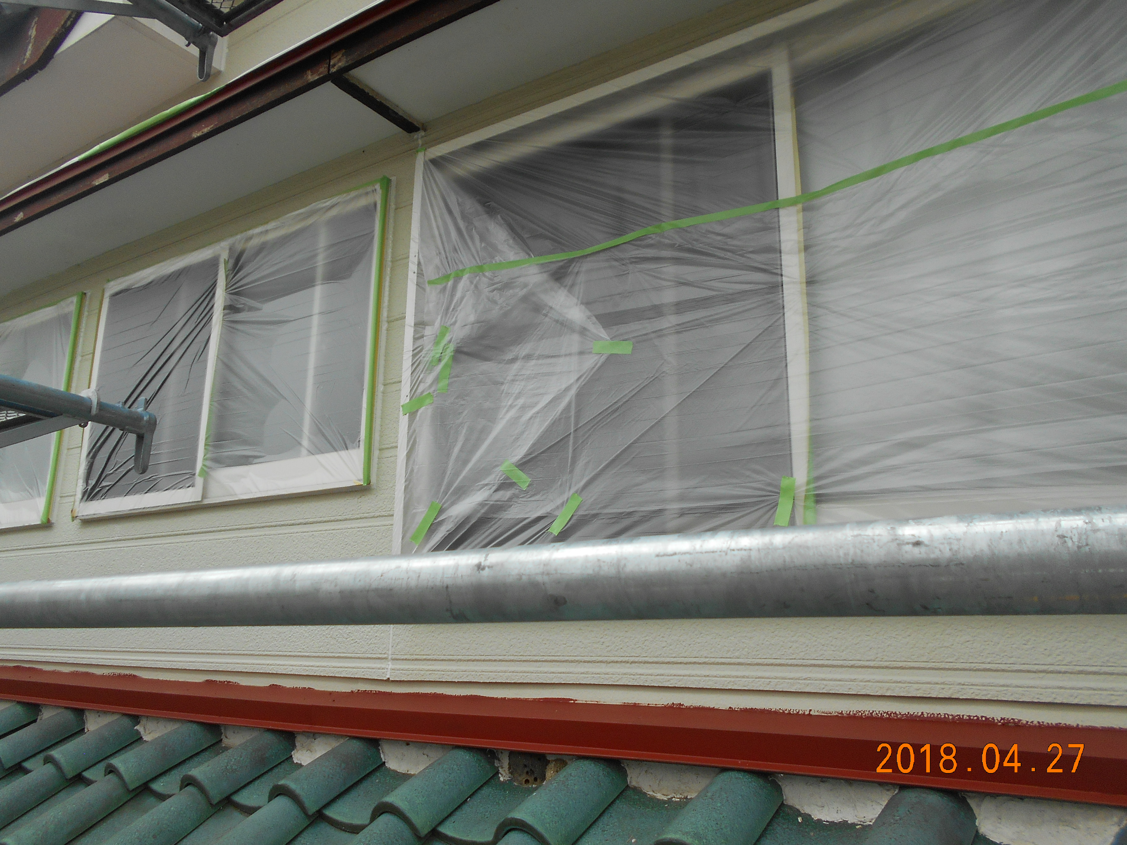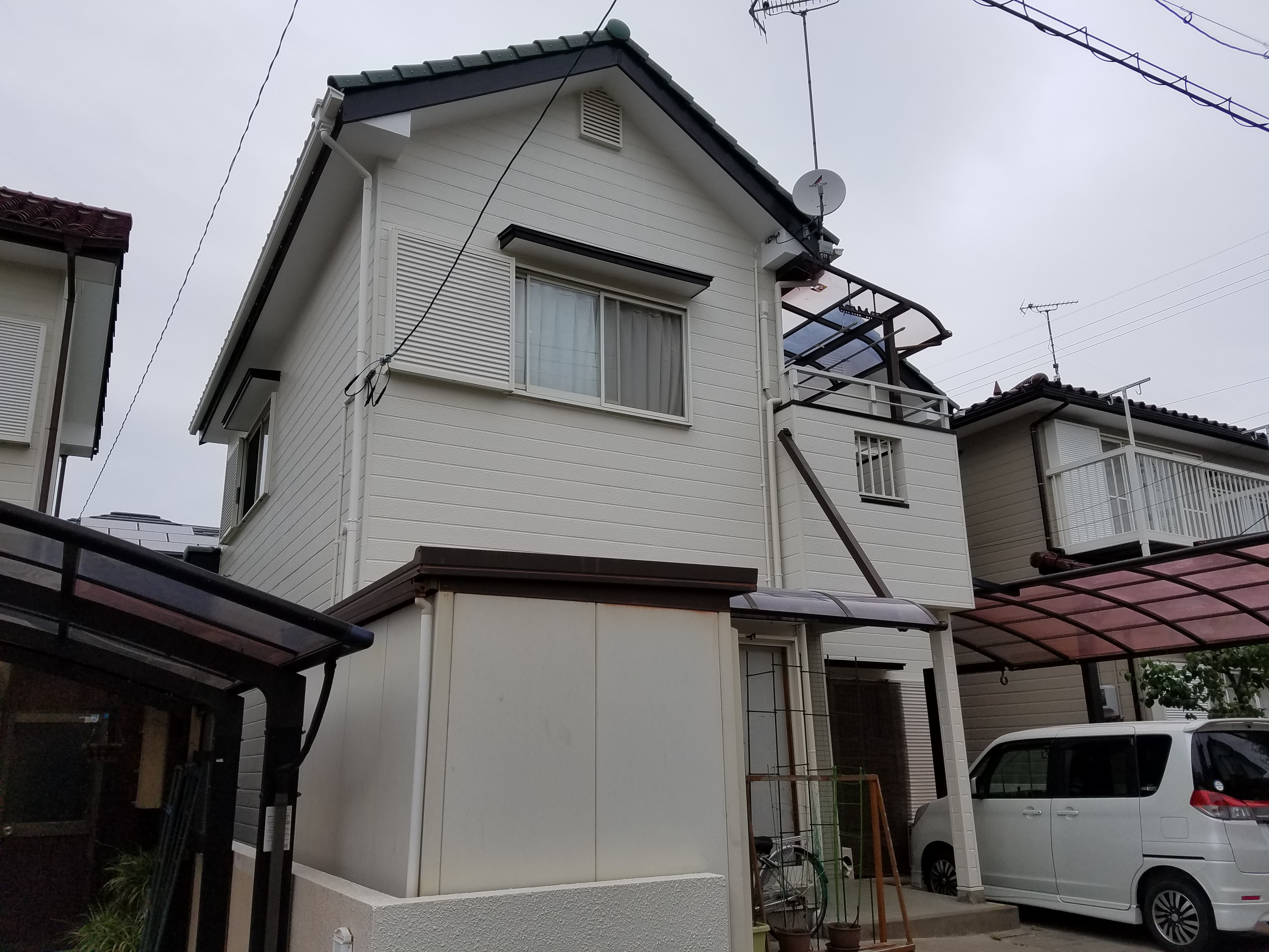 付帯:軒天部分張替え、木下地、内部繁ぎ補修、軒裏内部受け樋補修工事、軒天ケンエース2回塗、鼻隠しフッ素2回塗り、破風板フッ素2回塗り、雨戸戸袋フッ素2回塗り、塀下塗りフィラーフッ素2回塗り、軒樋、縦樋、フッ素2回塗り、