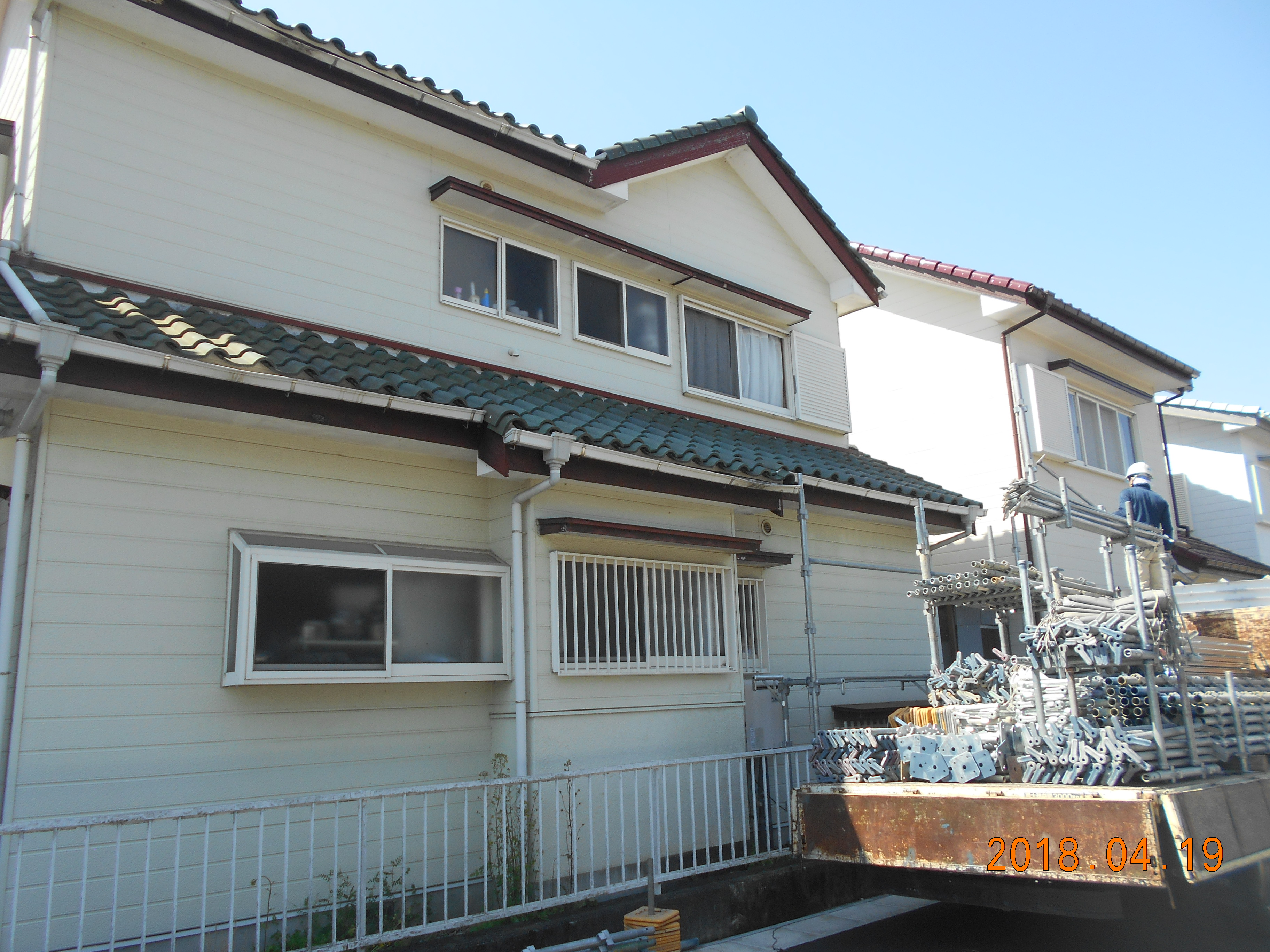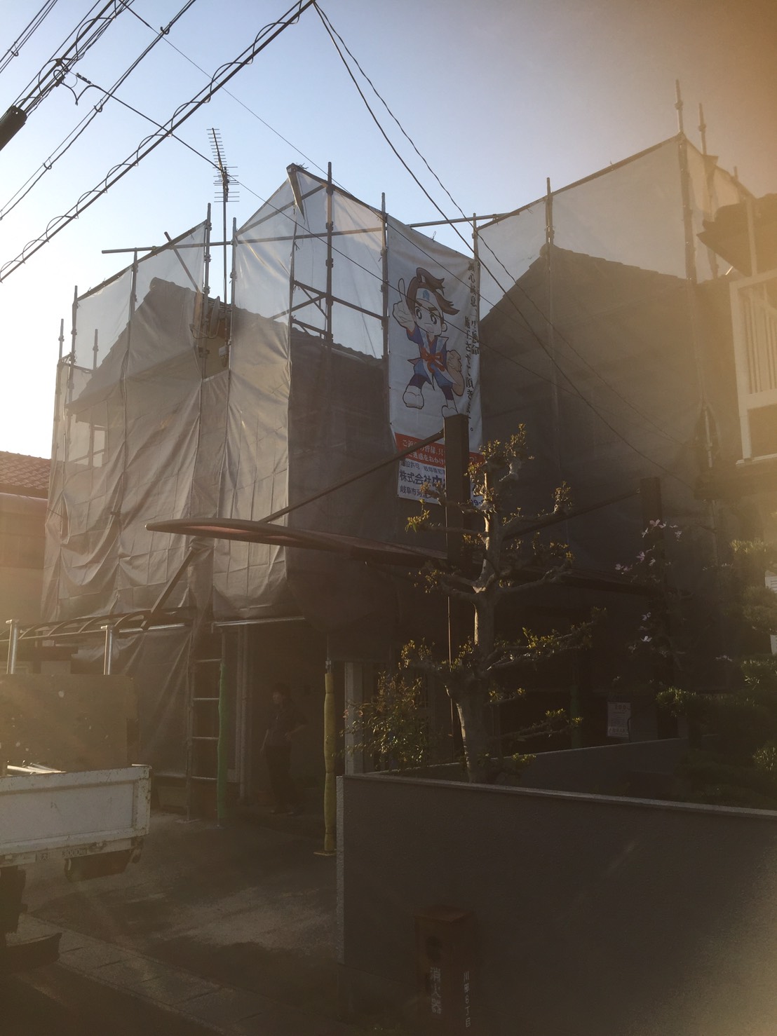 外壁塗装工事:仮設足場架け払いシート養生、テラス脱着、
