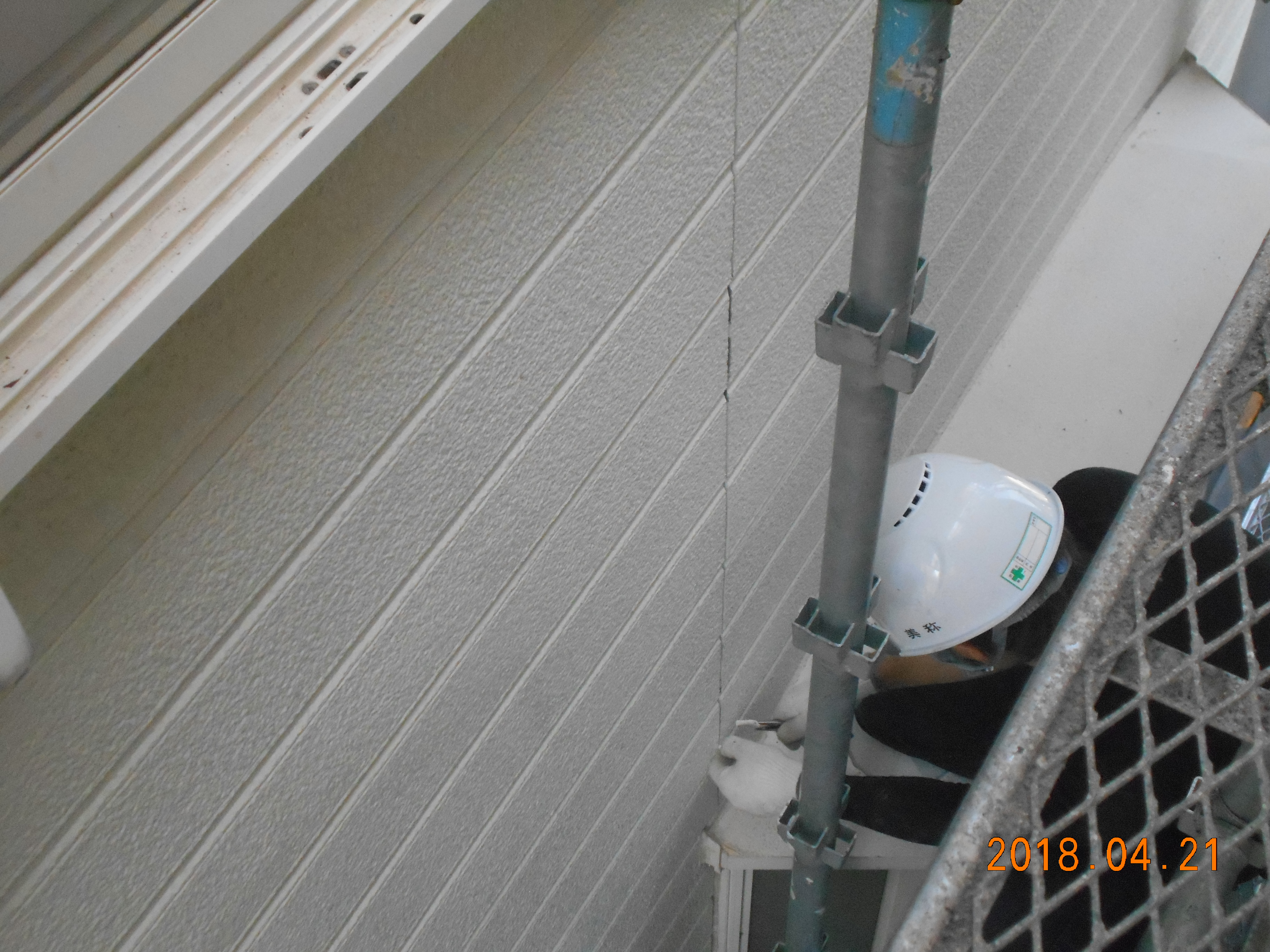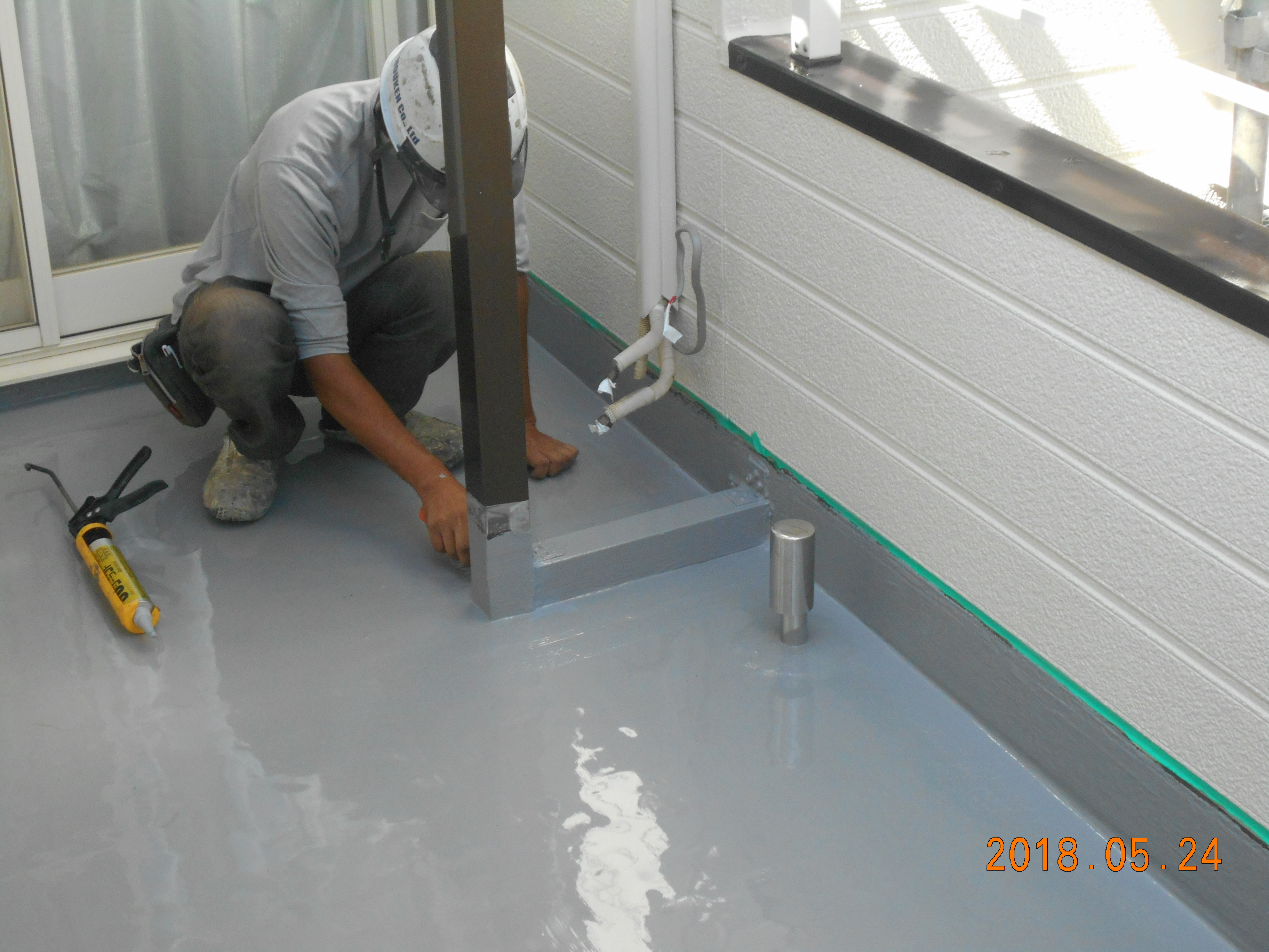 シール:コーキングたて部打ち替え、サッシ廻り増し打ち、ベランダ:室外機脱着、ケレン清掃、下地処理、ウレタン塗膜防水、改修用ドレン取付、脱気筒取付、端末コーキング処理
