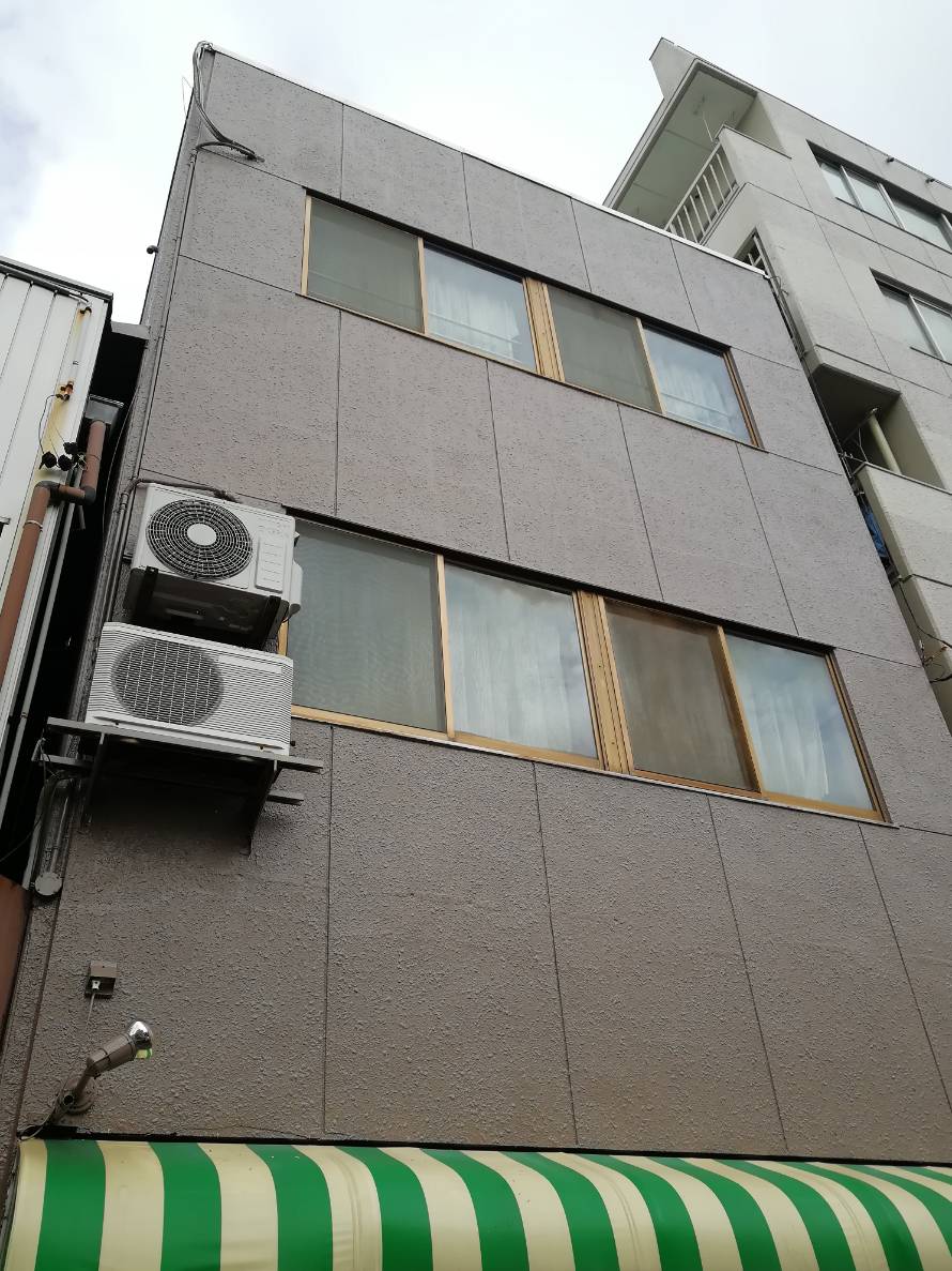仮設足場架け払い(南・西・北) 道路占有許可申請代行、高圧洗浄 142㎡、下塗りフィラー、中塗りシリコン ファインSi、上塗りシリコン ファインSi、コーキング継部増し打ち 146.8m、コーキング窓廻り増し打ち 57.6m、樋シリコン2回塗り 1式、シャッター シリコン2回塗り 1式、北面ドア 左官工事、看板撤去・処分・穴コーキング