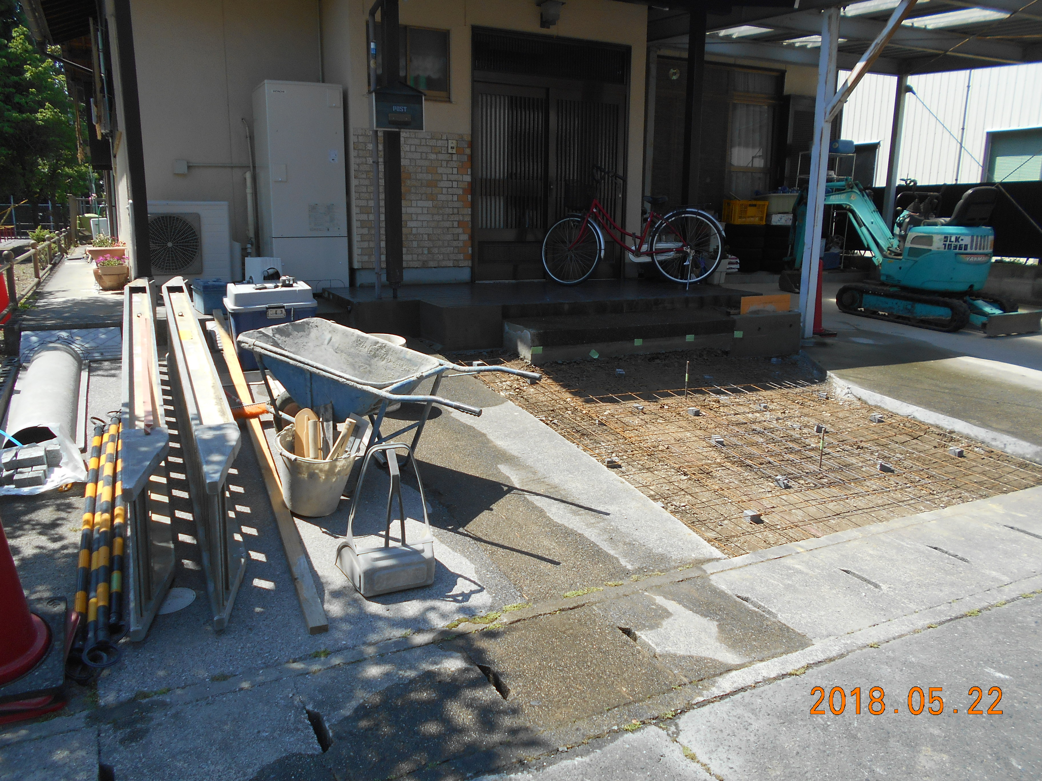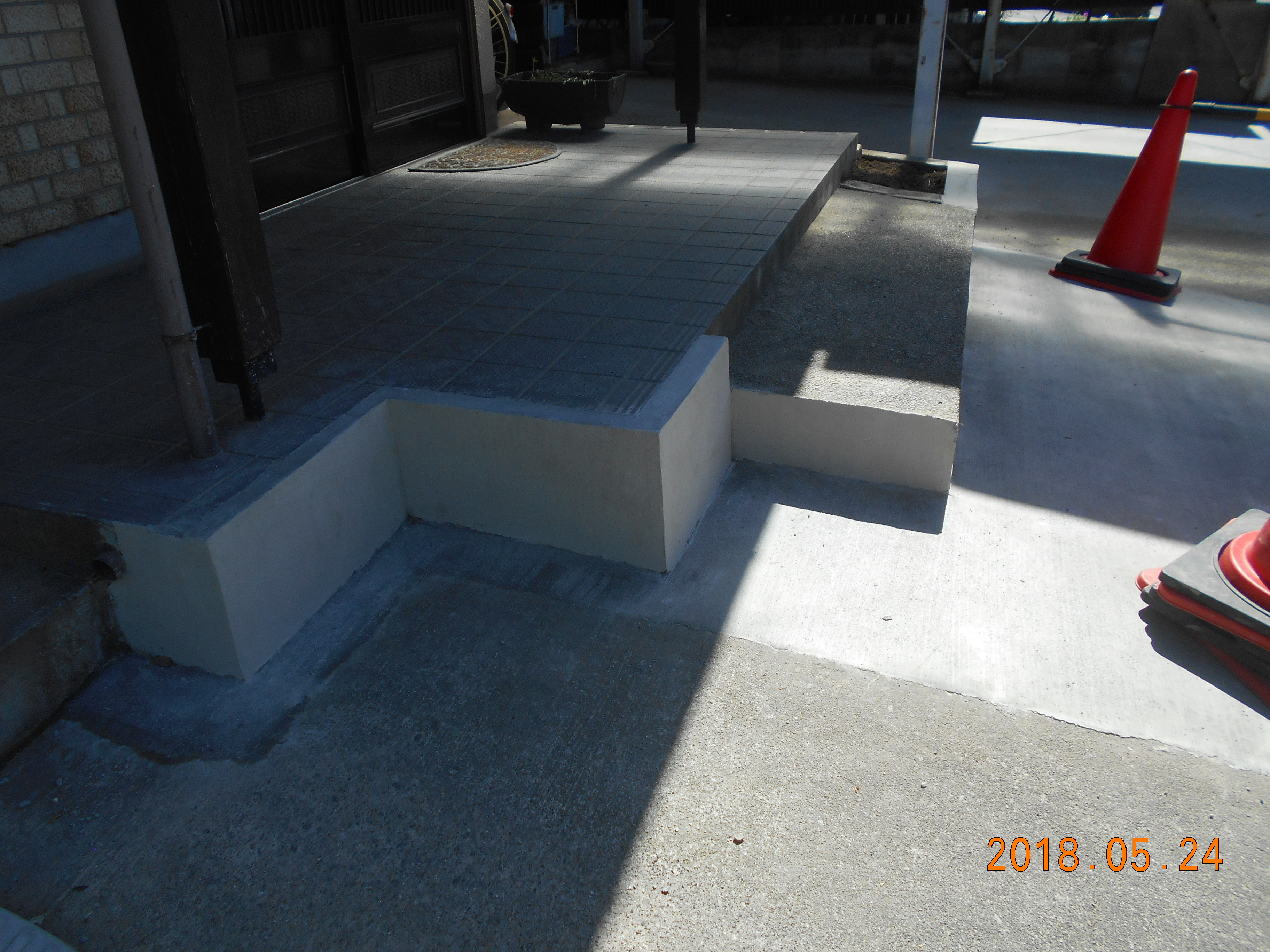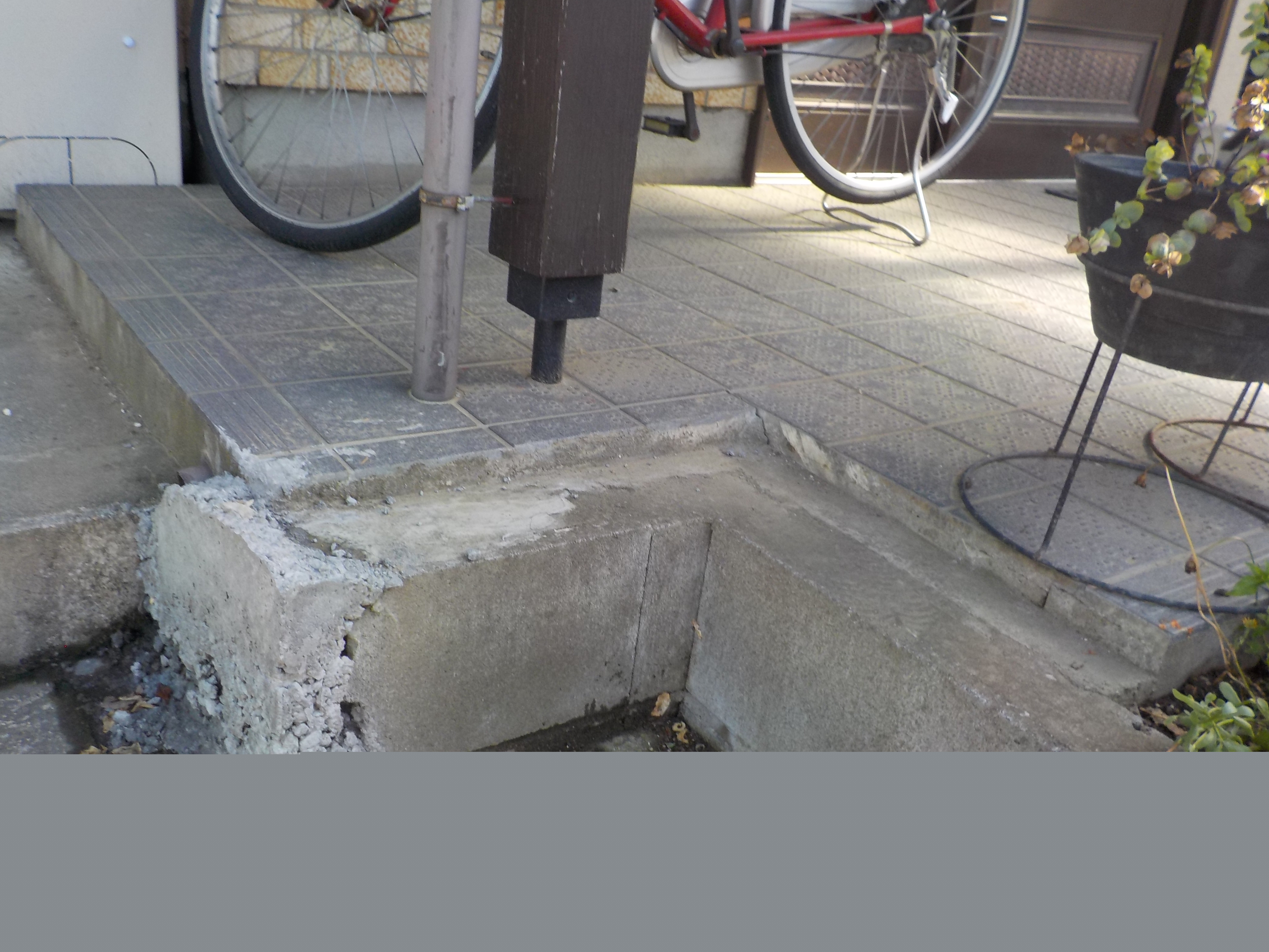 外構工事:アプローチ土間・CB撤去処分、残土処分、ハツリ・CB解体、階段壁補修、土間生コン打ち工事