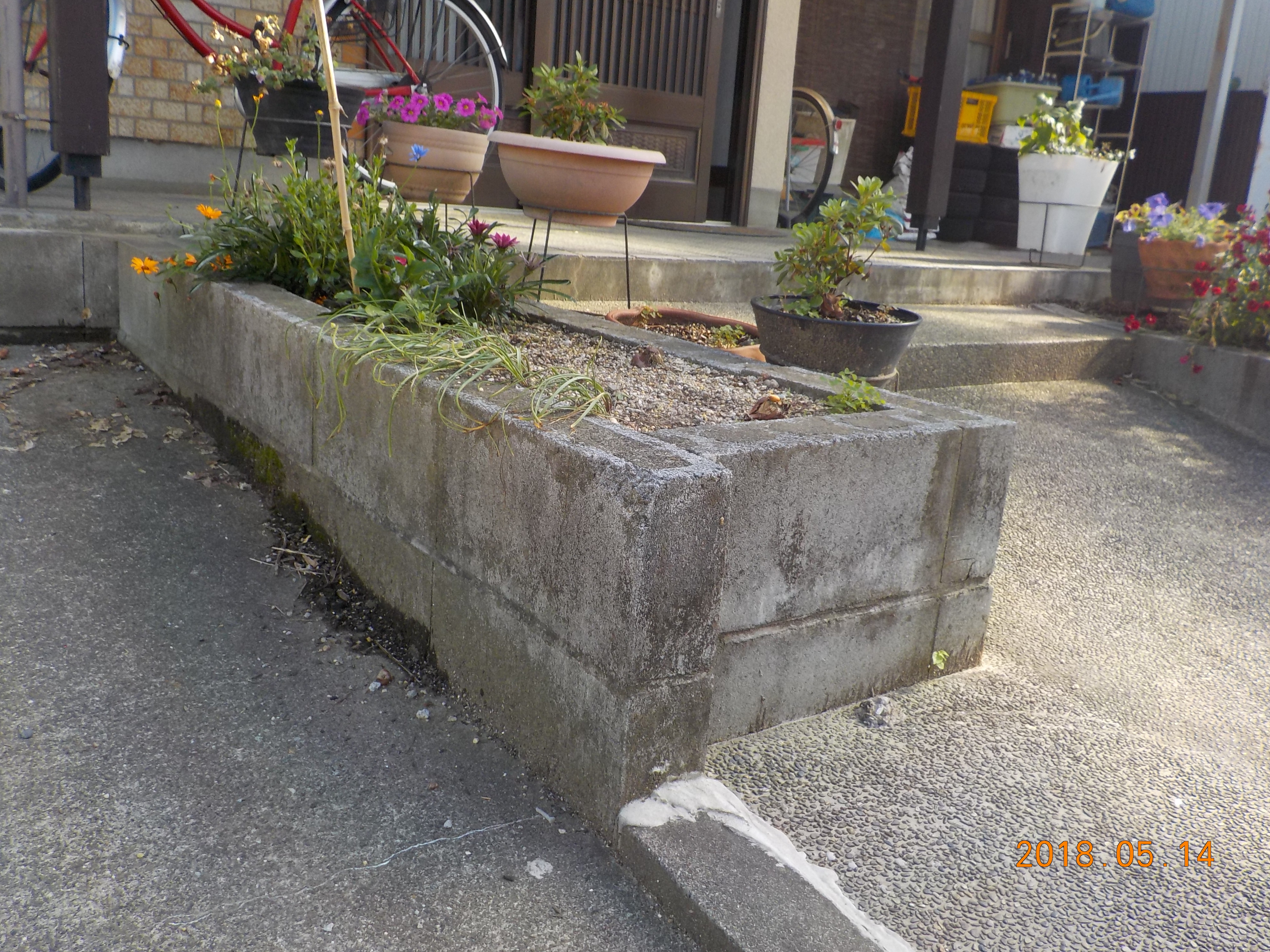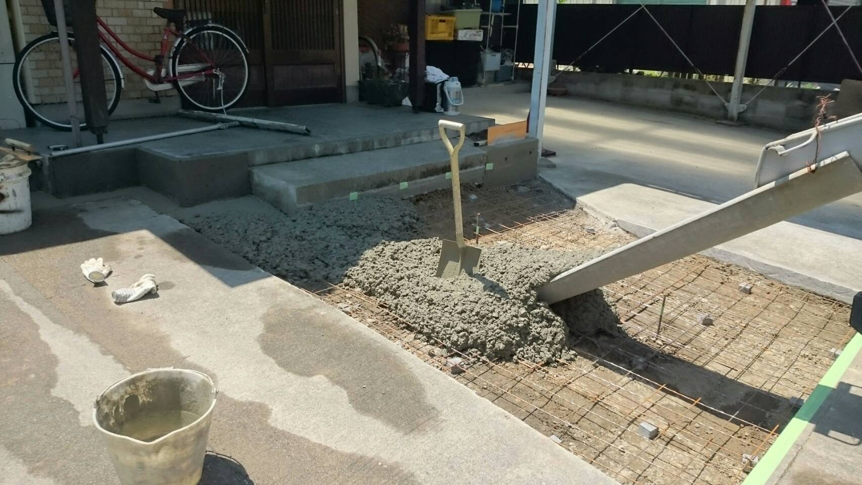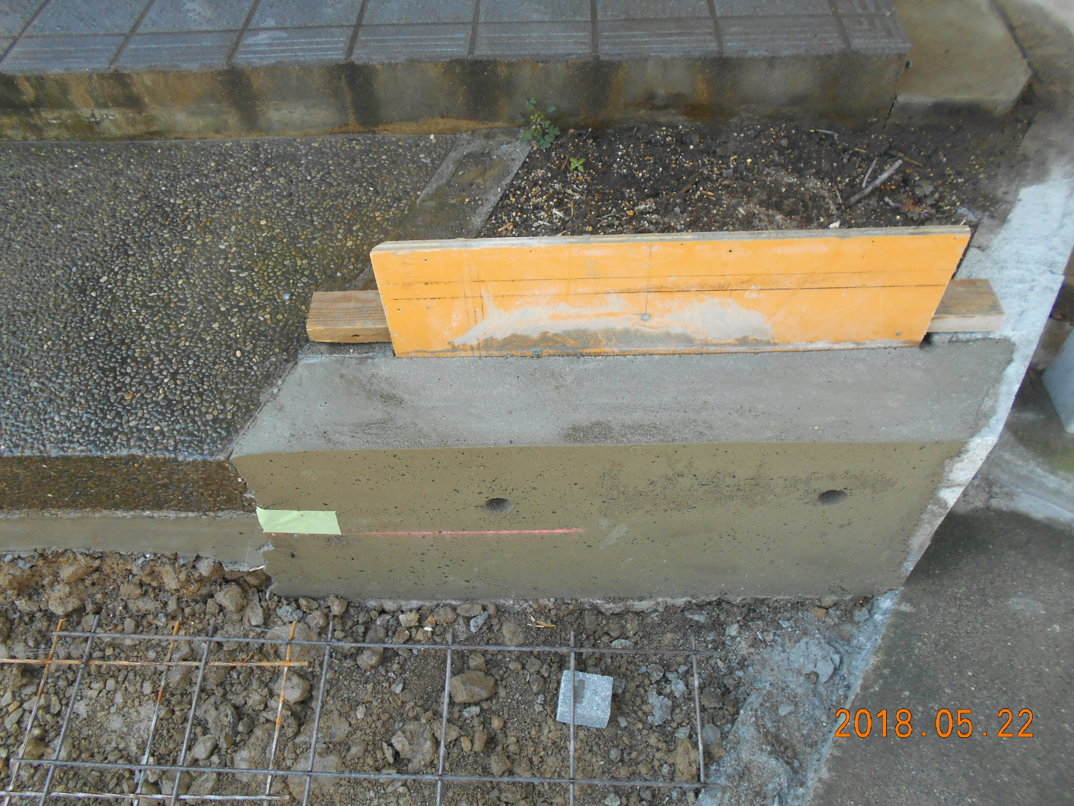 外構工事:アプローチ土間・CB撤去処分、残土処分、ハツリ・CB解体、階段壁補修、土間生コン打ち工事