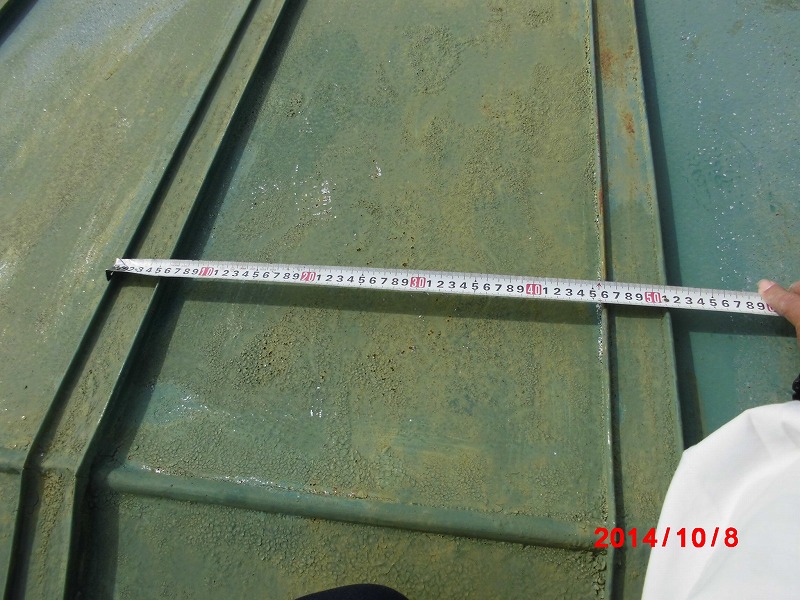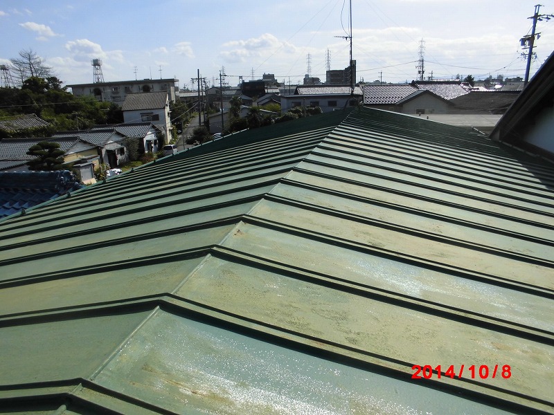 屋根塗装工事: 仮設足場架け払い・シート養生【124平方メートル】 ケレン工事(屋根) テラス屋根(足場設置のため) 屋根塗装工事(笠木なし瓦棒葺き) 下塗りサビ止め・中塗りシリコン・上塗りシリコン・北面垂直部分うら面、天面工事 軒樋 半丸105φ交換工事 集水器交換工事