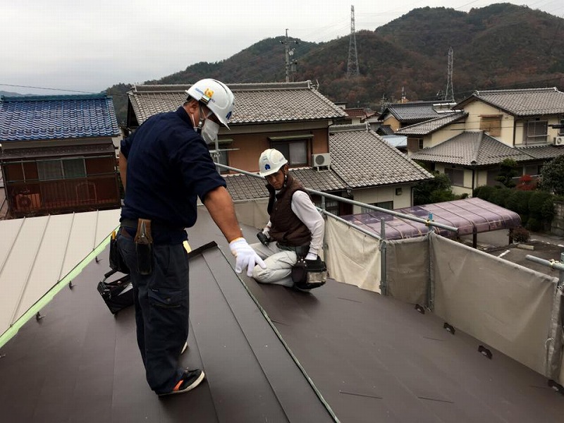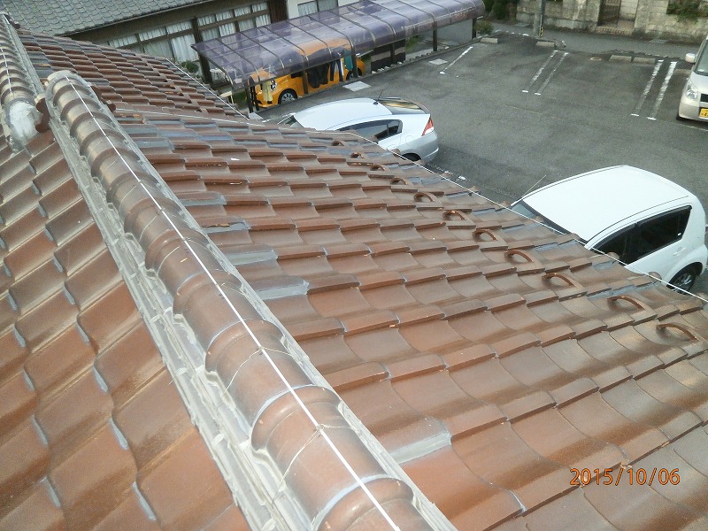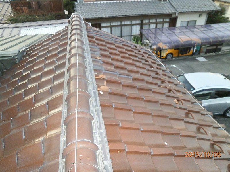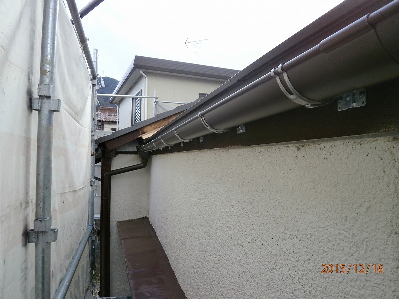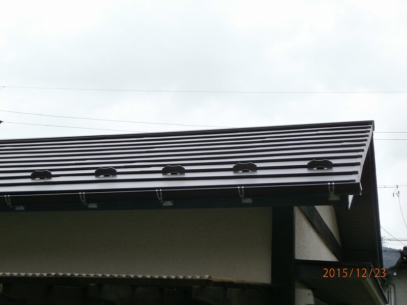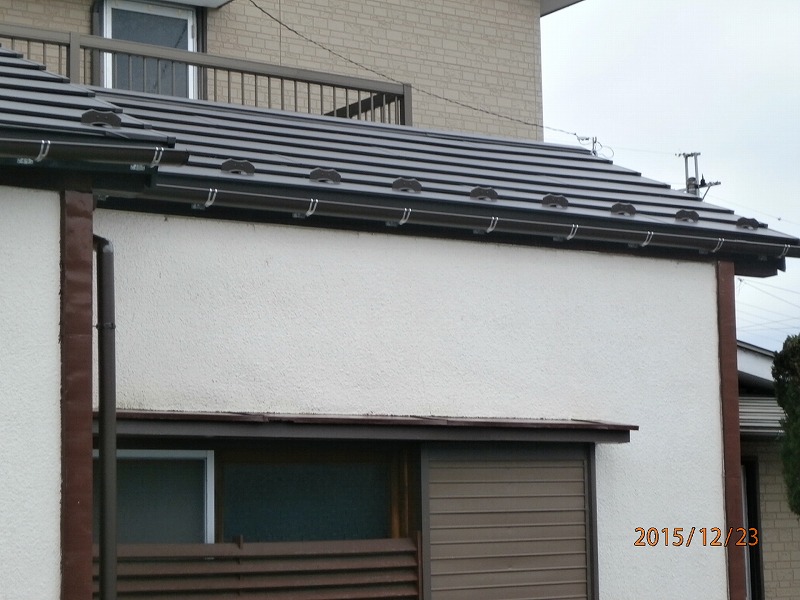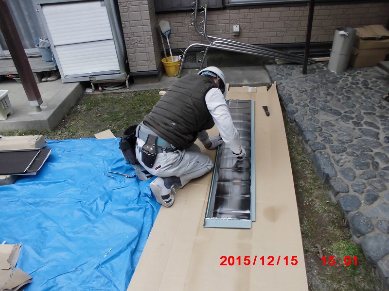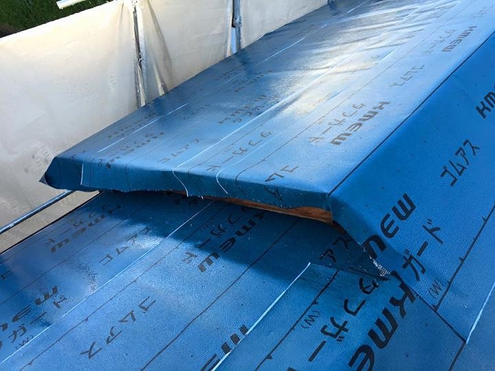 屋根葺き替え工事(平屋部) 仮設足場架け払い【84.0平方メートル】 屋根:既設瓦撤去処分【43.1平方メートル】 下地コンパネ大工工事【43.1平方メートル】 ゴムアスルーフィング【43.1平方メートル】 横暖ルーフa【43.1平方メートル】 棟(下地込み)【8.6メートル】 水切り【6.6メートル】 雪止め@450【40ヶ所】 雨樋:既設軒樋撤去処分【13.3メートル】 既設たて樋撤去処分【10.5メートル】 軒樋105架け替え金具共【13.3メートル】 たて樋60架け替え金具共【10.5メートル】 集水器【3個】