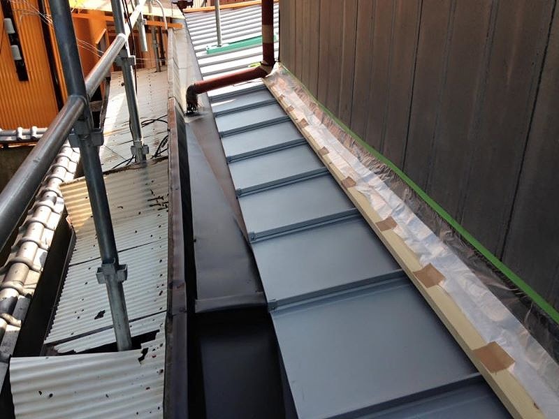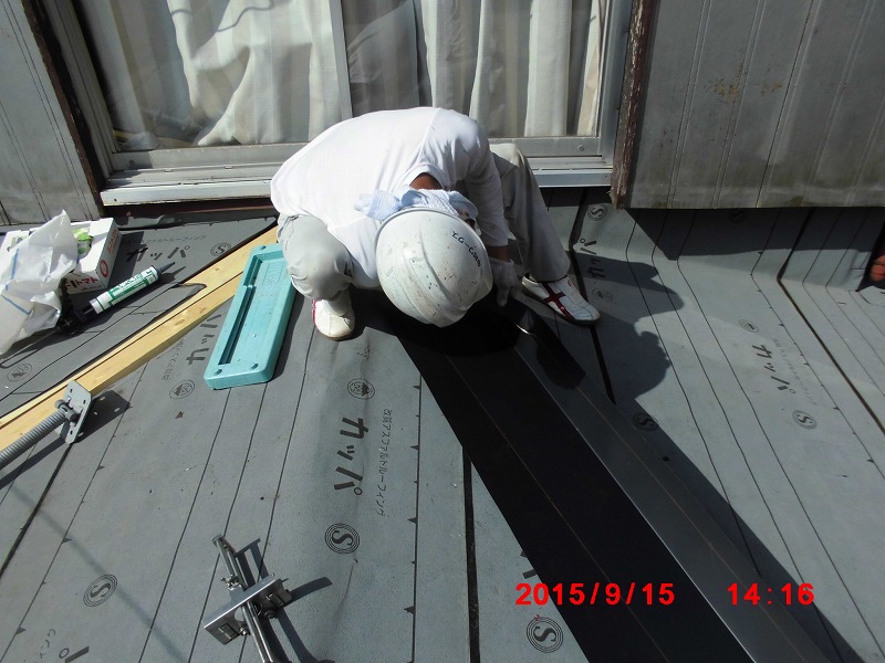 屋根葺き替え工事:仮設足場架け払い(1F西・南・東) ベランダ撤去処分 アンテナ脱着 室外機脱着 東面テラス張替え 東面 雨樋架け替え 軒樋半丸【9メートル】 たて樋【2メートル】 既設屋根瓦棒トタンめくり撤去処分 屋根木下地コンパネ・ゴムアスルーフィング・立平葺き【73.7平方メートル】 棟(下地込み)【23.5メートル】 下り台【4メートル】 水切り【11.2メートル】 谷樋【47メートル】 笠木【47メートル】 落とし口ドレン【10ヶ】