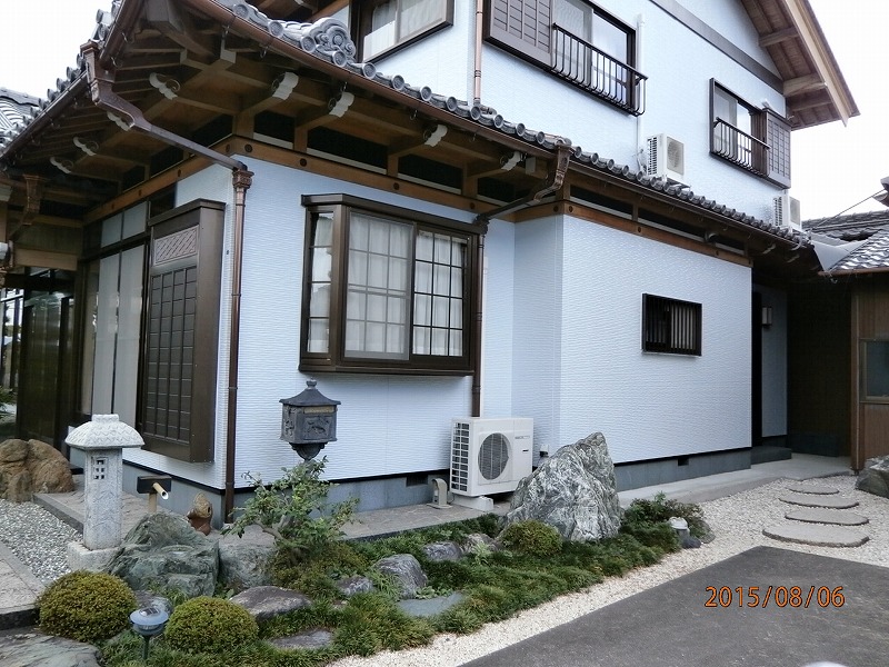 外壁塗装工事:仮設足場架け払い・シート養生【349平方メートル】 外壁塗装:高圧洗浄・下塗りシーラー・中塗り・上塗り【101.7平方メートル】 コーキング継部撤去【1式】 窓廻りコーキング増し打ち【164.4メートル】 継部コーキング打ち替え【51.1メートル】 雑部:破風板 ケレン・アク洗い【36.5メートル】 ポーチ柱・千本格子上下組み柱・千本格子 ケレン・アク洗い【1式】 玄関廻り・両妻1.2階破風板【27メートル】 透明保護材塗装【1式】 南玄関屋根・玄関上部段違い屋根先破風板 着色透明保護材【1式】 小口飾り 刷毛塗り【1式】 雨戸大19・小20 ウレタン塗装【1式】 鉄部 土台水切り・飾り帯板カバーウレタン塗装【1式】 窓廻りコーキング増し打ち【10.7メートル】 軒天塗装ケンエース2回塗り【3.7平方メートル】 下塗りシーラー・中塗り・上塗りフッ素塗装【5平方メートル程度】【1式】
