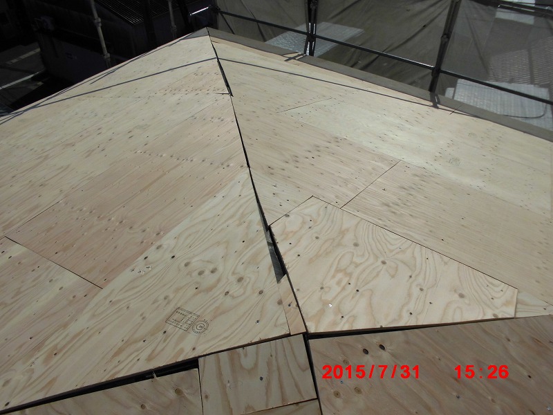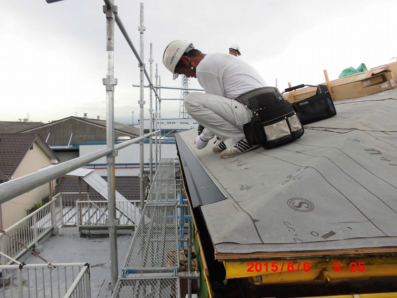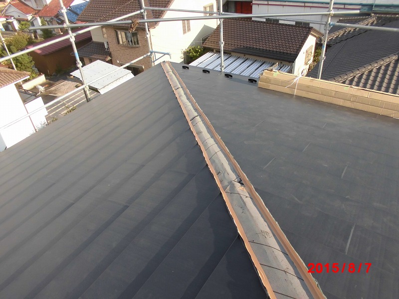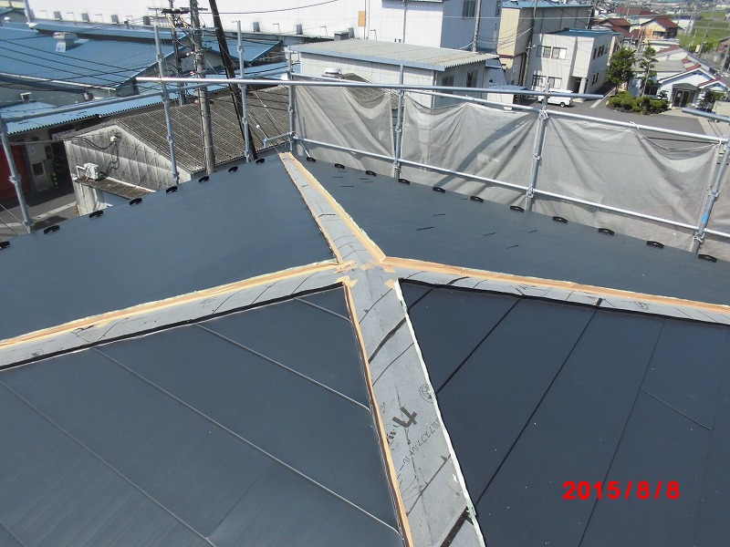屋根板金カバー工事:仮設足場架け払い・養生ネット無【291.6平方メートル】 屋根:既設屋根・清掃・役物撤去処分【1式】 屋根下地垂木コンパネ使用【87.7平方メートル】 防水ルーフィング【87.7平方メートル】 横緩ルーフきわみ【87.7平方メートル】 棟(下地込み)【29.3メートル】 唐草 軒先【34.2メートル】 雪止め【58ヶ所】 雨樋:既設軒樋撤去処分【34.2メートル】 軒樋パナソニックPC50(金具込み)【34.2メートル】 集水器【2個】