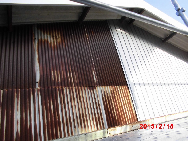 仮設工事:足場架け払い・既設軒樋・縦樋撤去処分【20.5メートル】 農器具庫屋根カバー工事:ガルバニウム折半葺【81.1平方メートル】 棟包み水上面戸エプロン面戸【11.8メートル】 ケラバ見切(ガルバニウム鋼板)【23.6メートル】 雪止め@450【38ヶ所】 軒樋新規設置【13.3メートル】 縦樋新規設置【7.2メートル】 落とし口【2ヶ所】 外壁トタン張替:外壁波トタンめくり処分【92.7平方メートル】 外壁ガルバニウム鋼板+ステンビス【92.7平方メートル】 下屋撤去・復旧