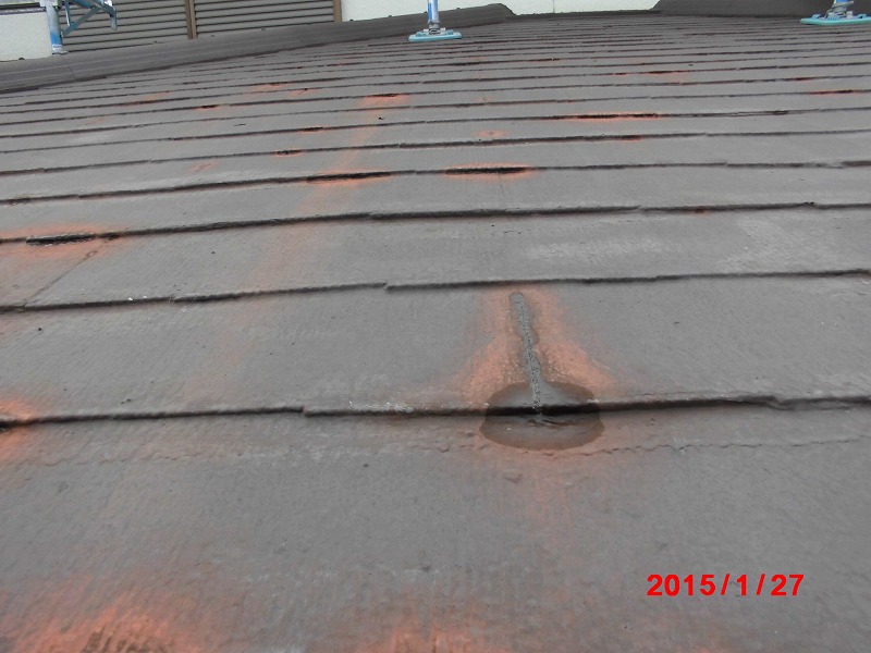 屋根ガルバニウム鋼板カバー工事:棟瓦・棟解体工事撤去処分【38メートル】 粘着ルーフィング張り【195.5平方メートル】 唐草【30.2】 ベランダ解体・戻し【1式】 ガルバニウム鋼板・ATルーフカバー工事【195.3平方メートル】 棟(木下地込み他事)【38メートル】 壁埋め戻しコーキング工事【30.2メートル】 水切り新設(木下地込み)【30.2メートル】 雪止め【167個】 軒先補修【1式】 新規アンテナ設置工事【1式】 雨樋架け替え・軒天貼り工事:仮設足場架け払い【250平方メートル】 樋:既設雨樋撤去処分【74.3メートル】 既設縦樋撤去処分【37.2メートル】 軒樋パナソニックPC50(金具込み)【74.3メートル】 たて樋60(金具込み)【37.2メートル】 集水器【9個】 軒天:ケイ酸カルシウム板 塗装:破風板塗装2回塗り スノコ交換