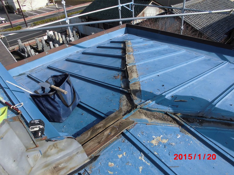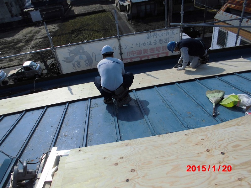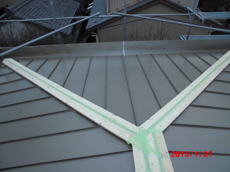 屋根工事:仮設足場架け払い【1式】 板金:コンパネ重ね貼り工事・防水ルーフィング貼り・たて平GL貼り【44.5平方メートル】 水上水切り【6.6メートル】 棟カバー板金【9.9メートル】 垂木打ち手間共【1式】 谷樋板金【26メートル】 大屋根笠木巻き板金【26メートル】 大屋根・破風板板金巻き【26メートル】 下屋根・ポーチ板金巻き【11メートル】