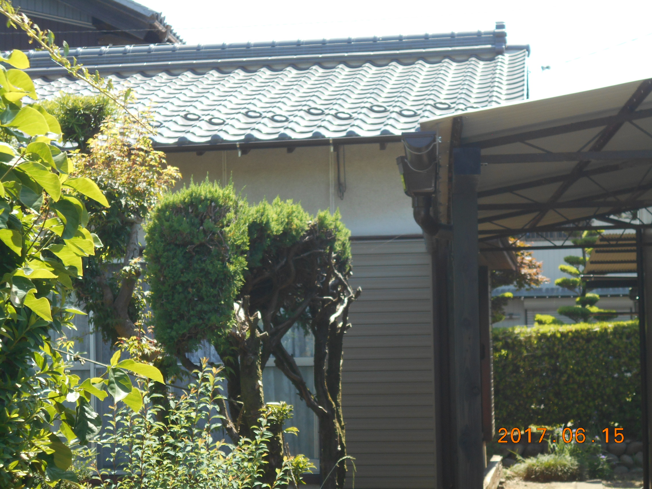 仮設足場架け払い 既設瓦撤去処分費【63.7?】 下地コンパネ【63.7?】 ゴムアスルーフィング【63.7?】 陶器瓦(和瓦)葺き【63.7?】 棟(下地込み)オール南蛮漆喰 軒樋半丸105【20.4m】 たて樋【8m】 集水器【2個】