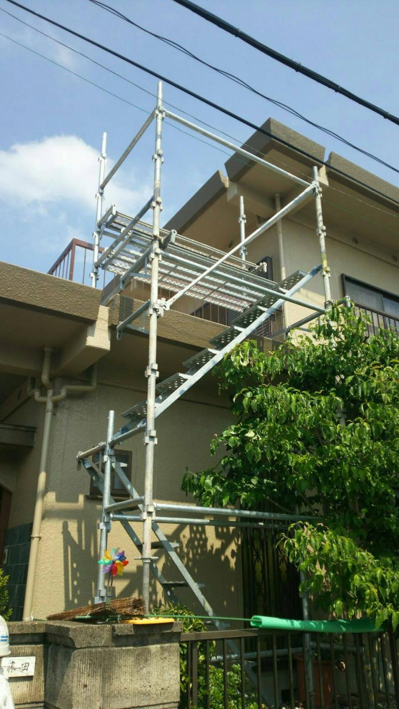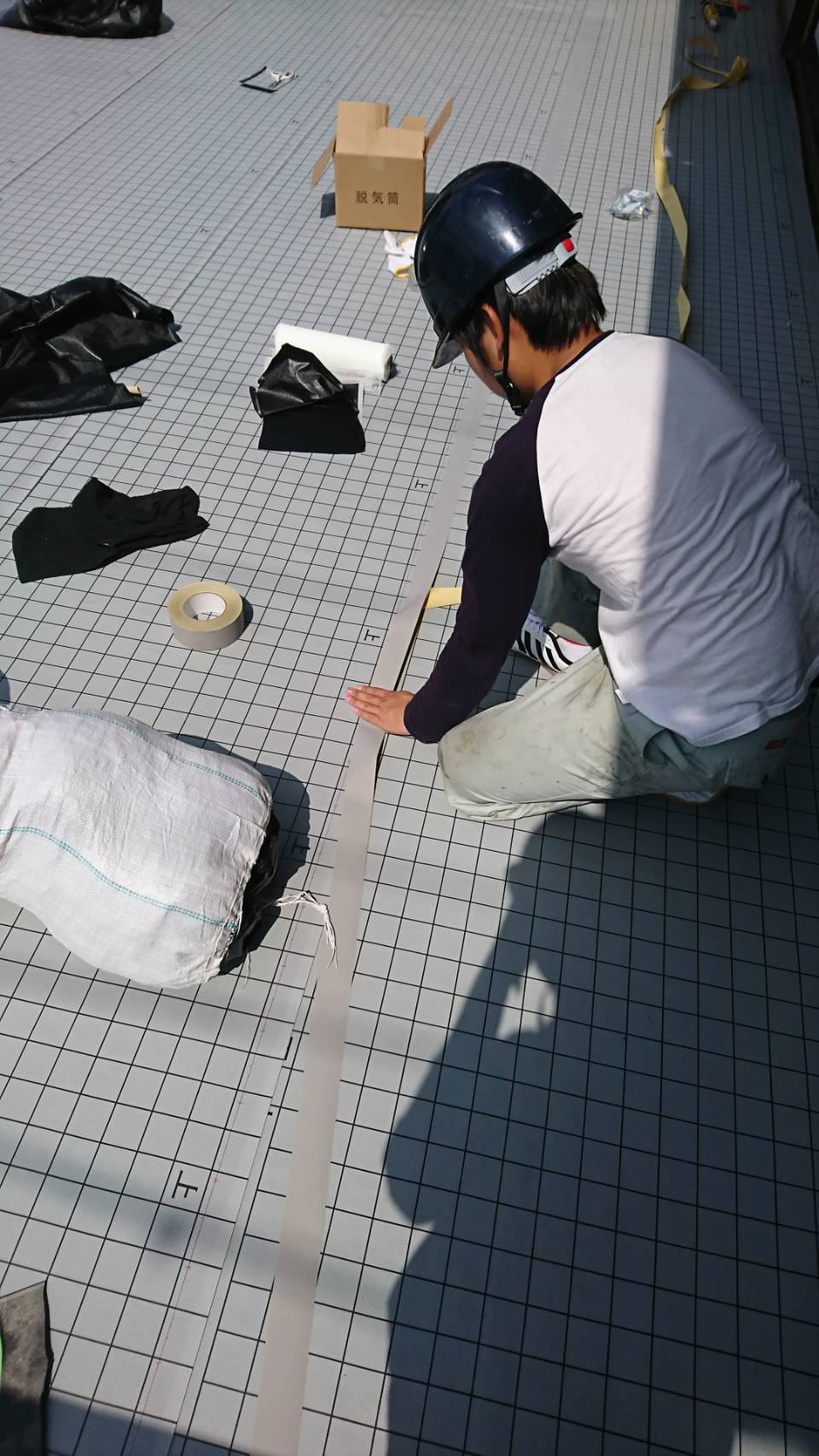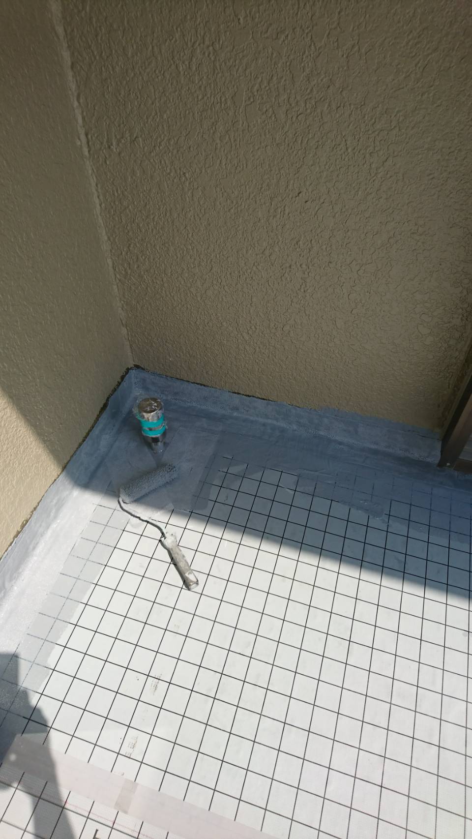 ベランダ防水工事 ベランダ:既存防水層不良部撤去、廃材処理【26.0?】 下地処理カオチン系【26.0?】 立面下地処理カオチン系【13.0?】 ウレタン塗膜防水、通気緩衝工法【29.0?】 脱気筒取付け【1基】 端末金物取付(シール共)【13.0m】 他端末コーキング処理【10.0m】 昇降足場汲み立て【1式】 室外機脱着【1式】