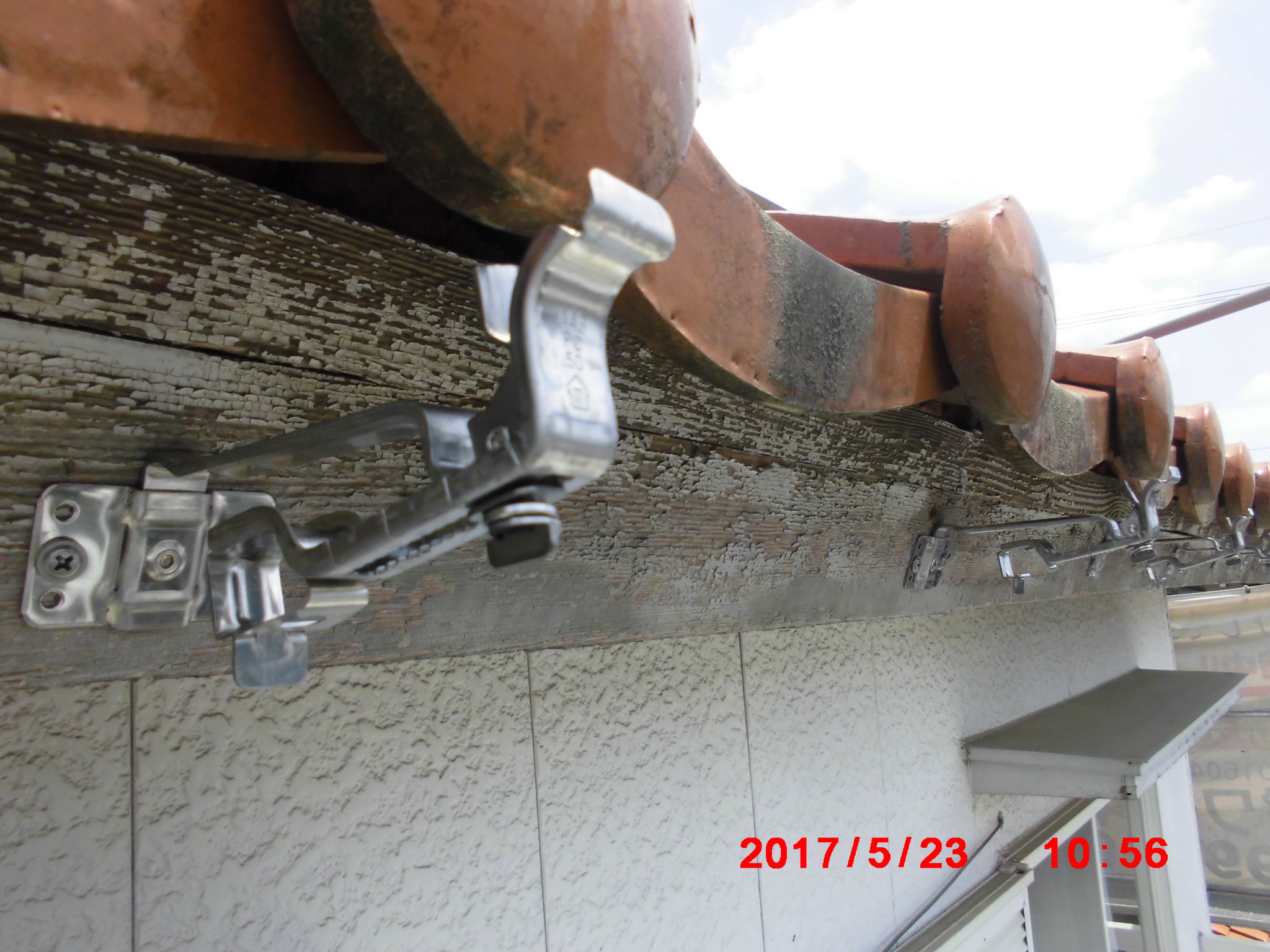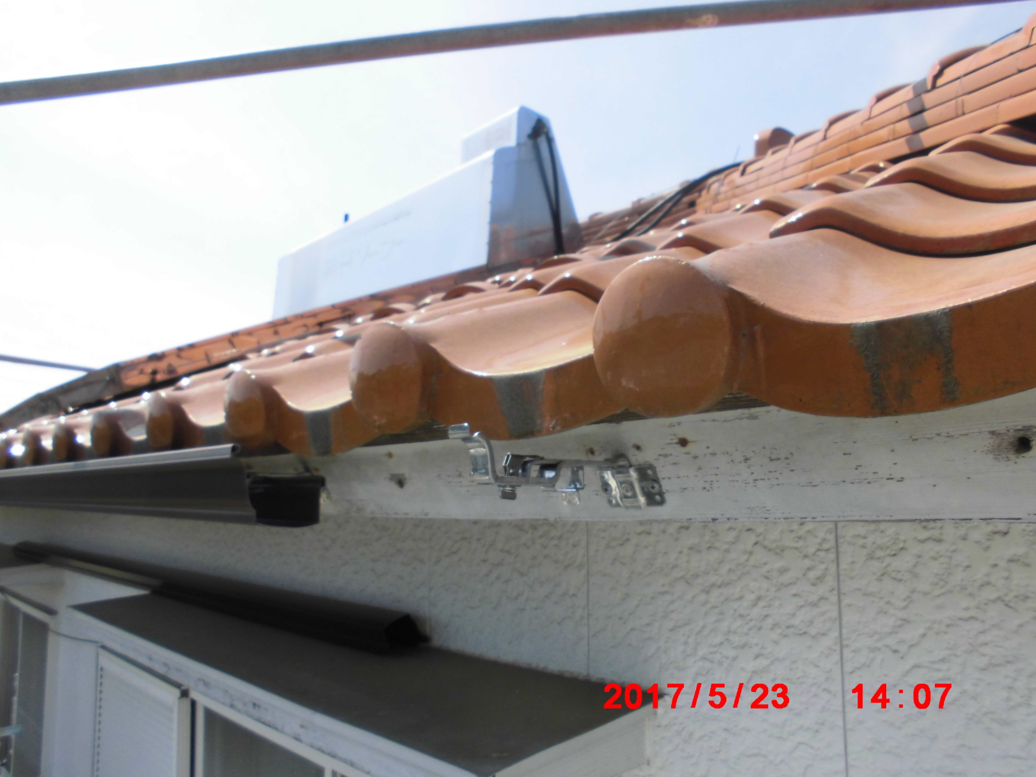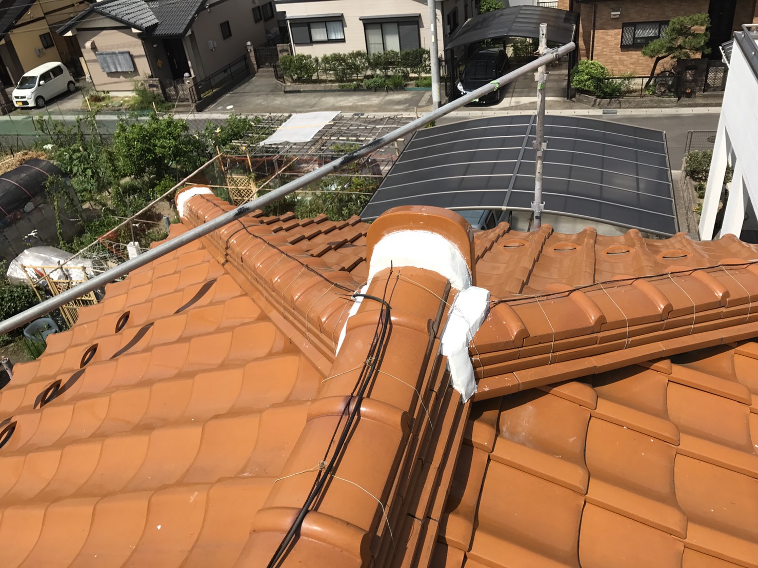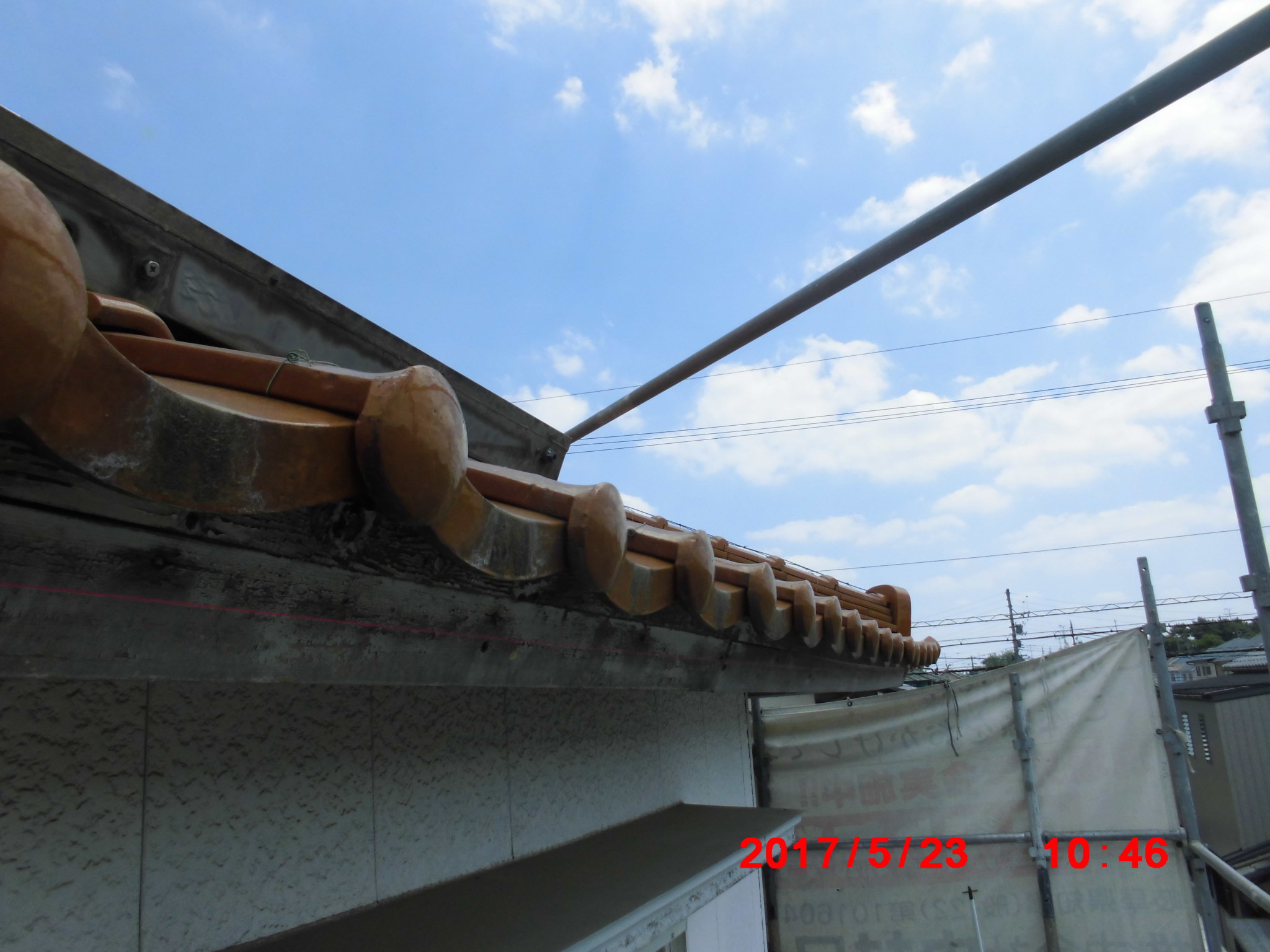 仮設足場架け払い 既設樋処分、撤去【90.1m】 軒樋角PC50金具込【56.1m】 たて樋丸60金具込【36m】 玄関上 軒天 ピーリング工事 テラス張替【12?】 大屋根漆喰補修工事 既設漆喰ハツリ工事【1式】 棟下三日月漆喰塗り【26ヶ所】 下がり棟下三日月漆喰塗り【80ヶ所】 鬼巻き【6ヶ所】