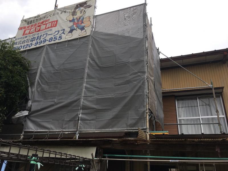 仮設:北南(西部)仮設足場掛け払い 既設戸袋(大2、中3)撤去、処分 戸箱撤去あと木下地 角波GL【62?】 役物(コーナー材) 軒天リブトタン【18m】 庇、軒天リブトタン【3.5?】 屋根(東):ケレン、サビ止め、シリコン塗装【34?】 テラス:既設テラス撤去 木製テラス7m×1.4m 柱防腐剤塗布