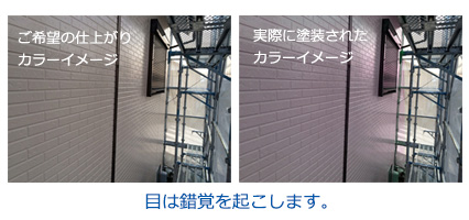 外壁塗装で多いトラブルの一つに「イメージと違う」といったことがあります。色のサンプルを見せてもらって決めることになることが多いのですが、サンプルを完全に信用してはいけないのです。