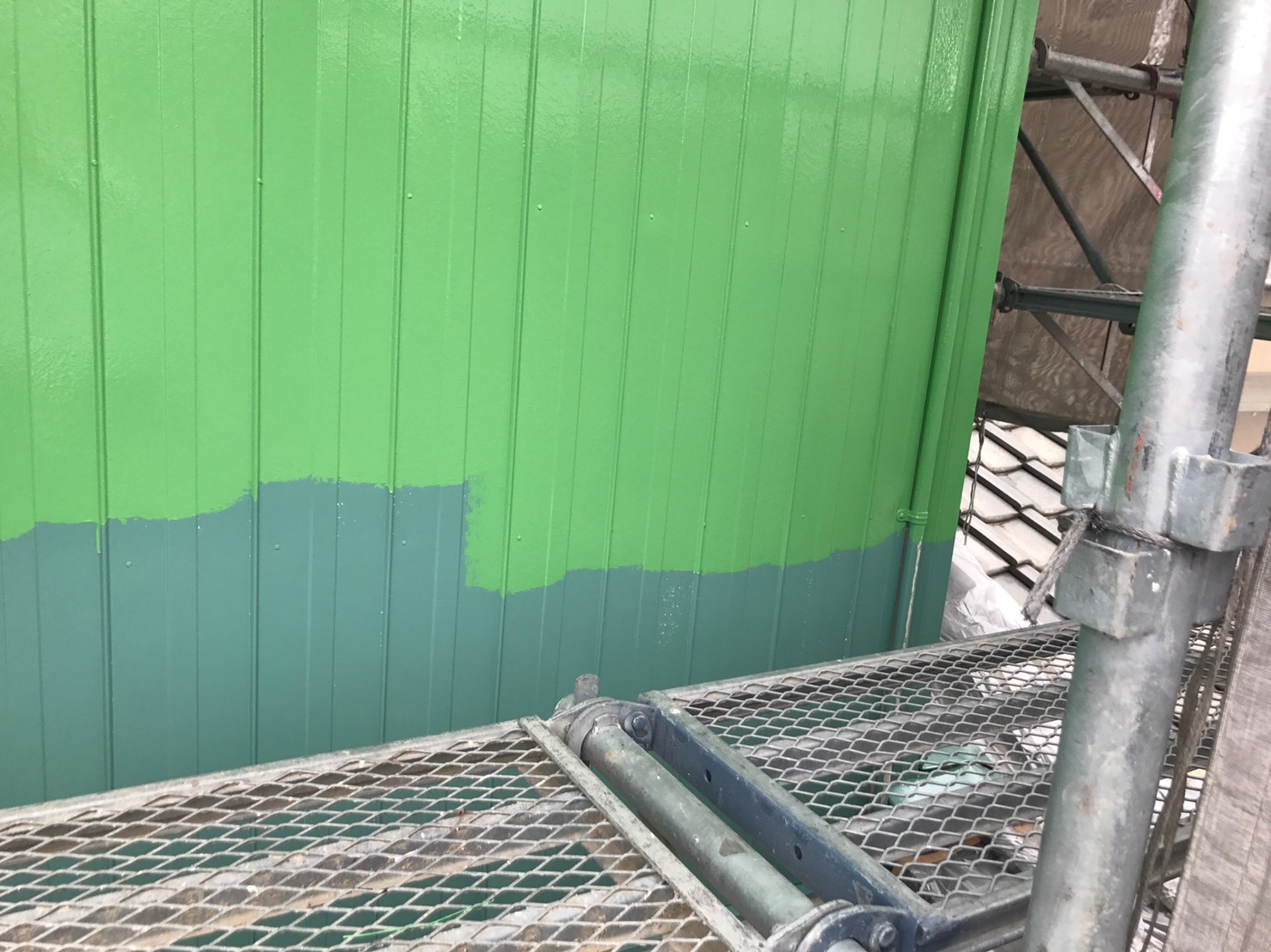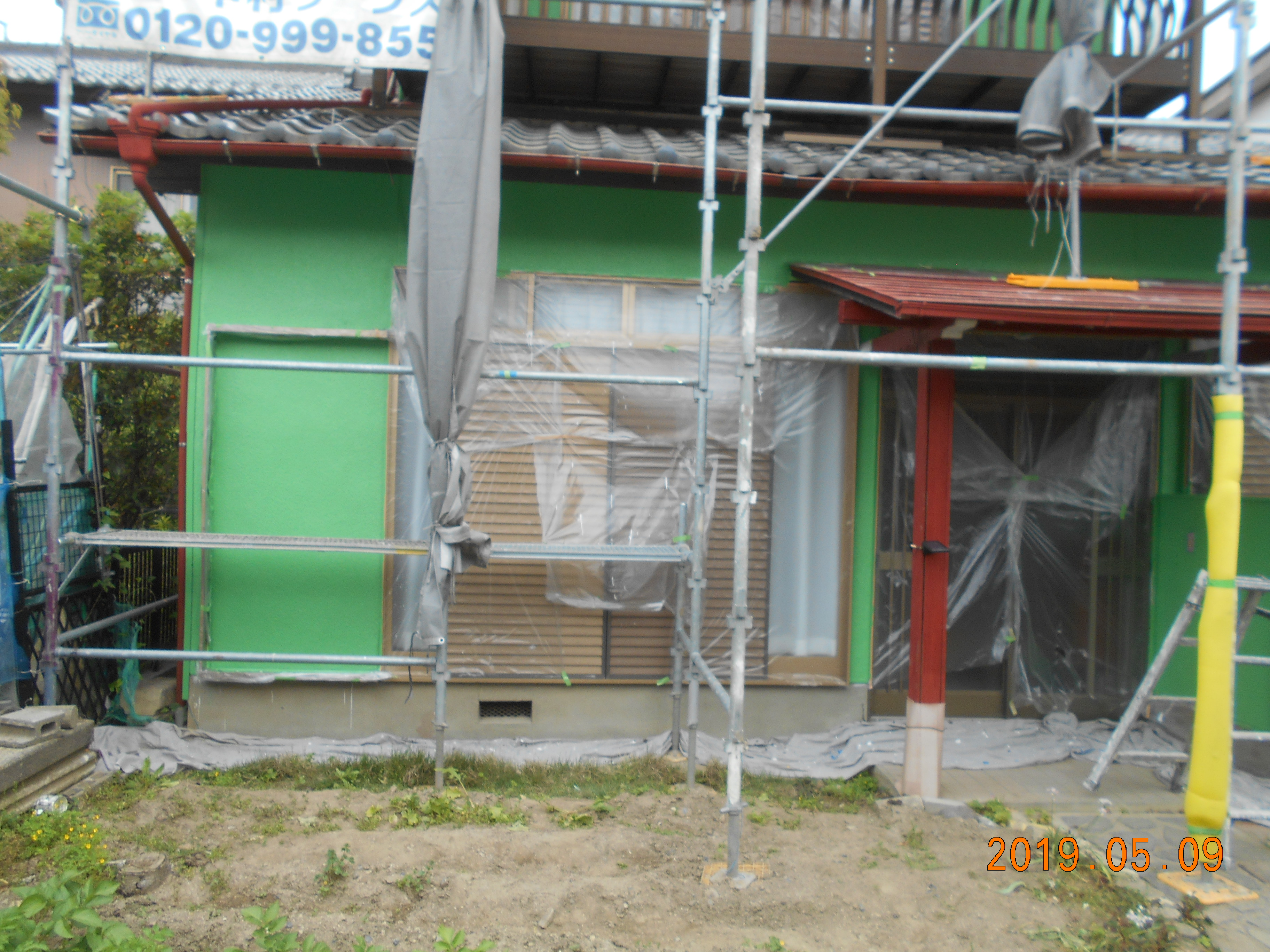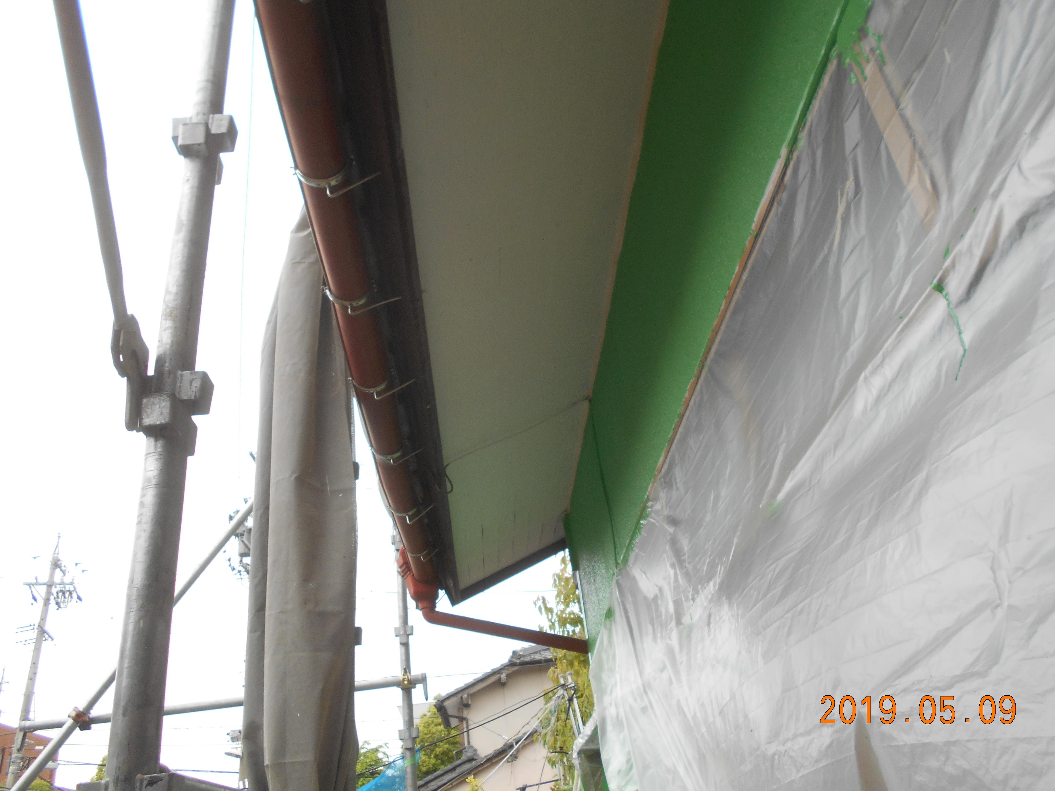 南面:仮設足場架け払い 高圧洗浄 下塗りフィラー 中塗りシリコン 上塗りシリコン 日本ペイントファインsi