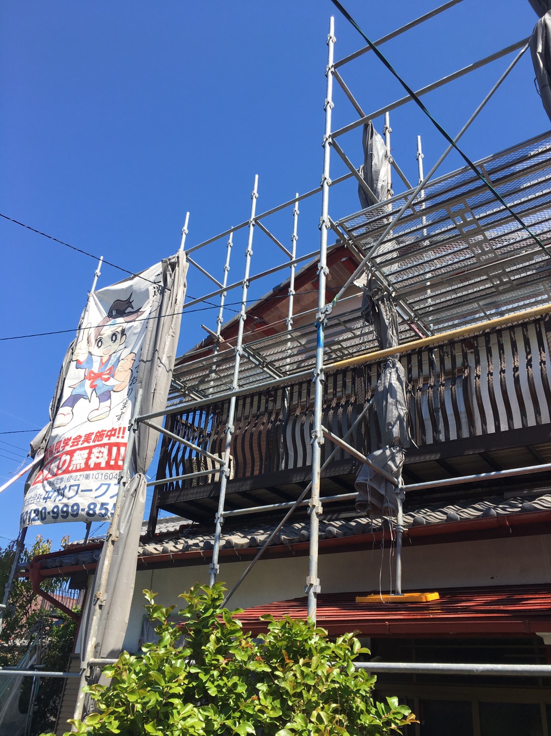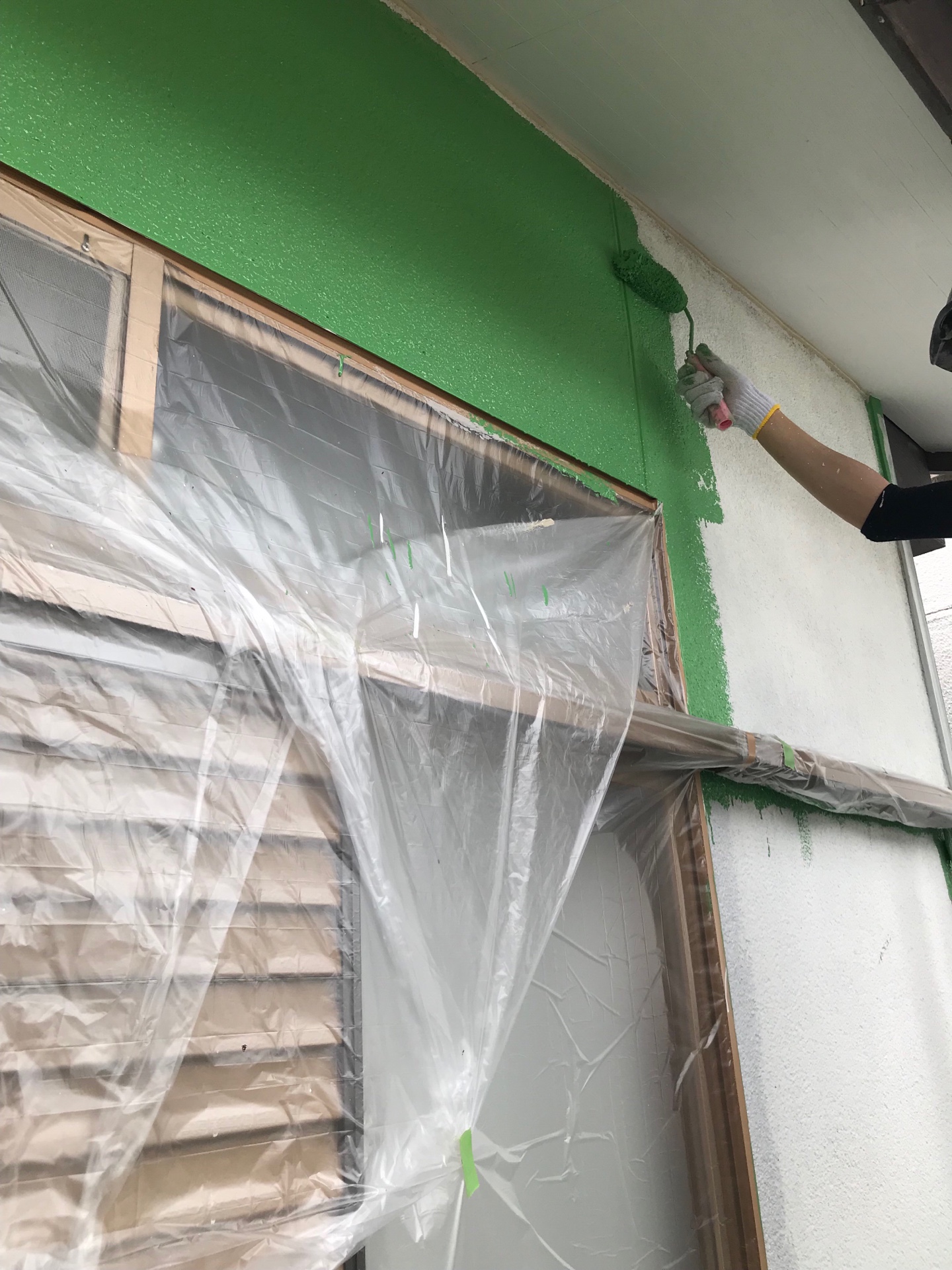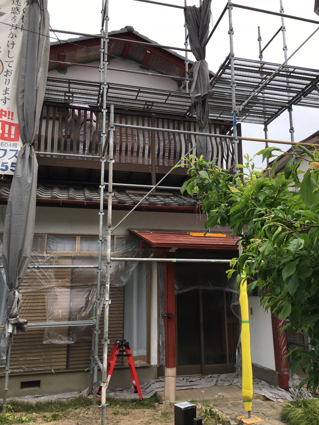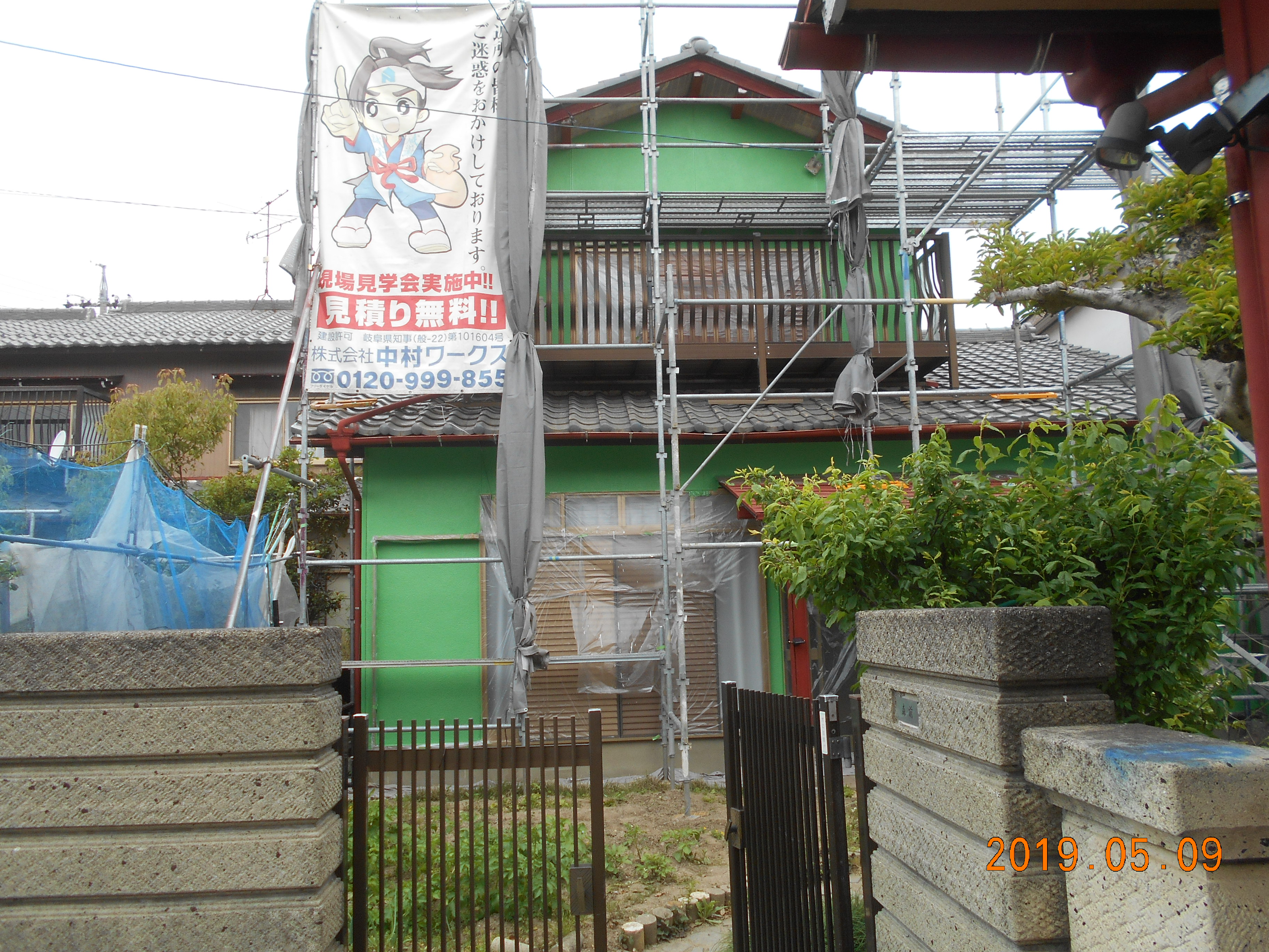 南面:仮設足場架け払い 高圧洗浄 下塗りフィラー 中塗りシリコン 上塗りシリコン 日本ペイントファインsi