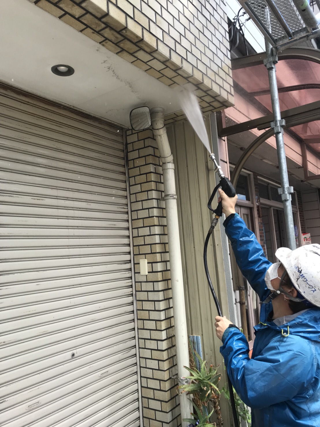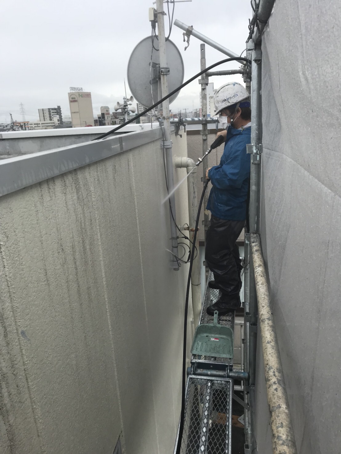 仮設足場架け払い、高圧洗浄、下塗り、中塗り、上塗り、コーキング補修、VU管シリコン塗装、シャッター塗装 屋上PH:既設防水層撤去、処分、下地処理、ウレタン塗装防水、改修用ドレン、端末コーキング ベランダ内部塗装、軒天塗装