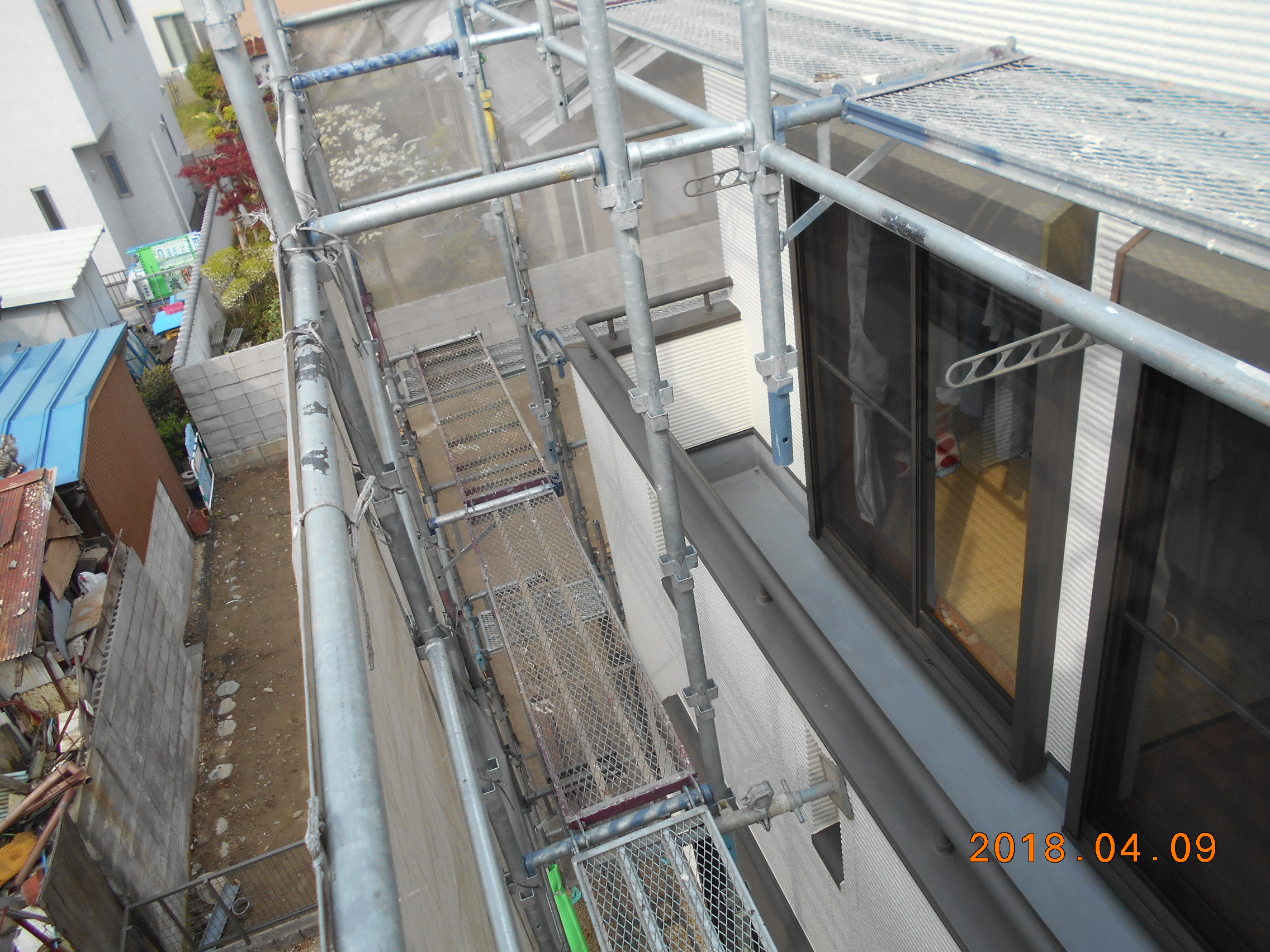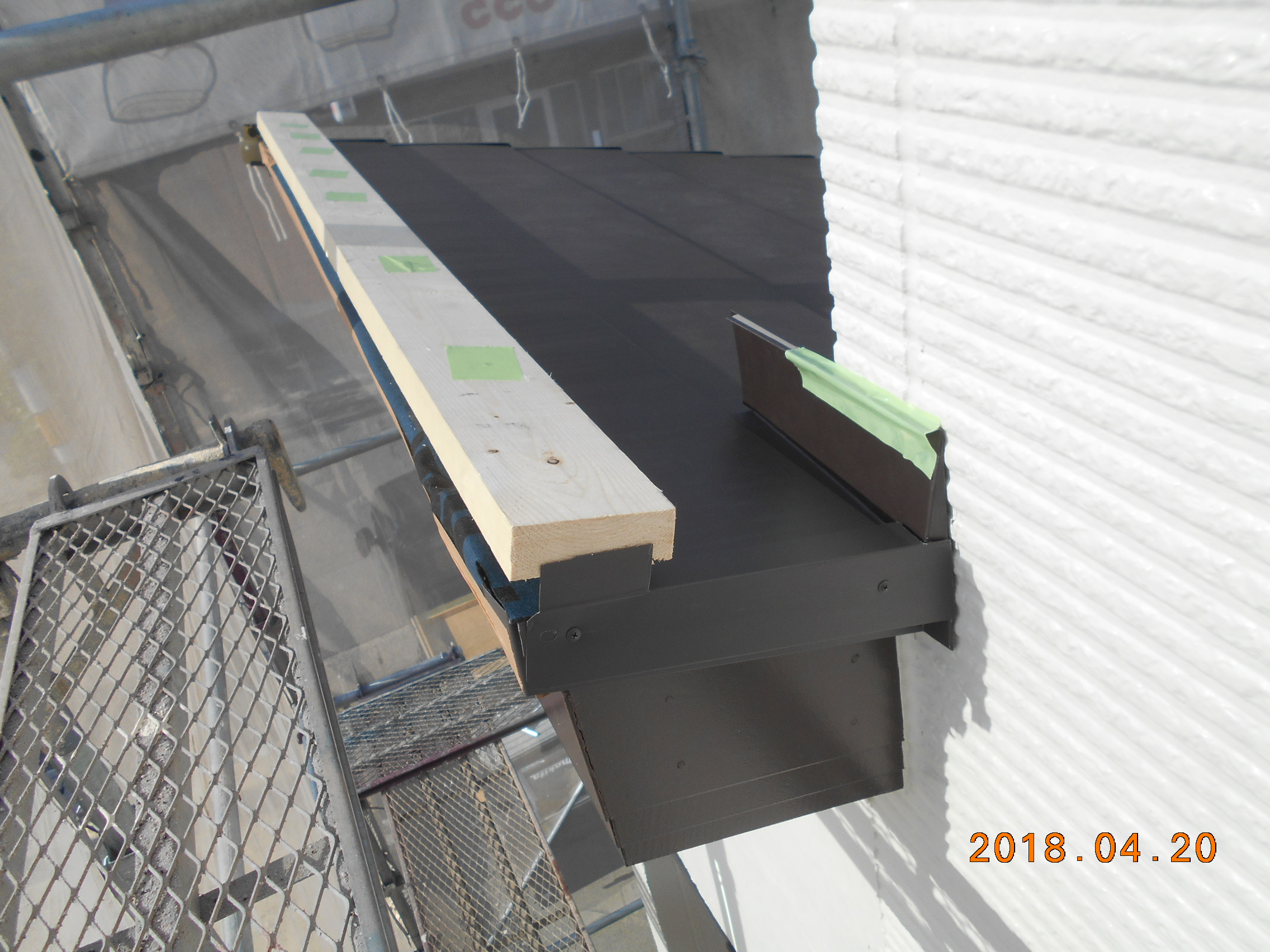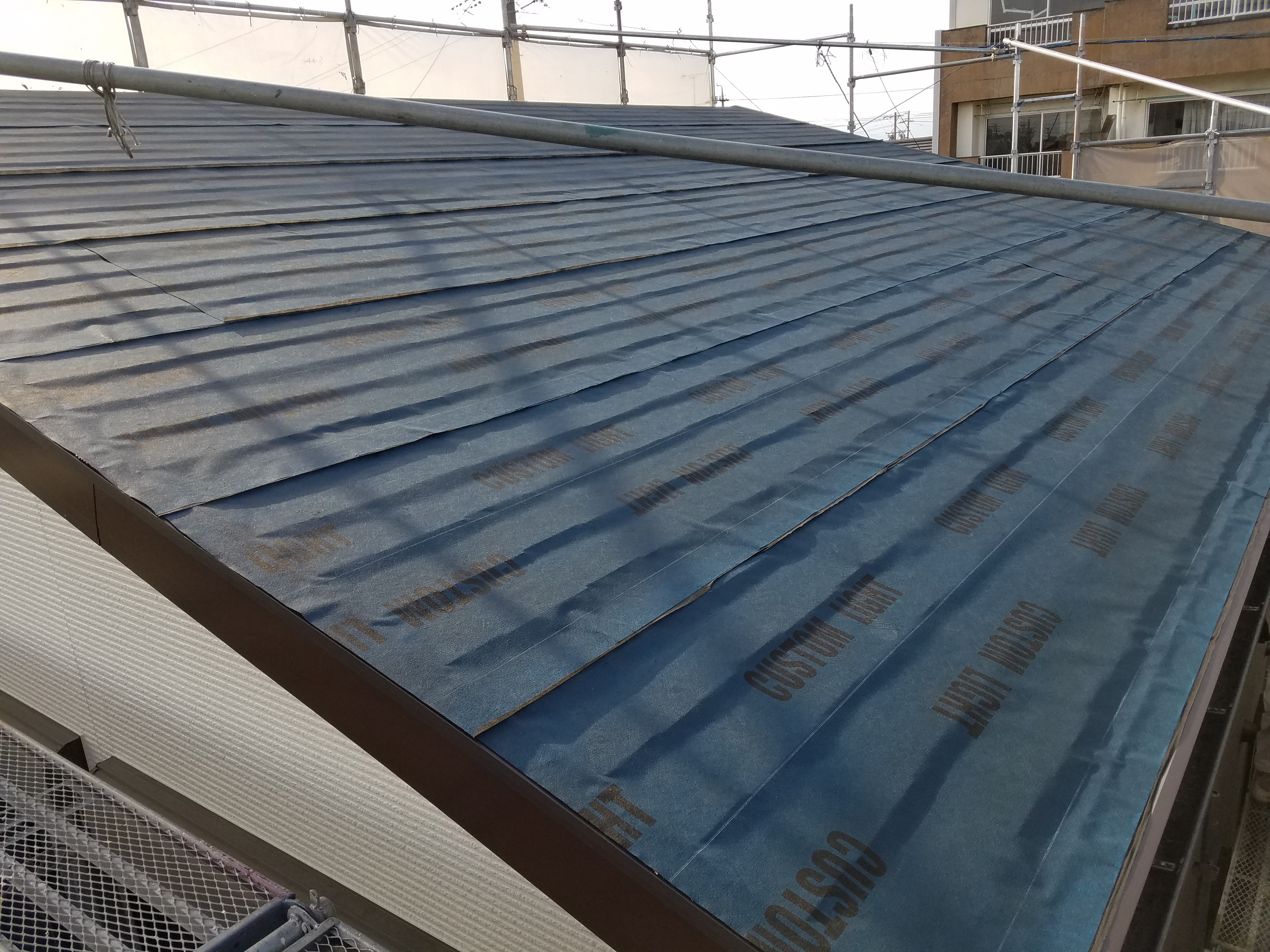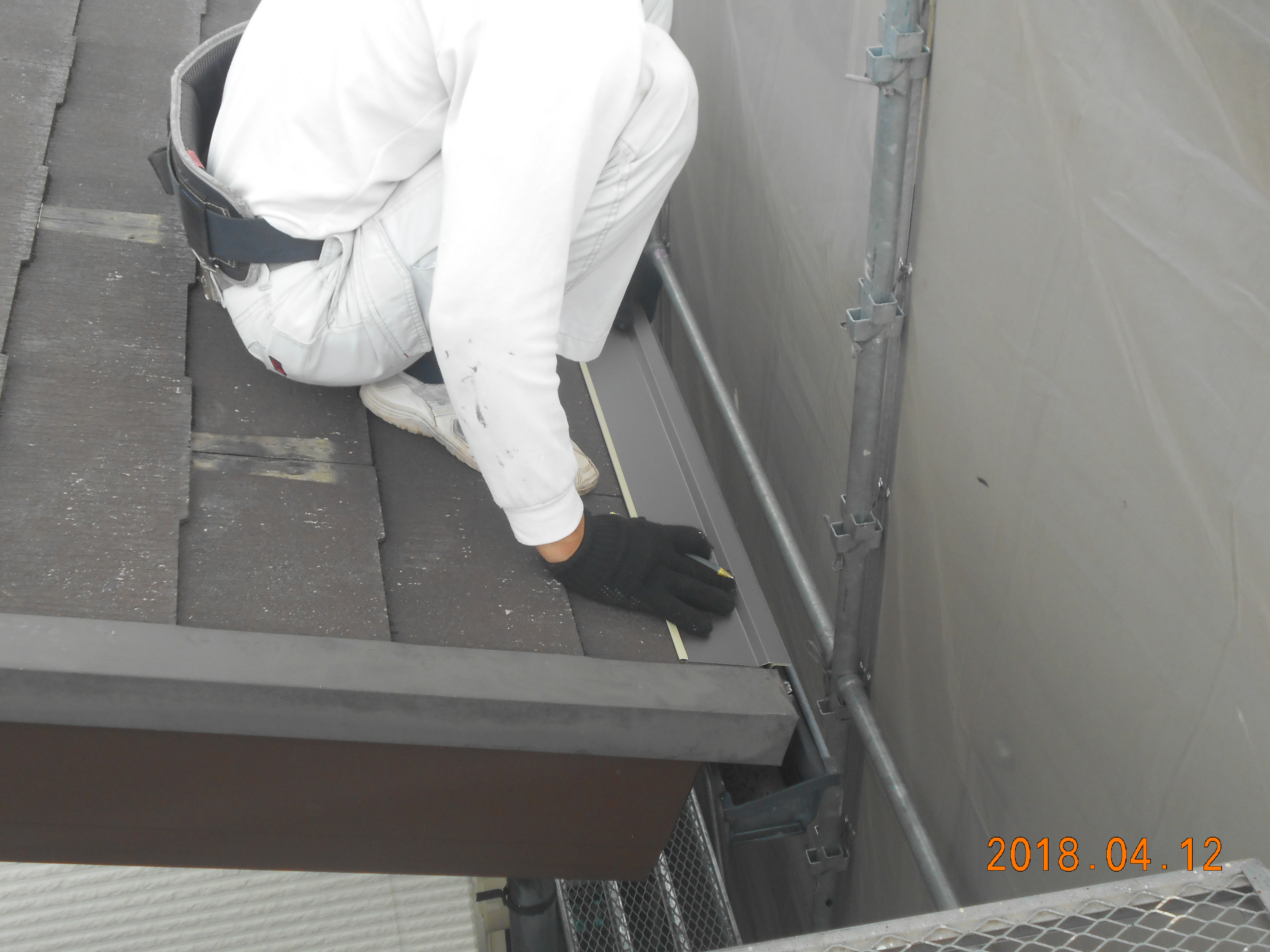 玄関引違い戸取替工事、ベランダ防水改修工事、屋根葺き替え工事:仮設足場架け払いシート養生、屋根:既設屋根清掃、役物撤去、粘着ルーフィング、横暖ルーフSガルバリウム鋼板、雪止め、水切り、雨樋:既設軒樋、呼び樋撤去、処分。軒樋、呼び樋、集水器