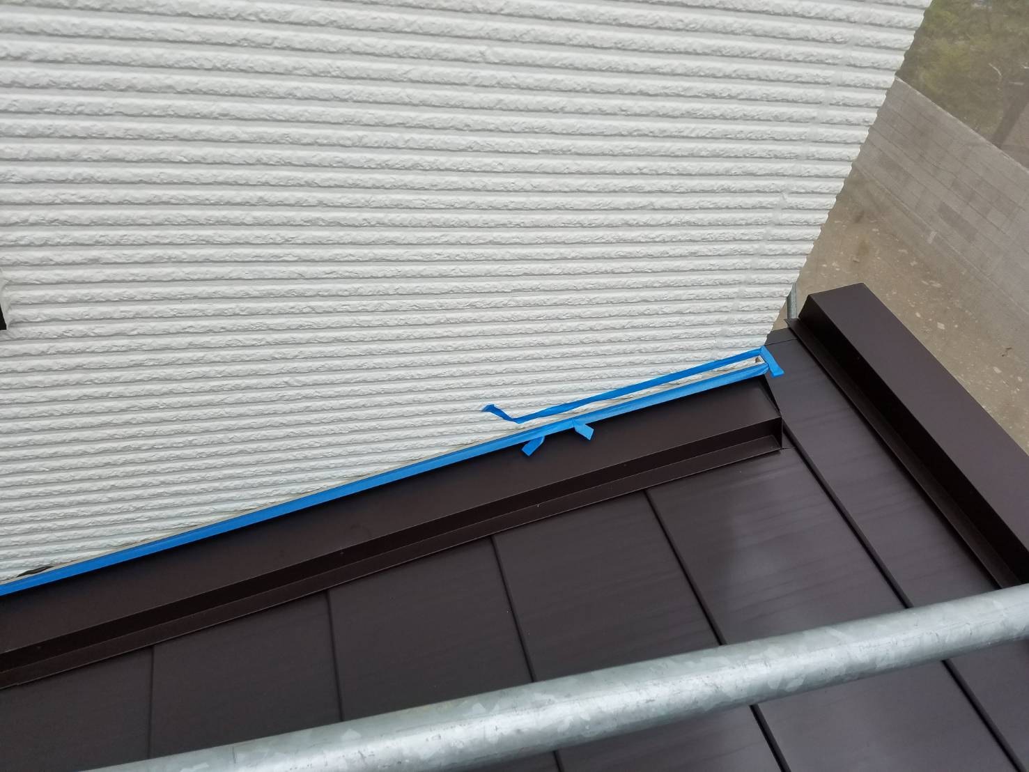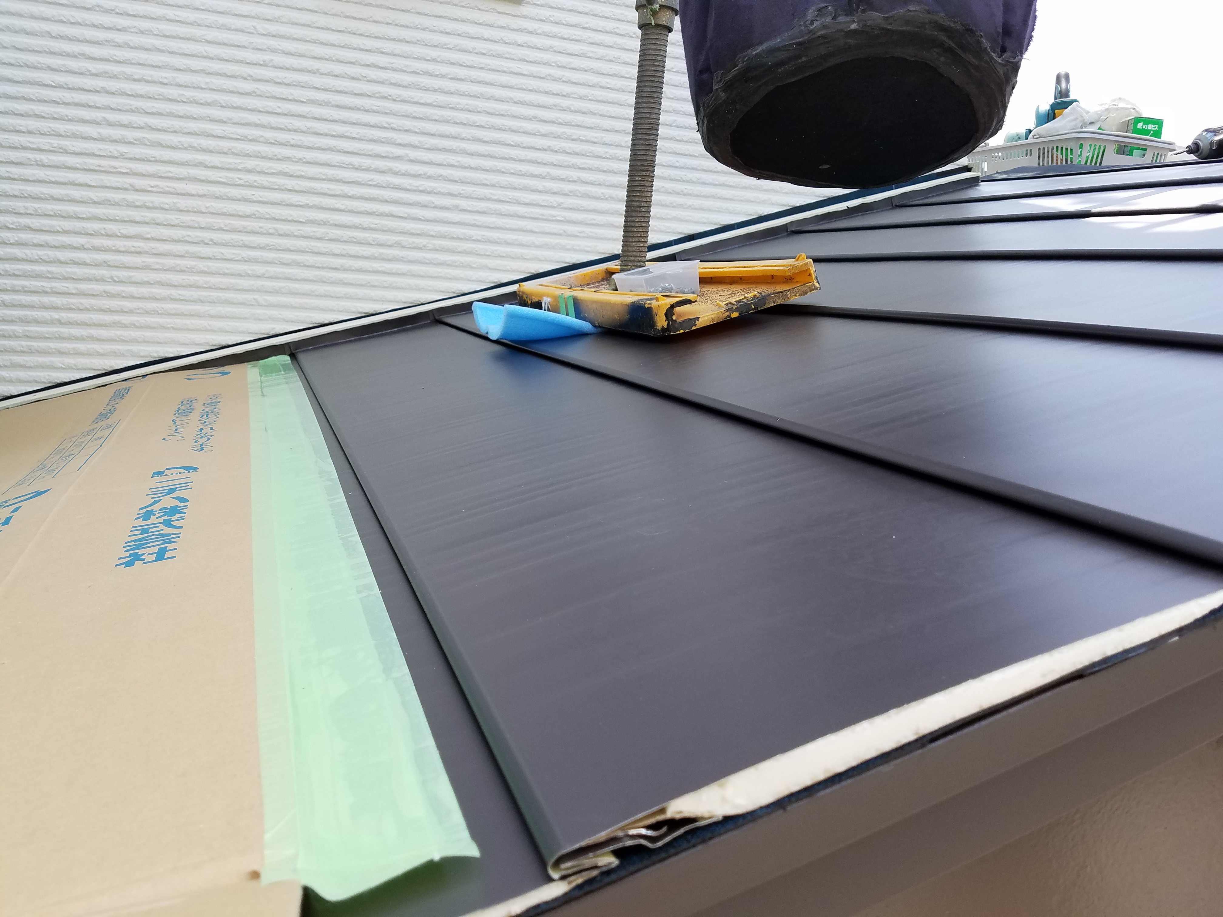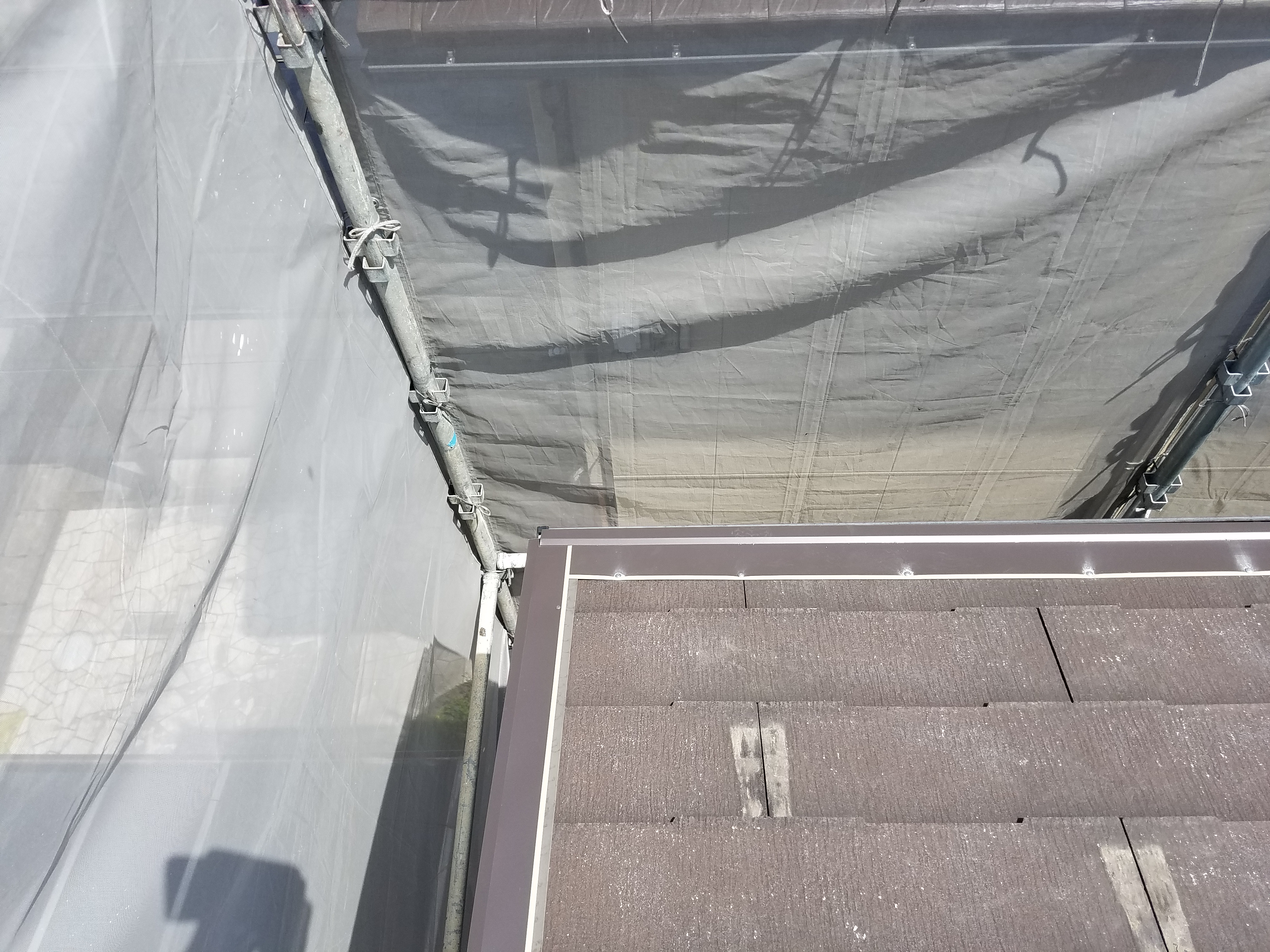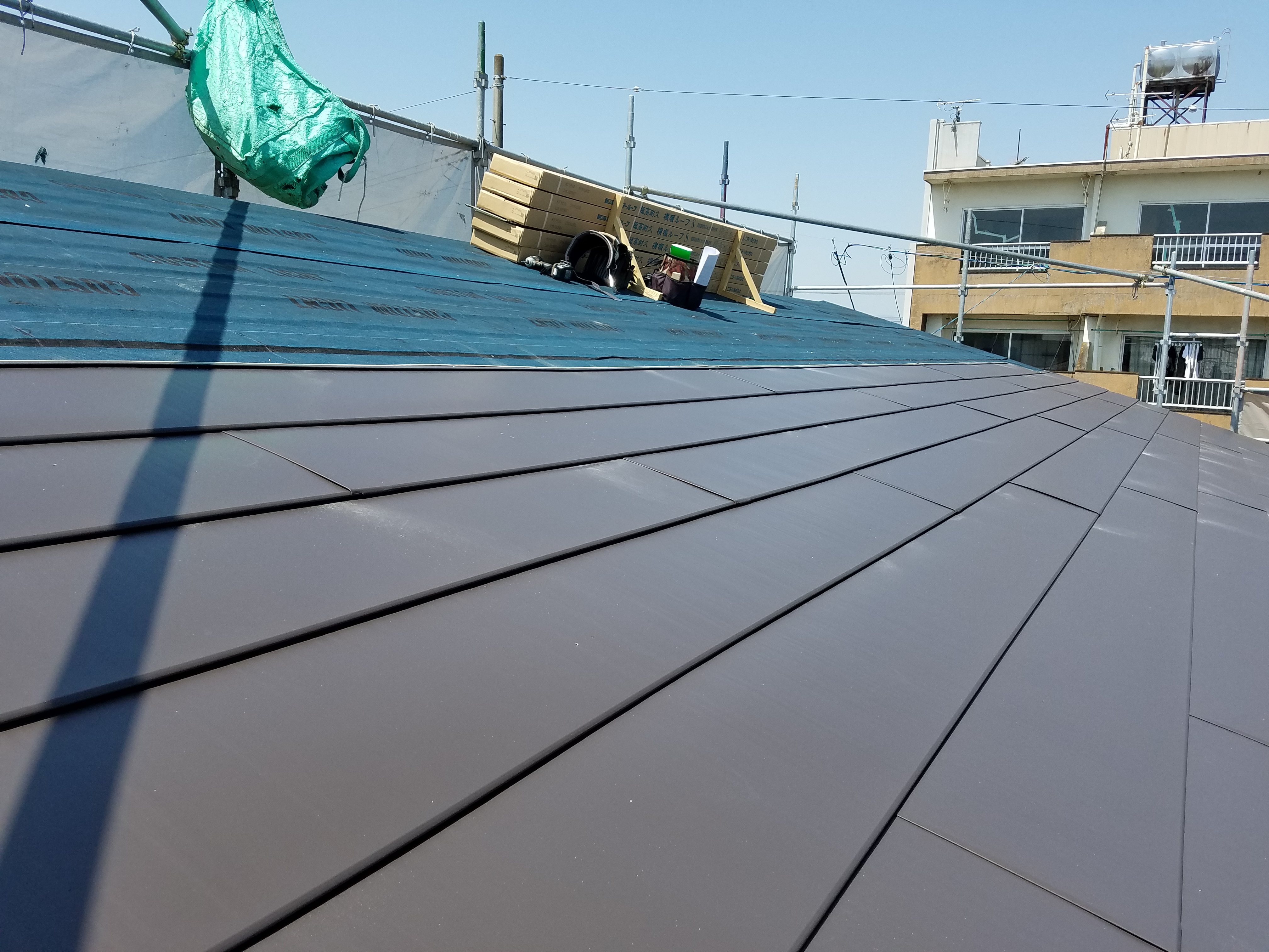 玄関引違い戸取替工事、ベランダ防水改修工事、屋根葺き替え工事:仮設足場架け払いシート養生、屋根:既設屋根清掃、役物撤去、粘着ルーフィング、横暖ルーフSガルバリウム鋼板、雪止め、水切り、雨樋:既設軒樋、呼び樋撤去、処分。軒樋、呼び樋、集水器